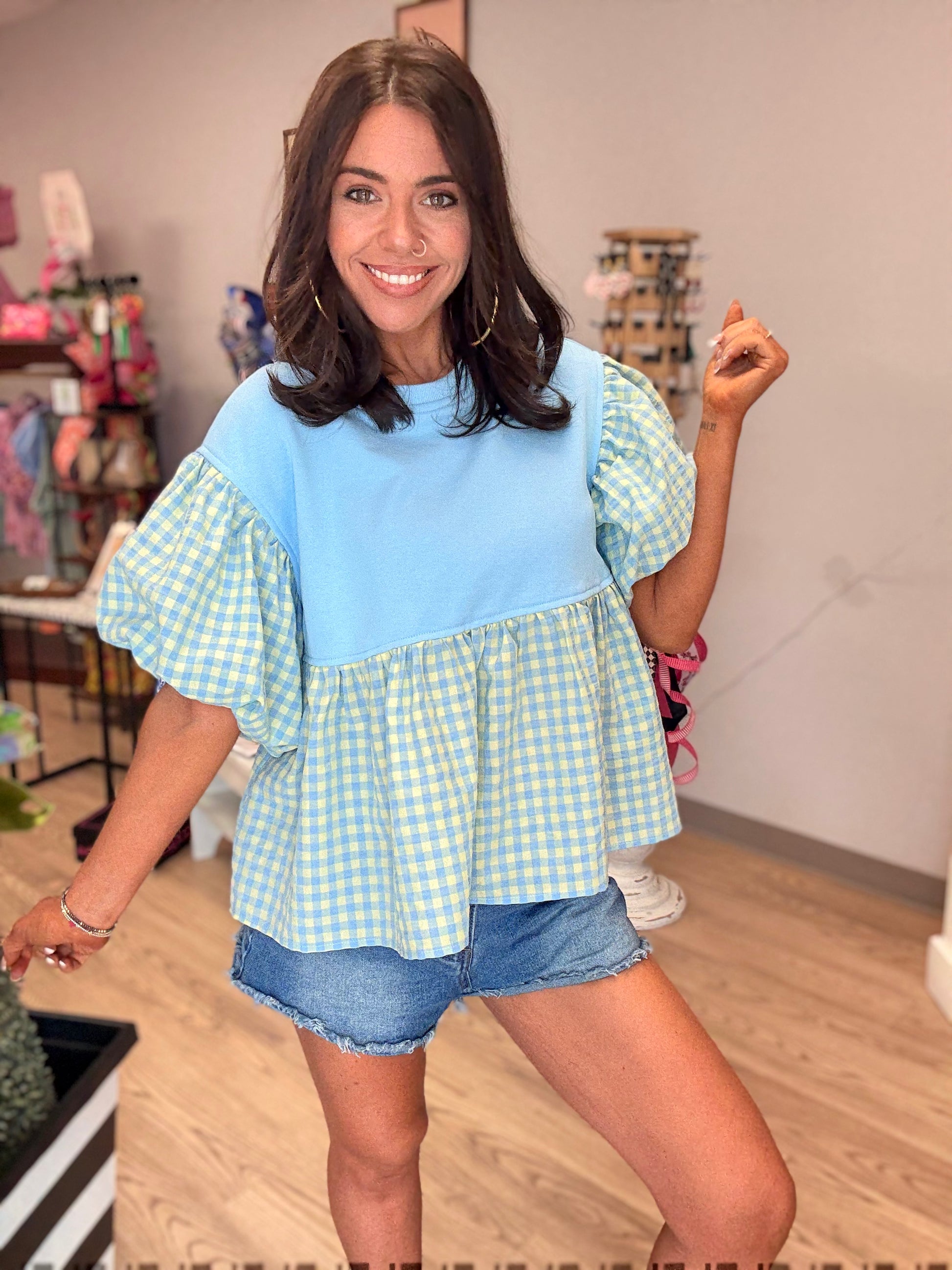 This babydoll blue top features puff sleeves and a plaid pattern detail. Made from 100% Polyester, it offers a flowy fit for comfort and style.