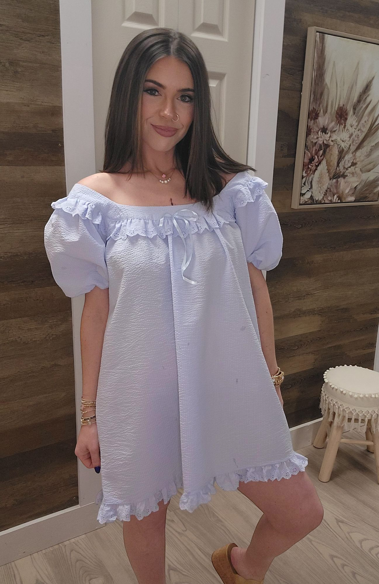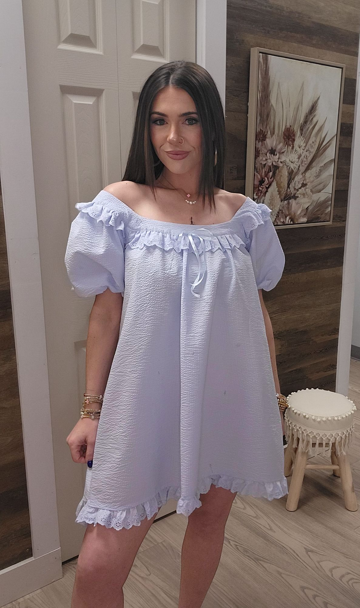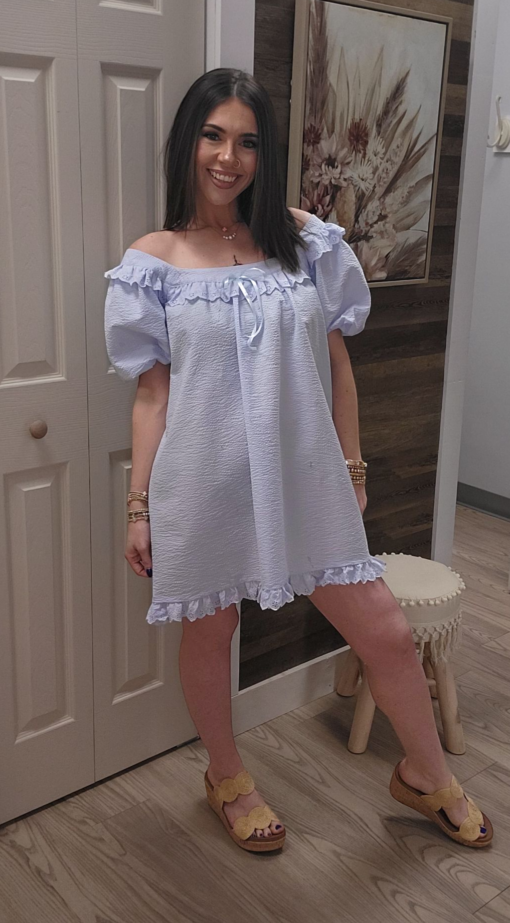 The Babydoll Blues Dress is a versatile piece that can be worn on or off the shoulder, with puff sleeves and elegant ruffle detailing. Made with 100% cotton, it offers a true to size fit but is short in length. For a longer look, simply size up. Perfect for any occasion with its comfortable and stylish design.