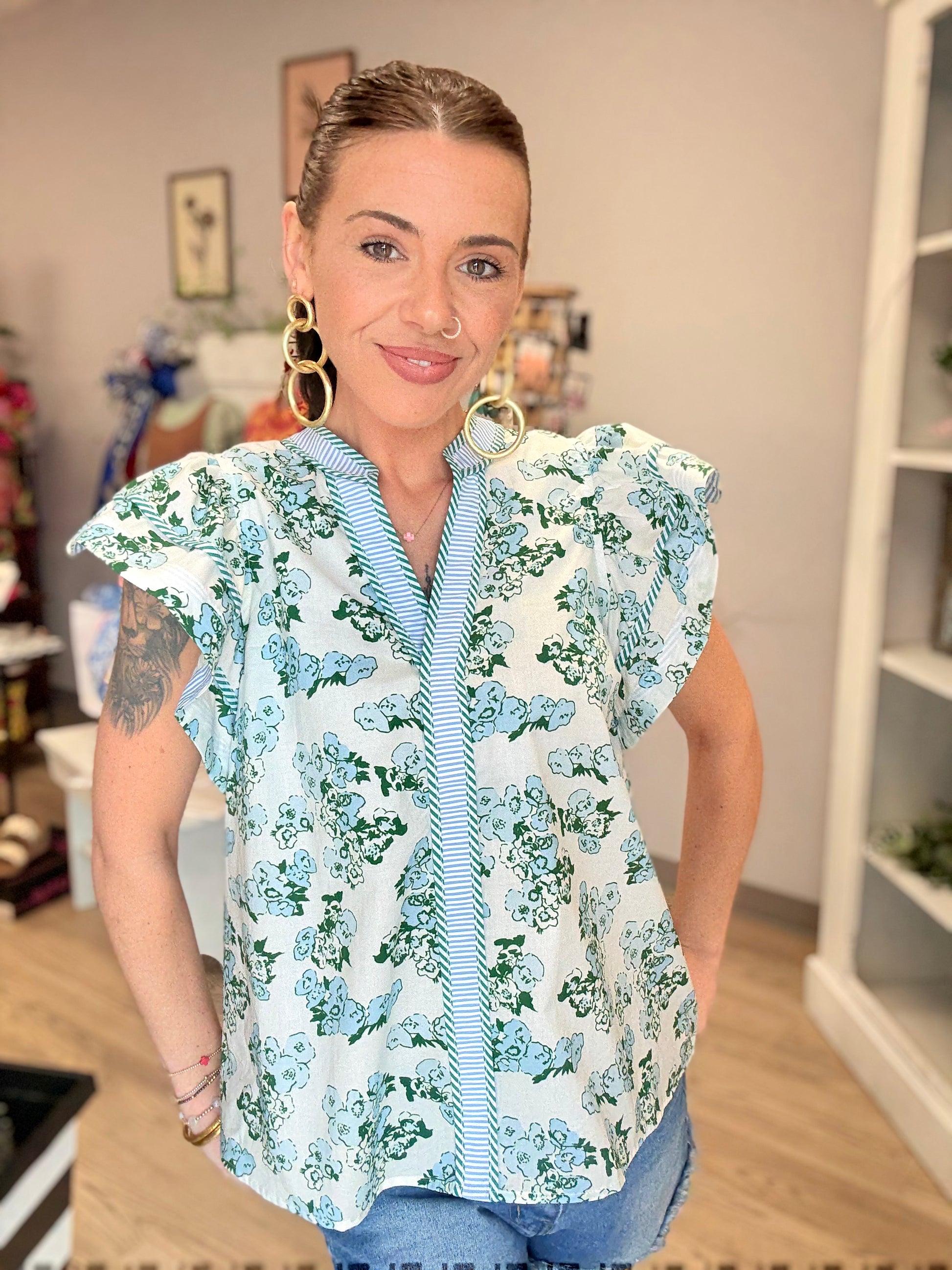 Expertly designed with a true-to-size fit, this Beautiful & Blooming Top features elegant ruffle sleeves and a stunning blue and white floral print. Elevate your style with this enchanting piece, perfect for any occasion.