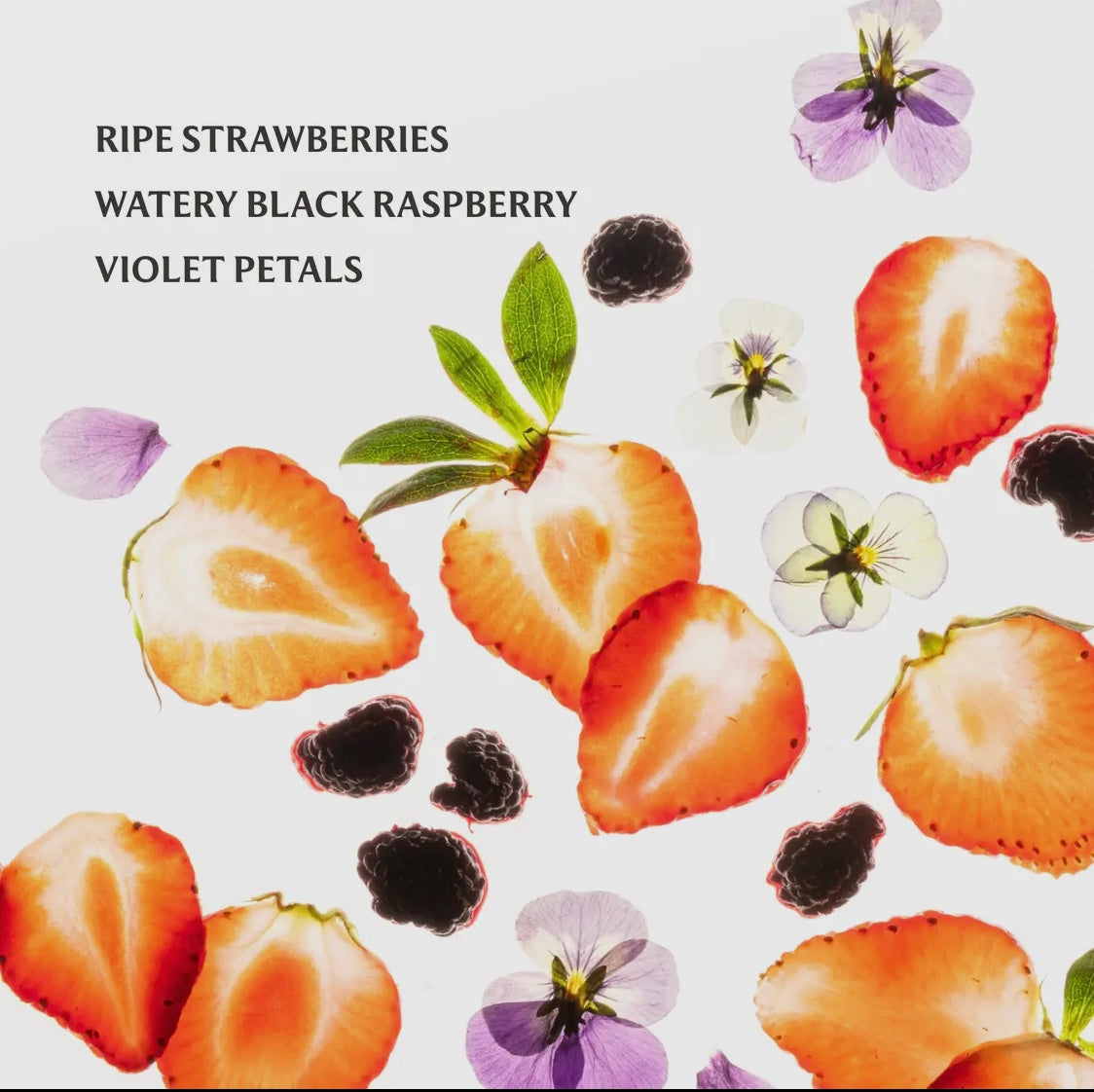 A skincare-forward hand sanitizer that leaves hands sanitized, hydrated, and delicately scented. Berry Bliss Scent: Lush and joyful. Ripe strawberries and juicy black raspberry blend with violet petals, capturing the brightness of a berry-kissed meadow.