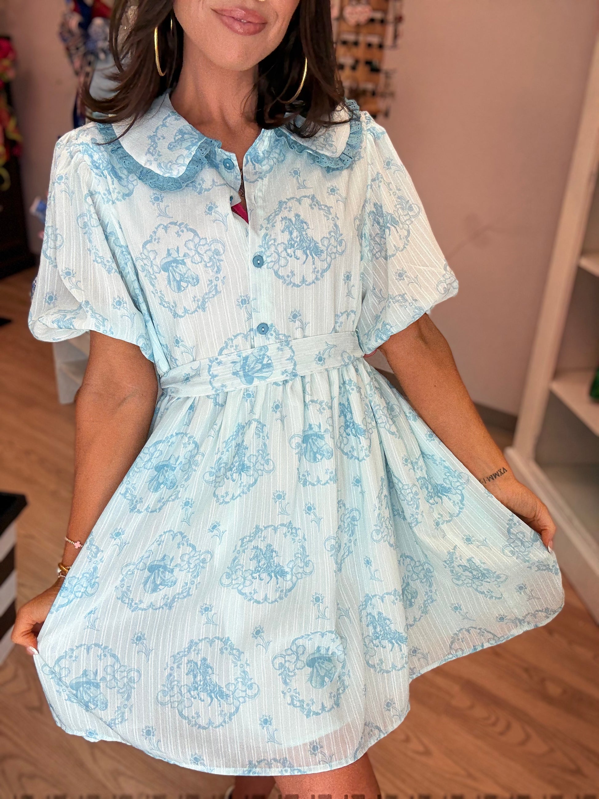 This beautiful dress features charming Petter Pan collar, functional button down front, flattering tie detail at the waist, convenient pockets, and comfortable fully lined 100% polyester material. Perfectly tailored for a true to size fit.