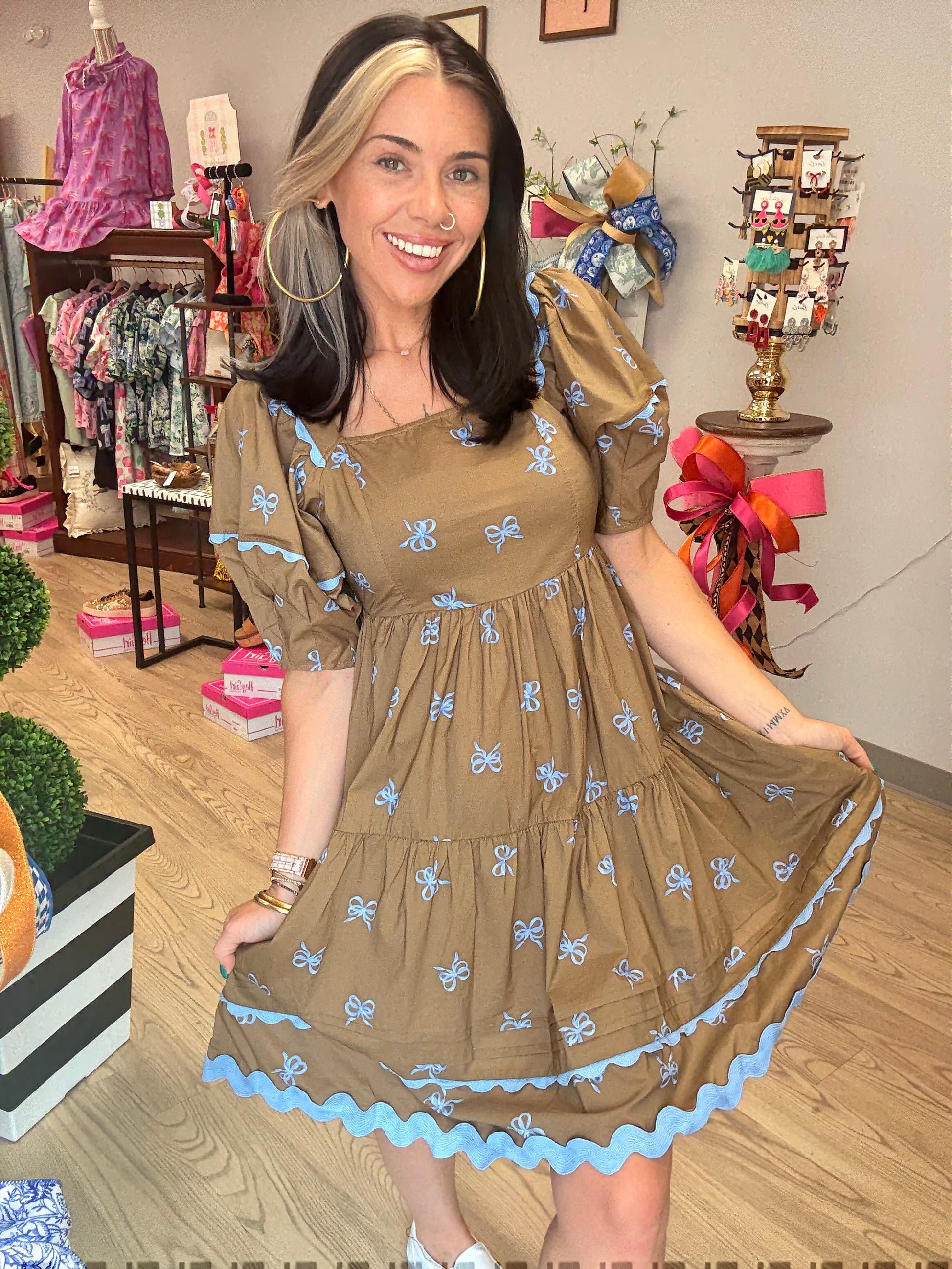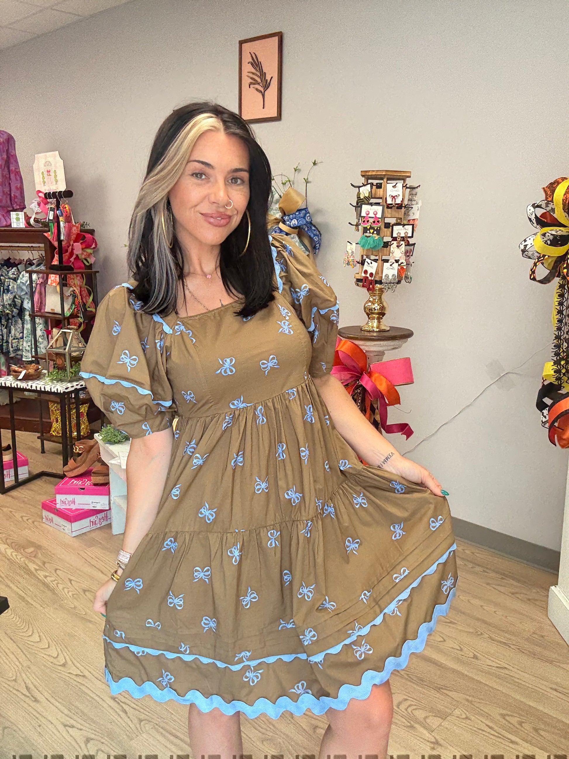 Upgrade your wardrobe with our Boosting Your Confidence Bow Dress. The beautiful blue and brown combo is accentuated by embroidered bows and puff sleeves, making you stand out in any crowd. Its true to size fit and 100% cotton material ensure maximum comfort and style.