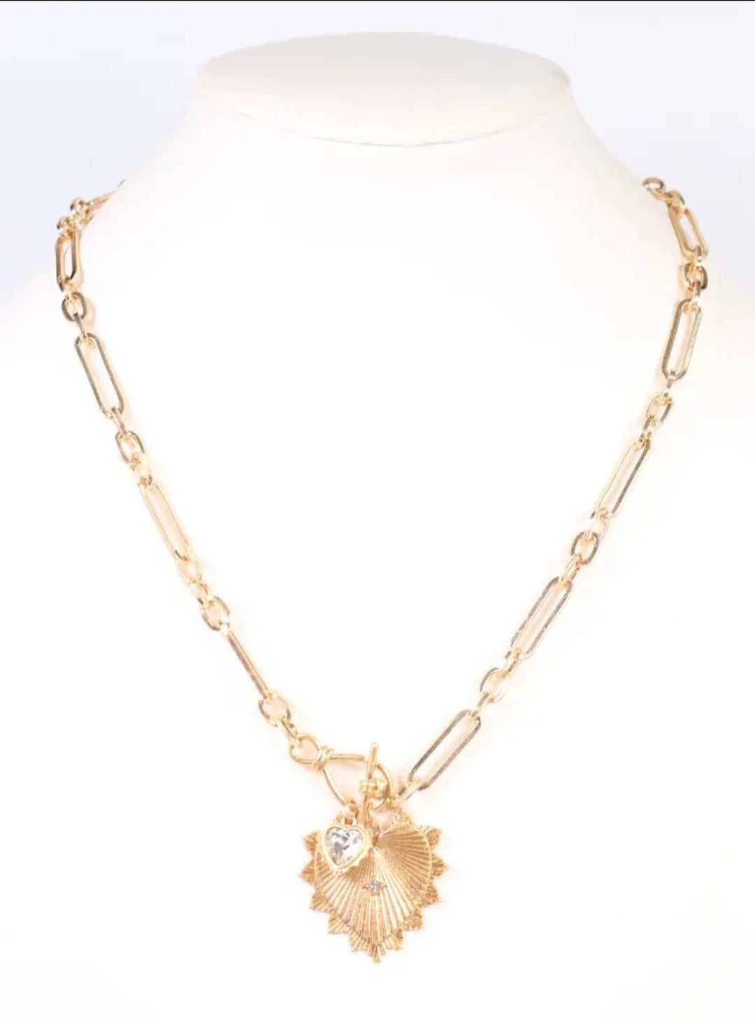 This elongated link necklace features a front functional toggle closure with a worn finish. The ribbed heart charm has a single CZ accent, and the CZ heart charm is set in gold. 17.5" 3" extender