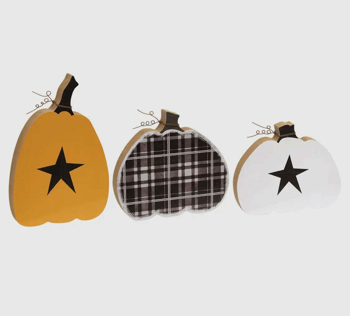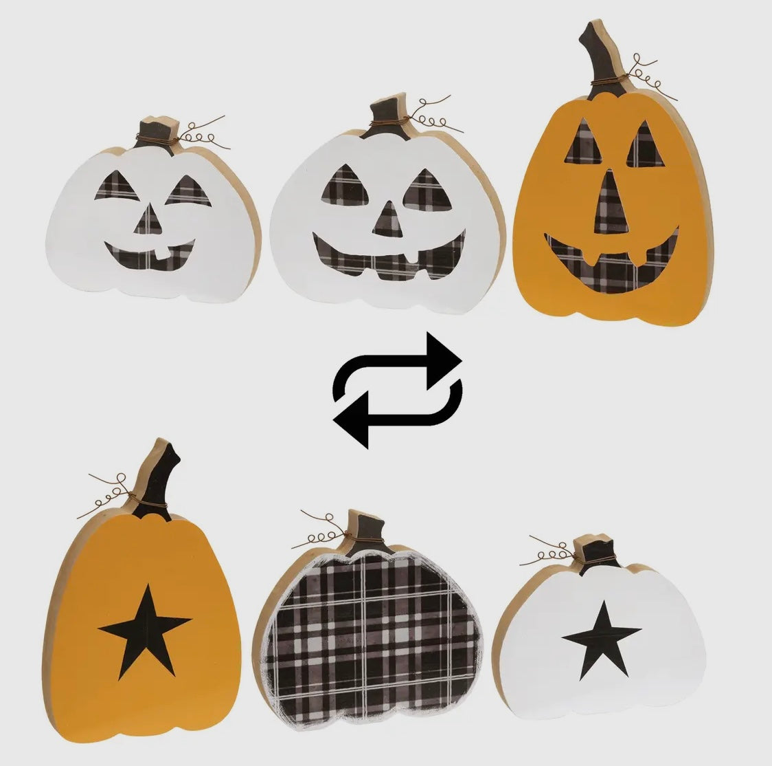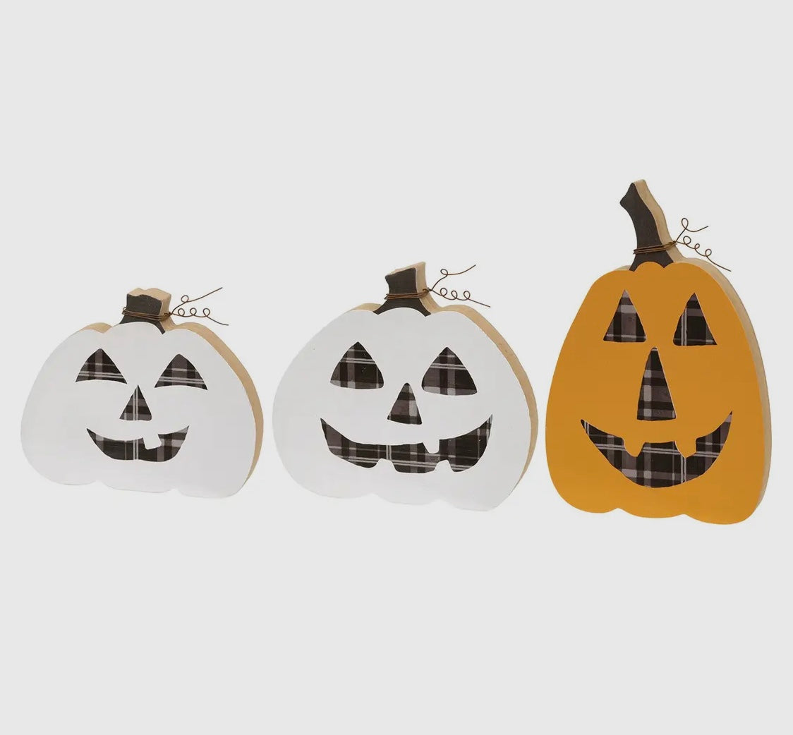 The Buffalo Plaid Pumpkin Sitters are a set of three decorative wooden blocks in the shape of pumpkin silhouettes, with a reversible design, patterned on one side and a jack-o-lantern face on the other. One pumpkin has a black and white plaid design, another has a black and white star and plaid design, and the third is orange with a star and black plaid design. Each ornament has a wooden stem and features a curled wire detail at the top. Display these pumpkins freestanding, perfect as festive and spooky accents to a riser, tray, shelf, or table during the Fall and Halloween season. Small pumpkin measures 4.25” high by 5.25” wide by .75” deep. Medium pumpkin measures 5.25” high by 5.25” wide by .75” deep. Large pumpkin measures 7.25” high by 4.75” wide by .75” deep.