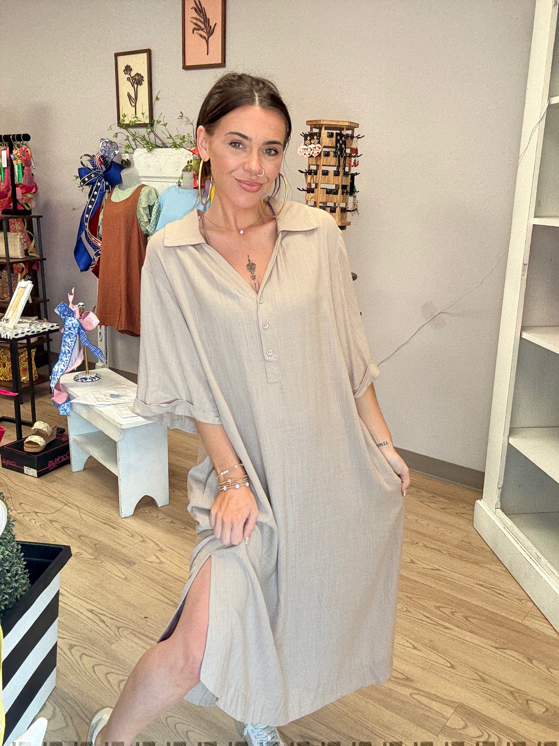 Discover comfort and sophistication with our Tan Maxi Dress. This flowy dress features a collared detail and button-up front for added style, with side slits and pocket details for ease. Made with a perfect blend of 55% Linen and 45% Rayon, it's both soft and durable for all-day wear. Elevate your wardrobe with this must-have dress.