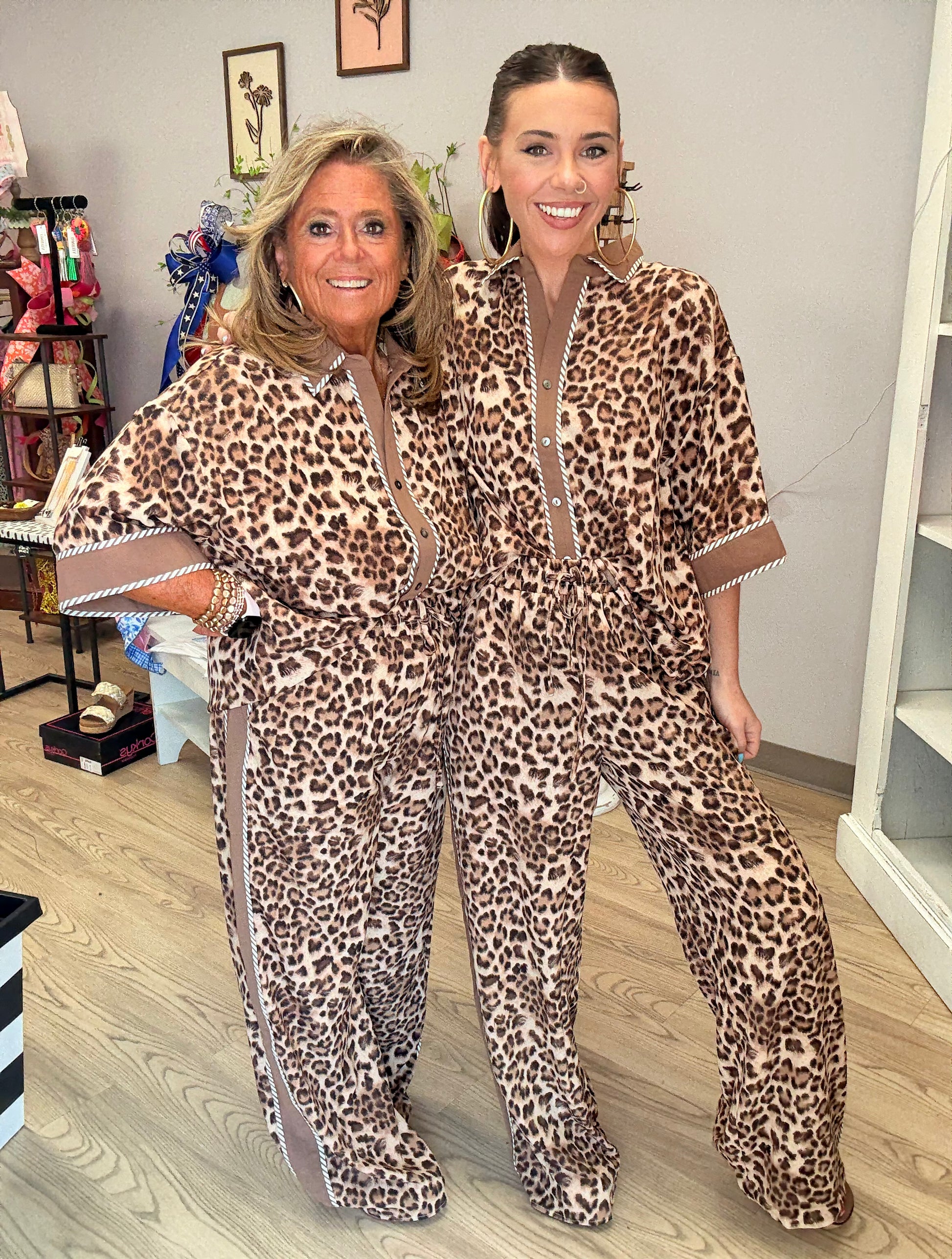 Upgrade your wardrobe with our Cheetah Set! This matching pants and top set features a flowy, button-down top and elastic waist pants with an adjustable tie for a perfect fit. Made from 100% Polyester, this set offers an oversized, comfortable fit. Effortlessly stylish, you'll love wearing it on any occasion.