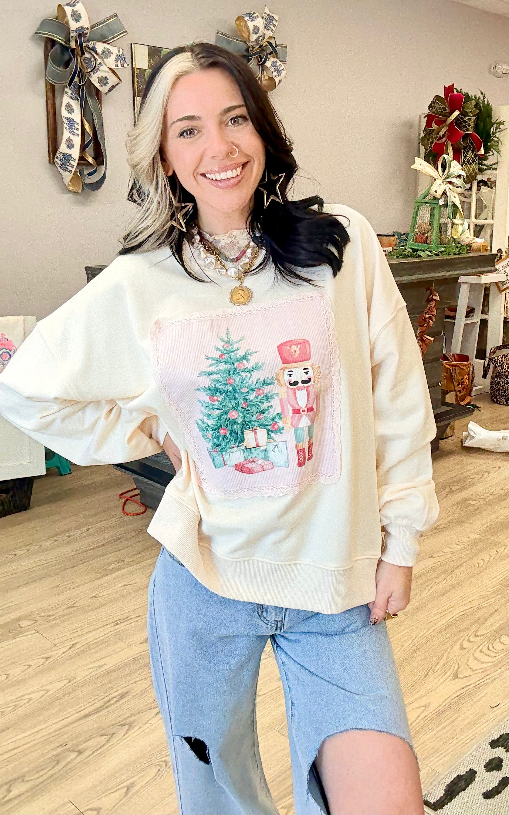 Elevate your holiday style with our Christmas Nutcracker Pullover. This blush toned pullover features a charming nutcracker design and has a slightly oversized fit for maximum comfort. Made with a blend of 85% cotton and 15% polyester, it's the perfect combination of style and coziness.