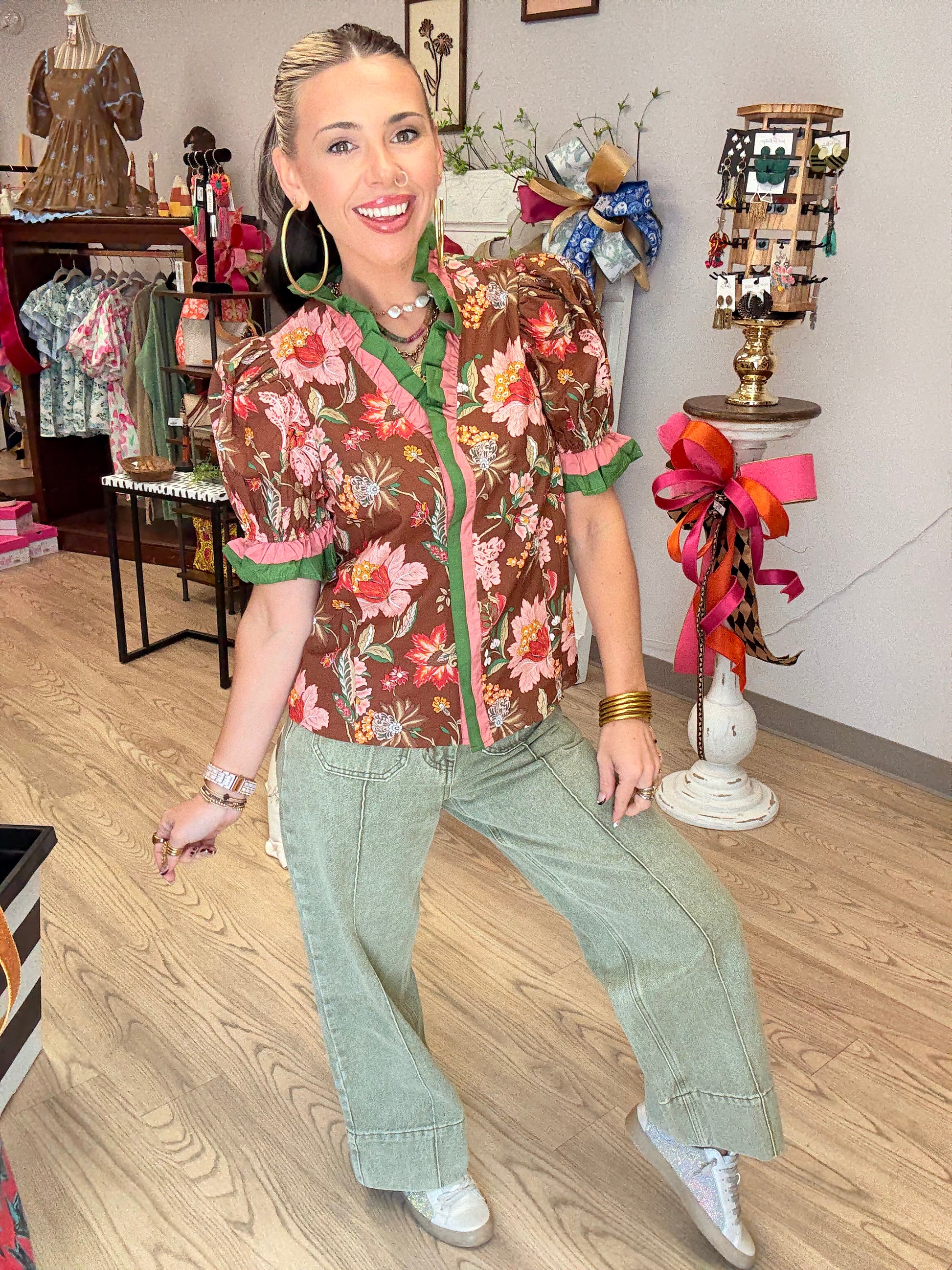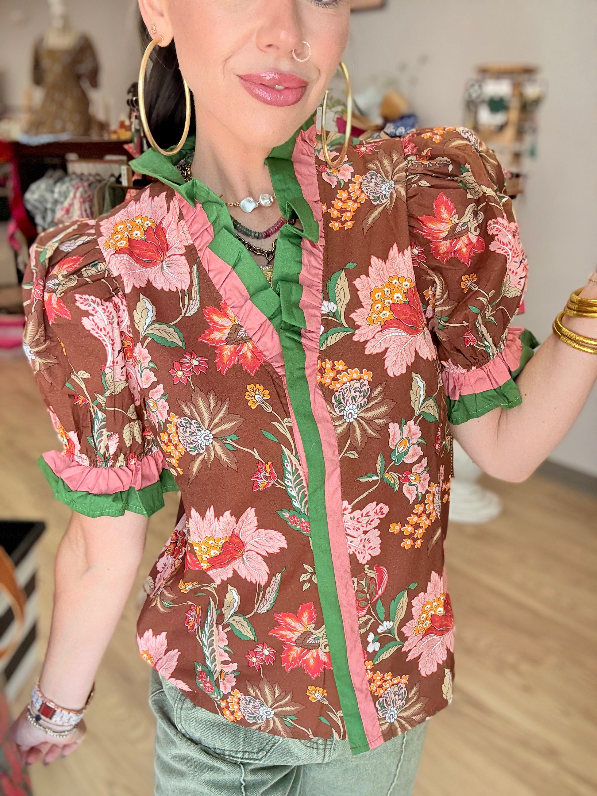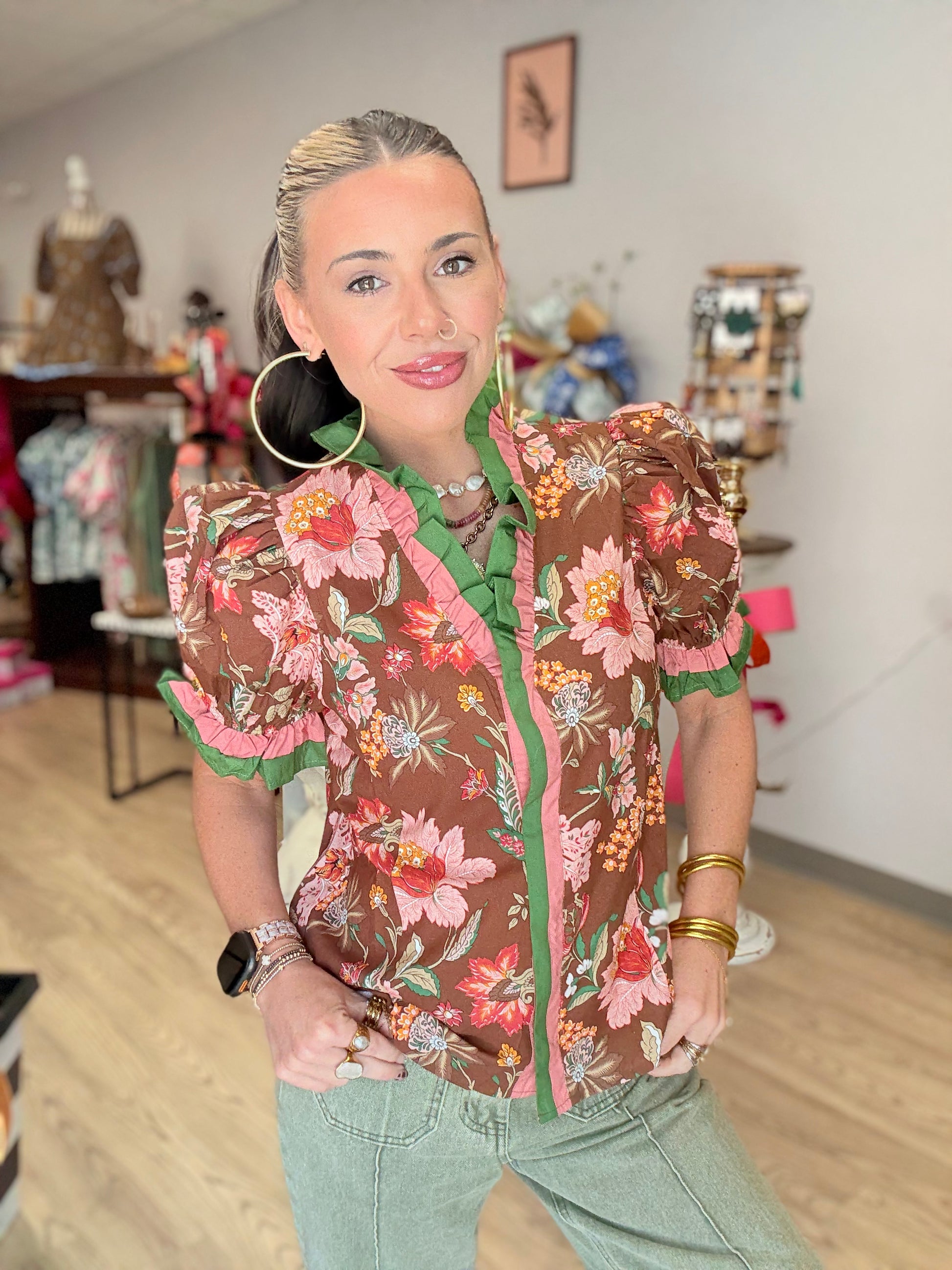 This gorgeous Colors of Fall Top features a ruffle neckline and sleeve detail, along with a beautiful button up design. The stunning floral pattern adds a touch of femininity to any outfit. Made with 100% cotton, this top is both comfortable and stylish. For a perfect fit, size up.