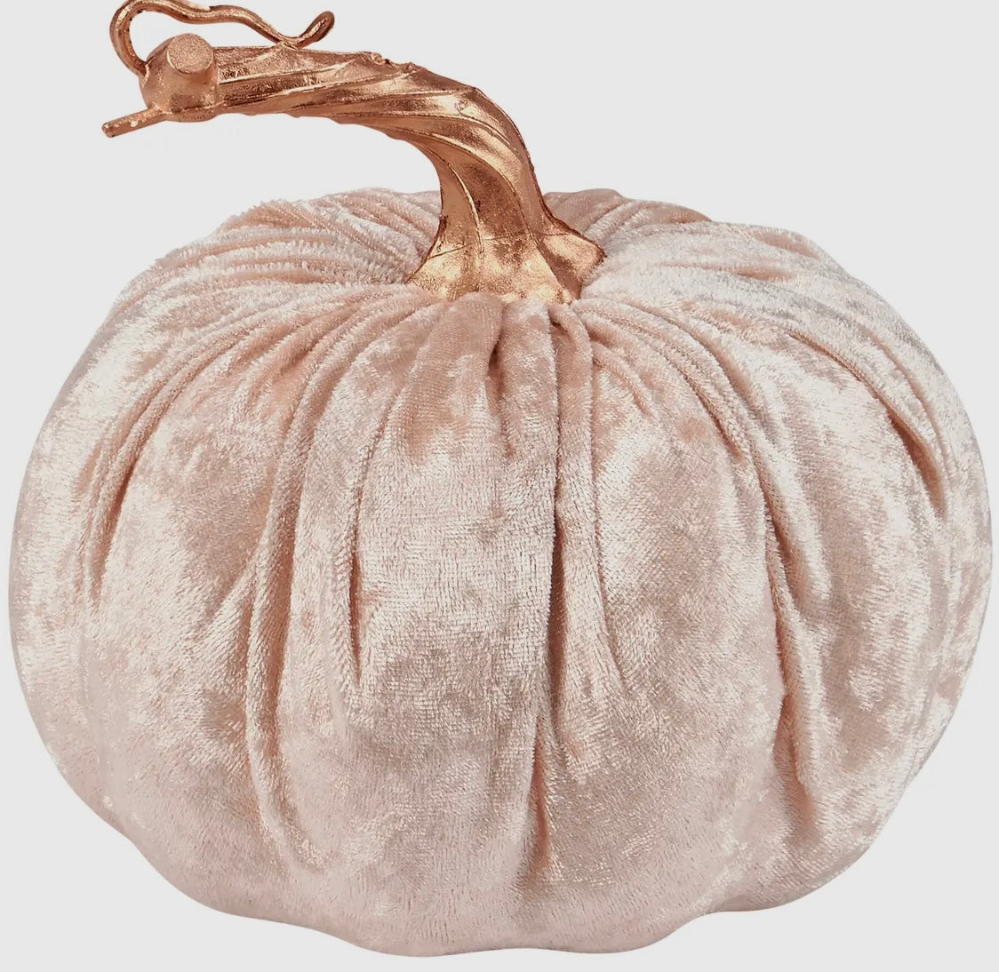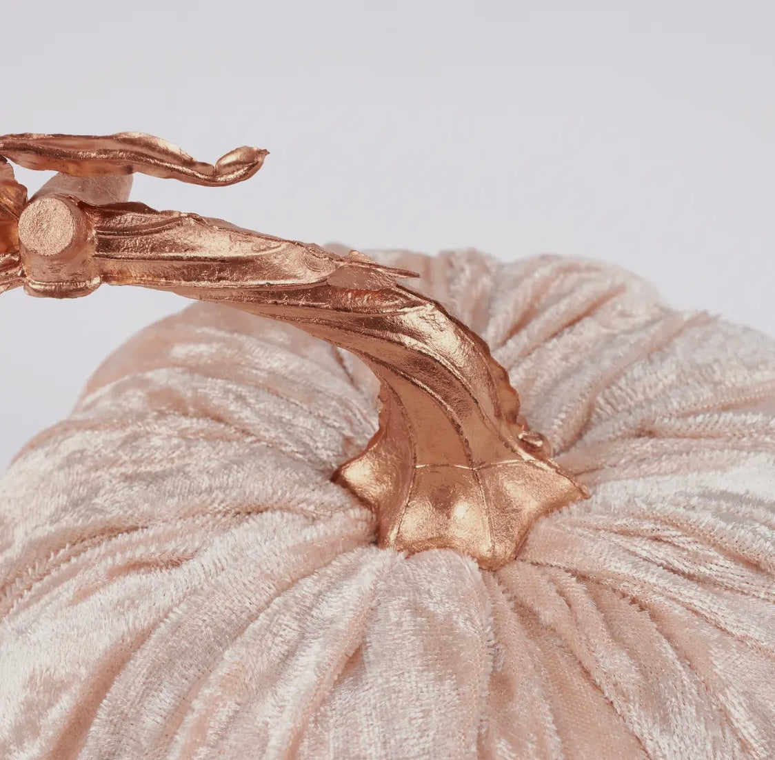 A decorative pumpkin from our Fall & Harvest Collection featuring a blush inspired cream velvet design with metallic gold color stem for added interest. Our Cream Velvet pumpkin is filled with polyester and designed to free-stand on any flat surface. Place in a display to add a stylish touch of autumn or with other decorative pumpkins as a collection. A charming home accent with a variety of seasonal display options.