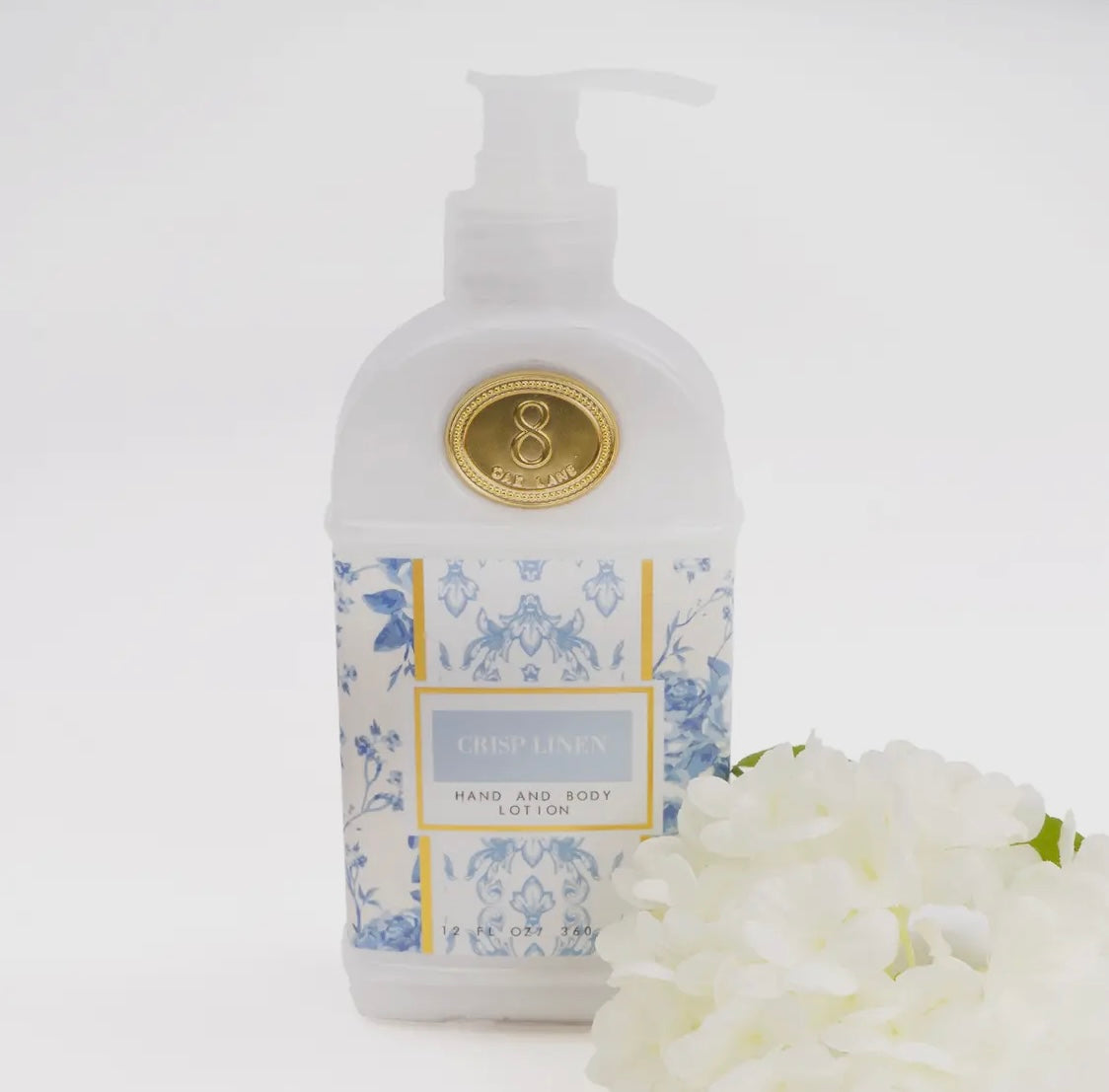 Introducing our luxurious Hand & Body Lotion with nourishing shea butter in our captivating Crisp Linen fragrance, a delightful blend of clean cotton blossom & warm sandalwood notes. This hand & body lotion is here to elevate your moisturizing experience & transport you to a world of refreshing indulgence! Crafted with meticulous attention to detail, this luxurious hand & body lotion hydrates effortlessly, turning every pump into a soothing experience. Packaged in a stunning and generously sized bottle featuring an intricate blue rose print, making it an elegant addition to your home decor or the perfect gift. Not only does this luxurious hand & body lotion boast a captivating fragrance and impeccable aesthetics, but it also delivers quality. Amazing gifts for birthdays, graduation, housewarming, Christmas, Mother's Day, Valentine's Day, & many more special occasions! 300ml Scent - Cotton Blossom & Sandalwood