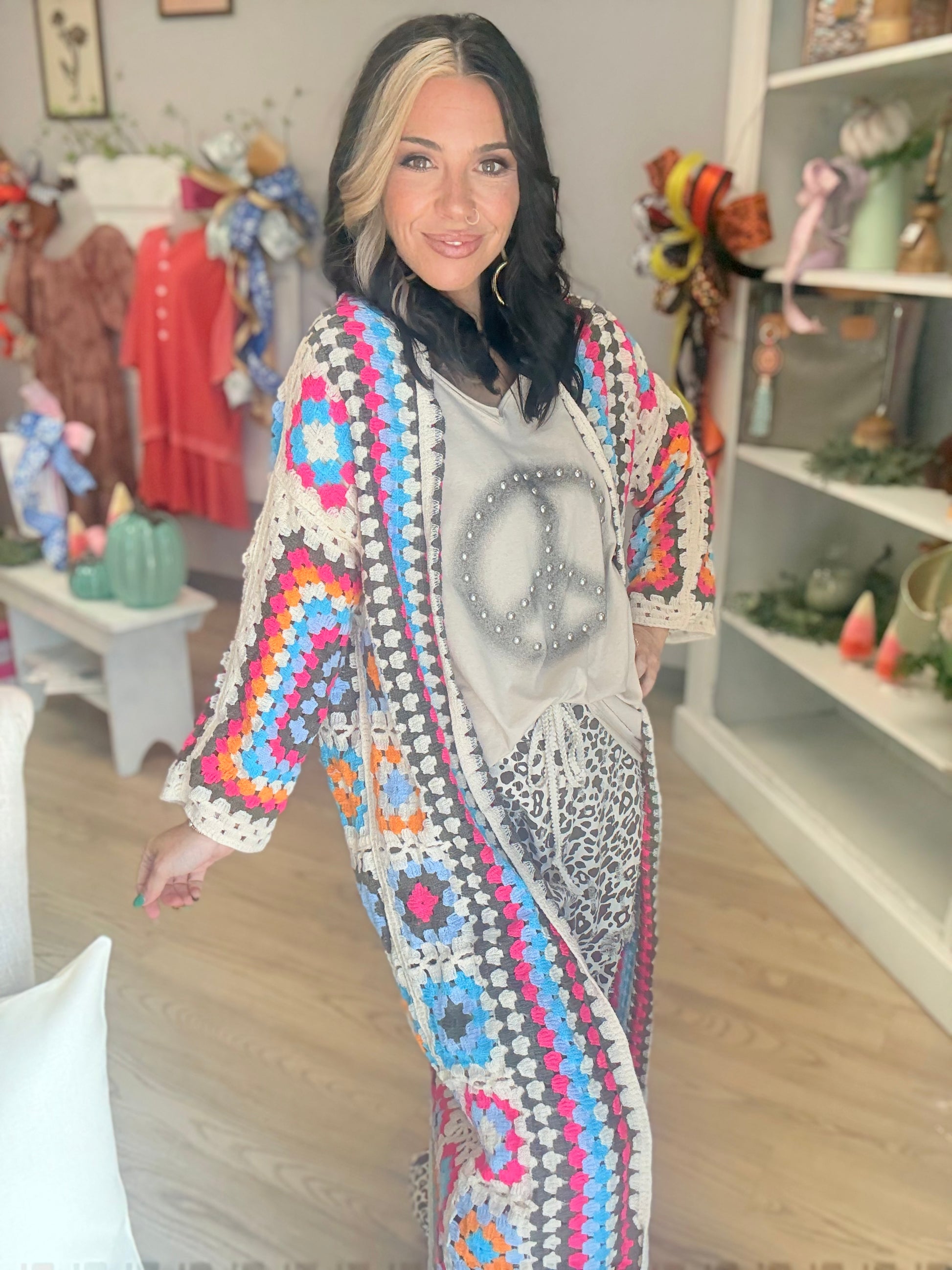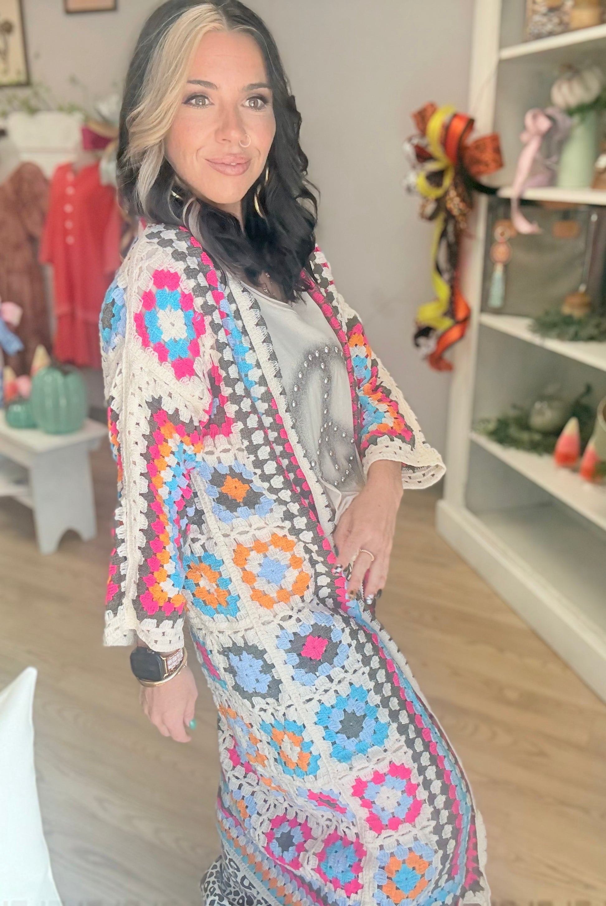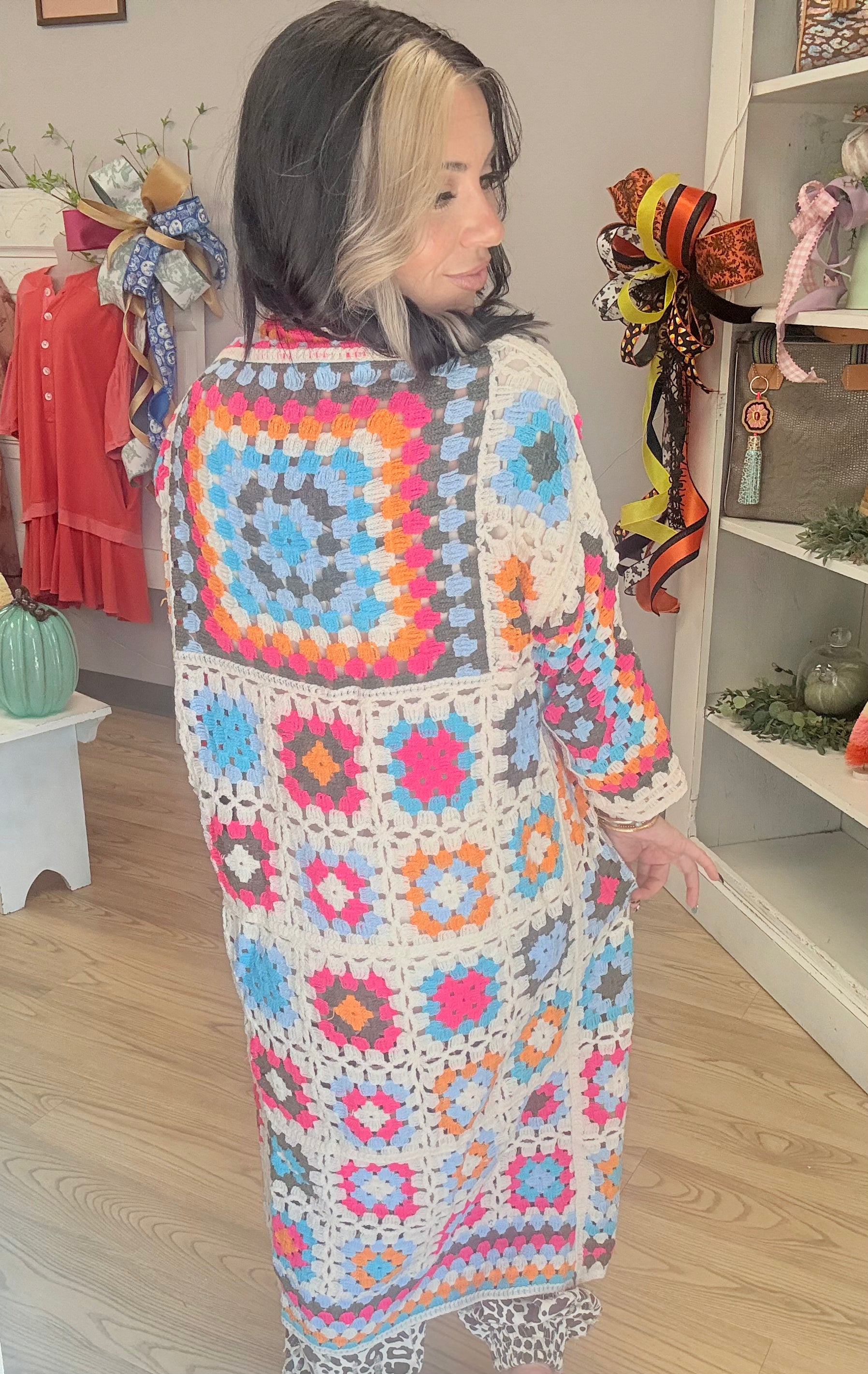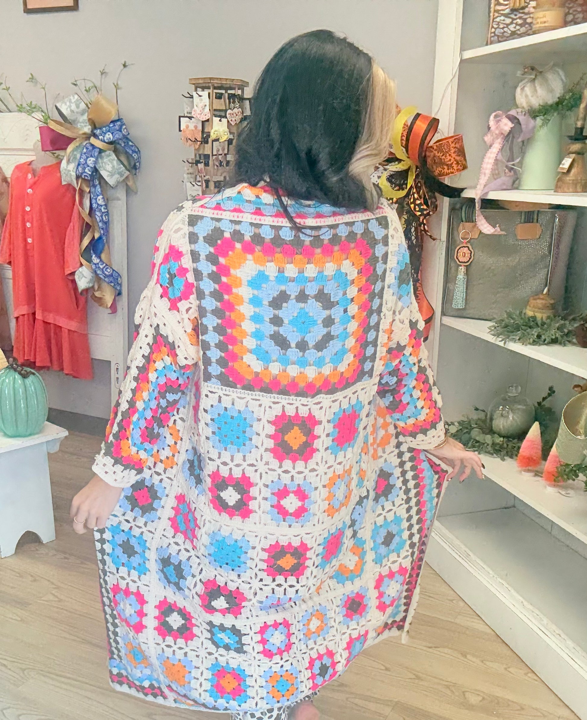 This knee-length crochet floral kimono in a variety of vibrant colors is made from 100% Acrylic material, providing both comfort and style. Available in one size, this kimono is a must-have addition to your wardrobe.