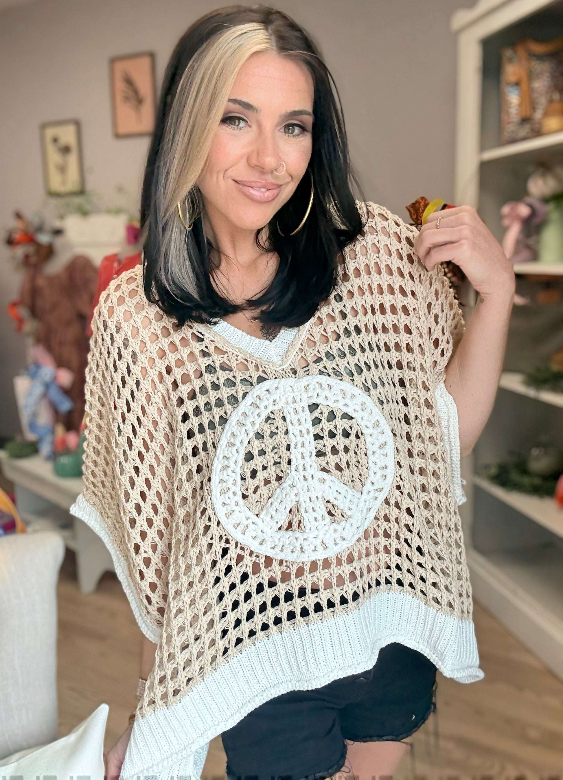 This beige and white crochet peace sign top exudes a flowy and oversized look. Made with a blend of 60% cotton and 40% nylon, it offers a comfortable fit. You can even size down with this versatile piece.