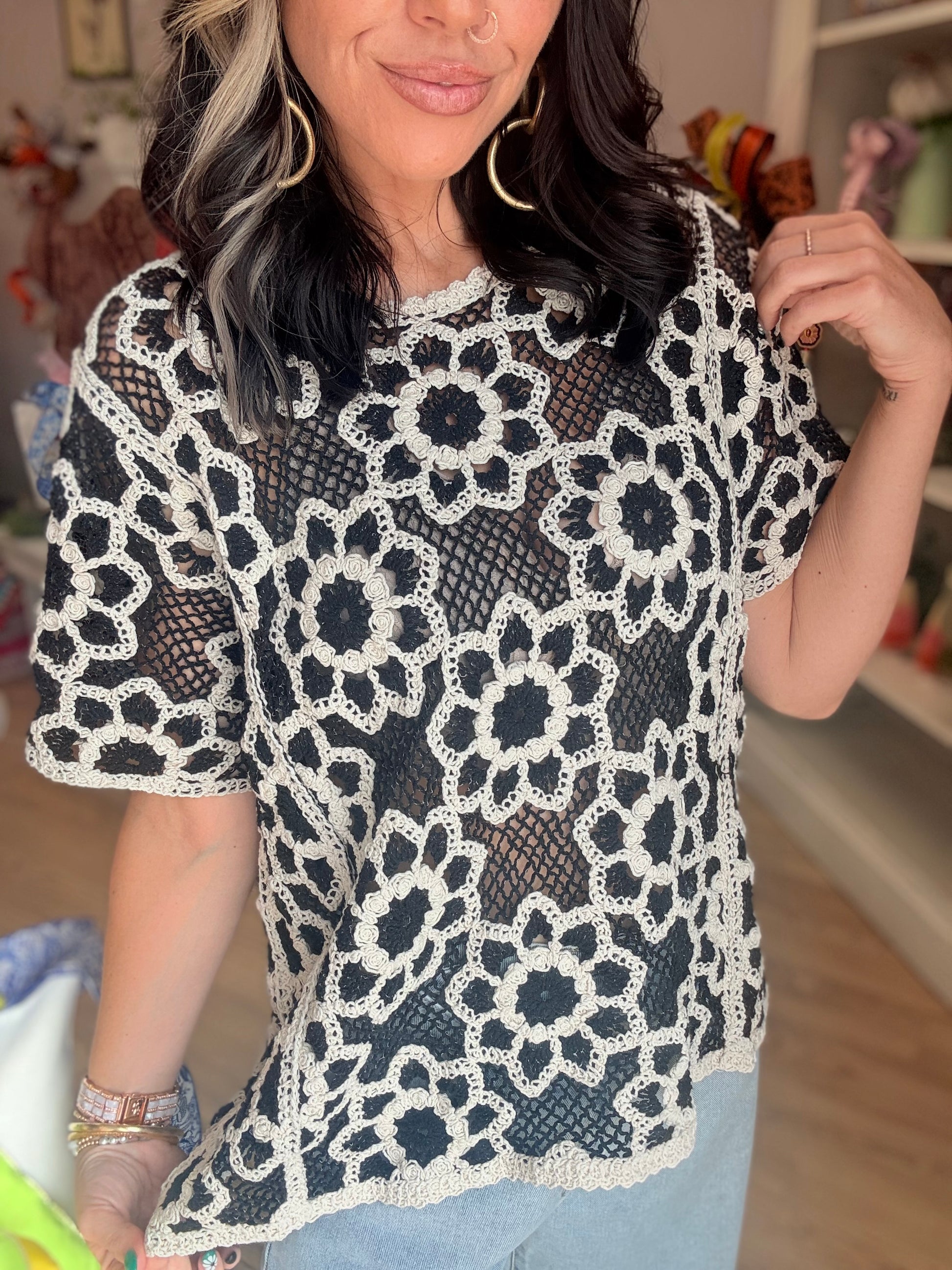 This black & natural colored crochet top is a must-have for any wardrobe. Its delicate detailing adds a touch of charm, while its true-to-size fit ensures a comfortable and flattering look. Made with 100% cotton, this top is not only stylish but also breathable and functional. Perfect for any occasion.