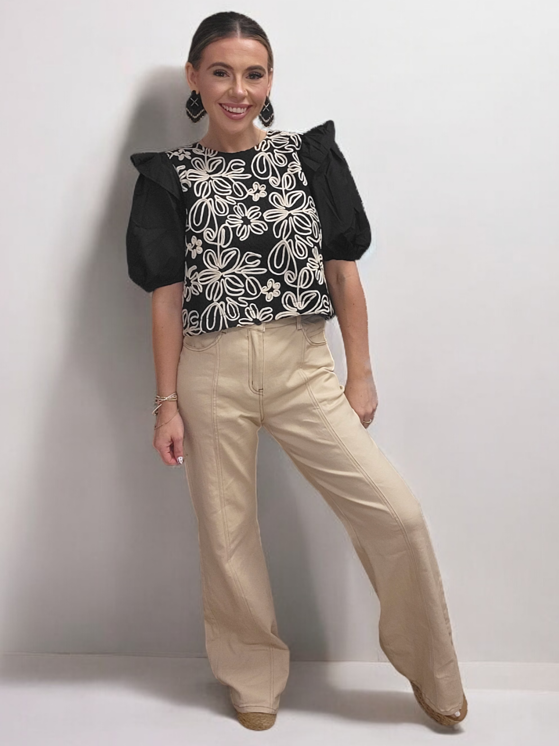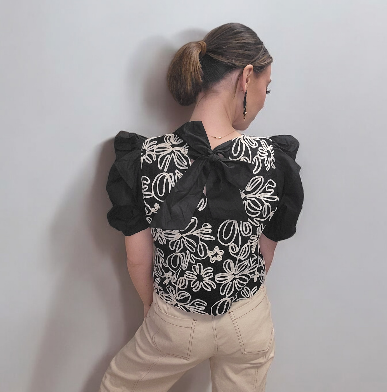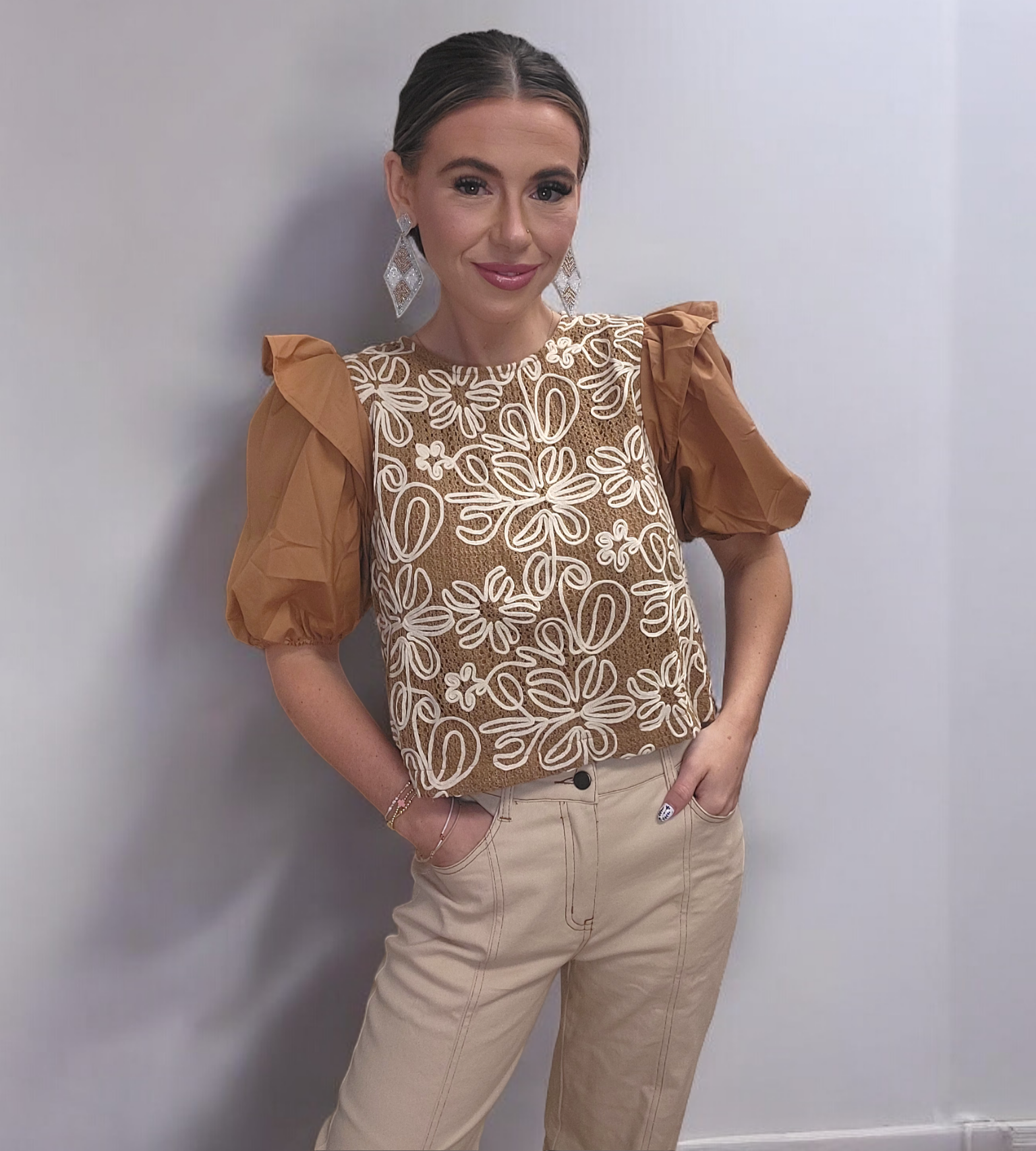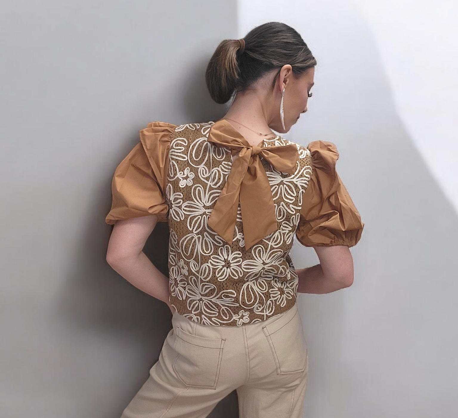 The Ellie Elegant Crop Top features sophisticated ruffle shoulder detailing, a tan floral pattern, and a charming bow tie back. Made with 100% Polyester material, this crop top is both comfortable and stylish. Size up for a longer length.