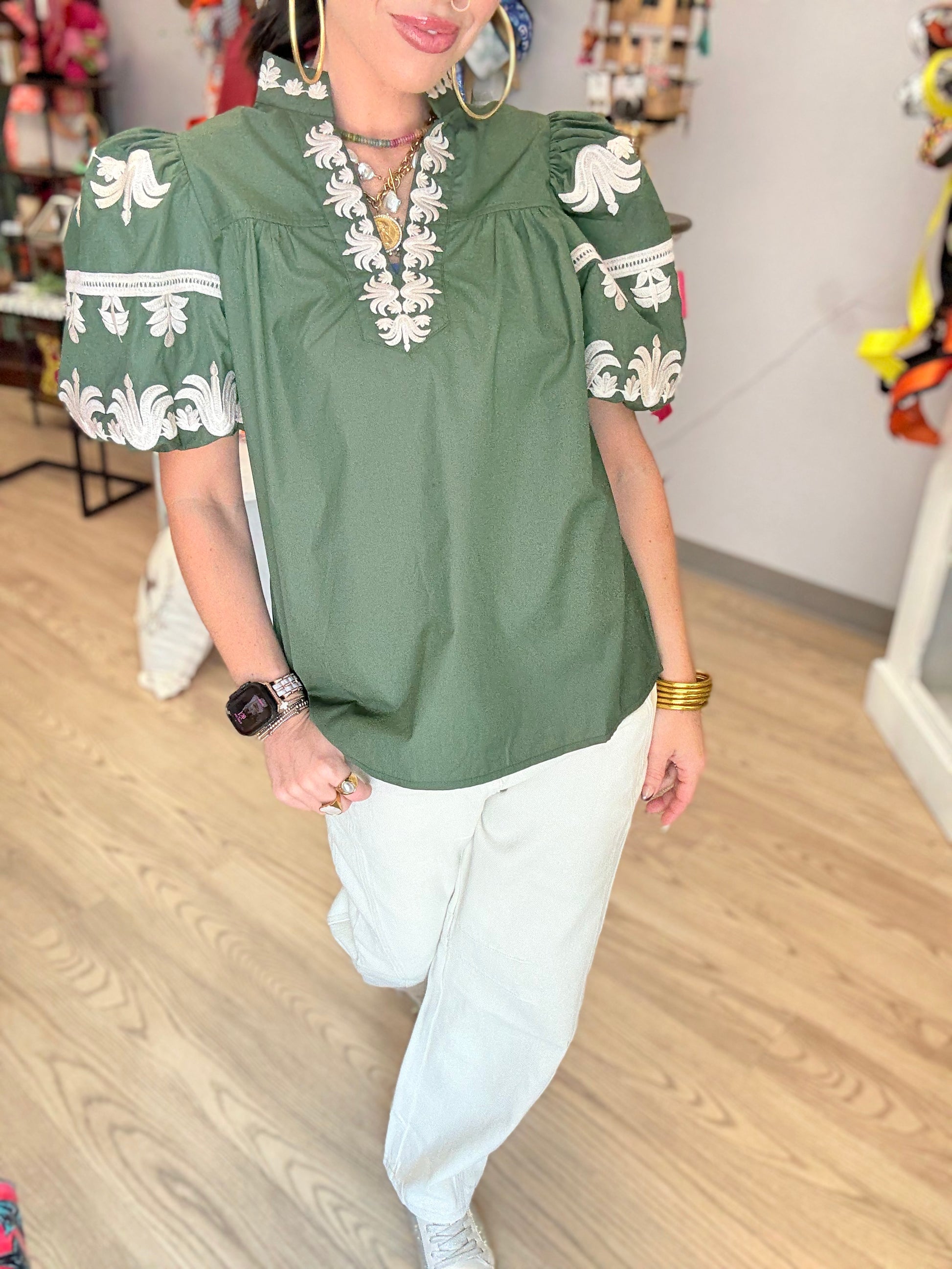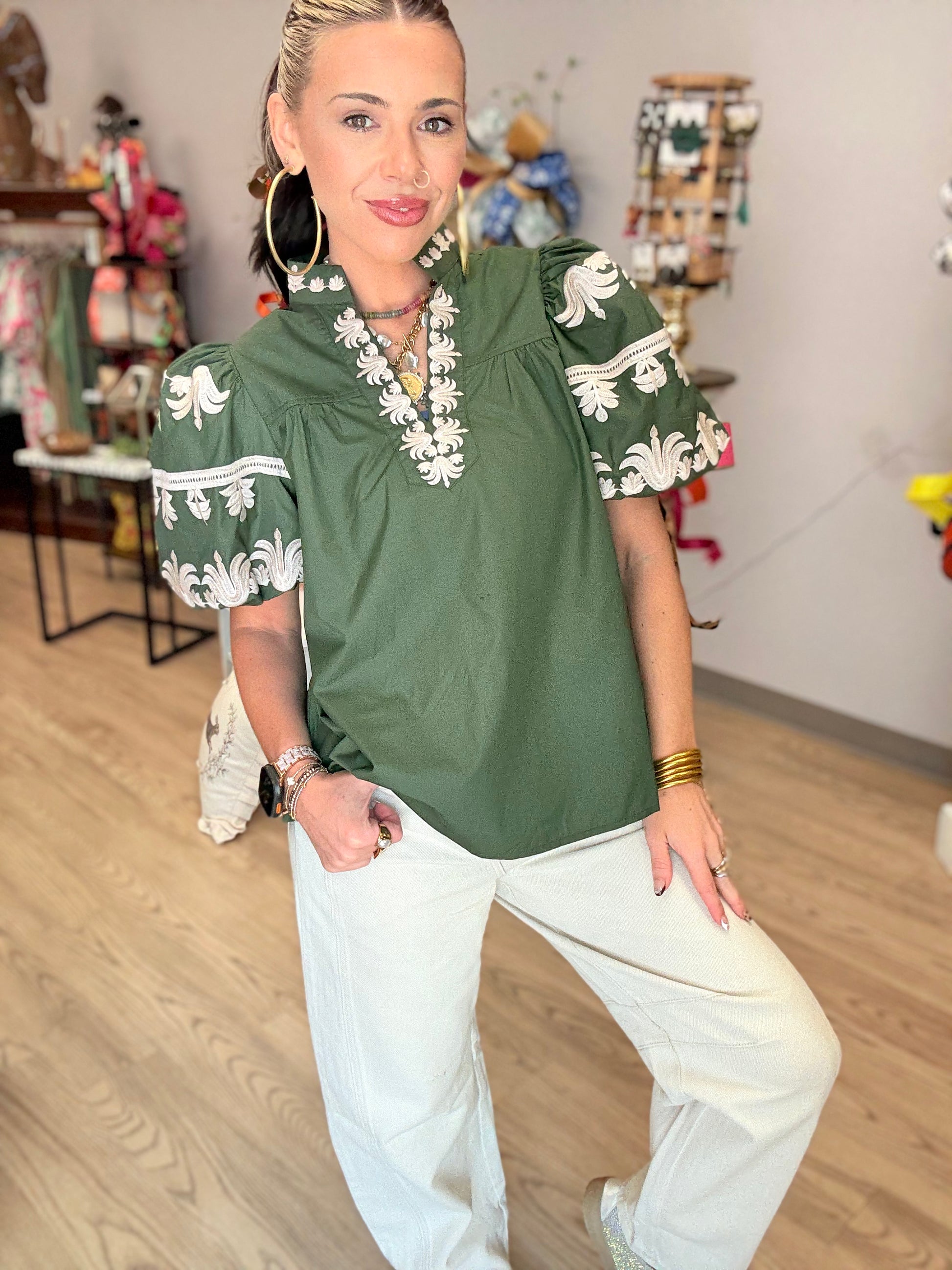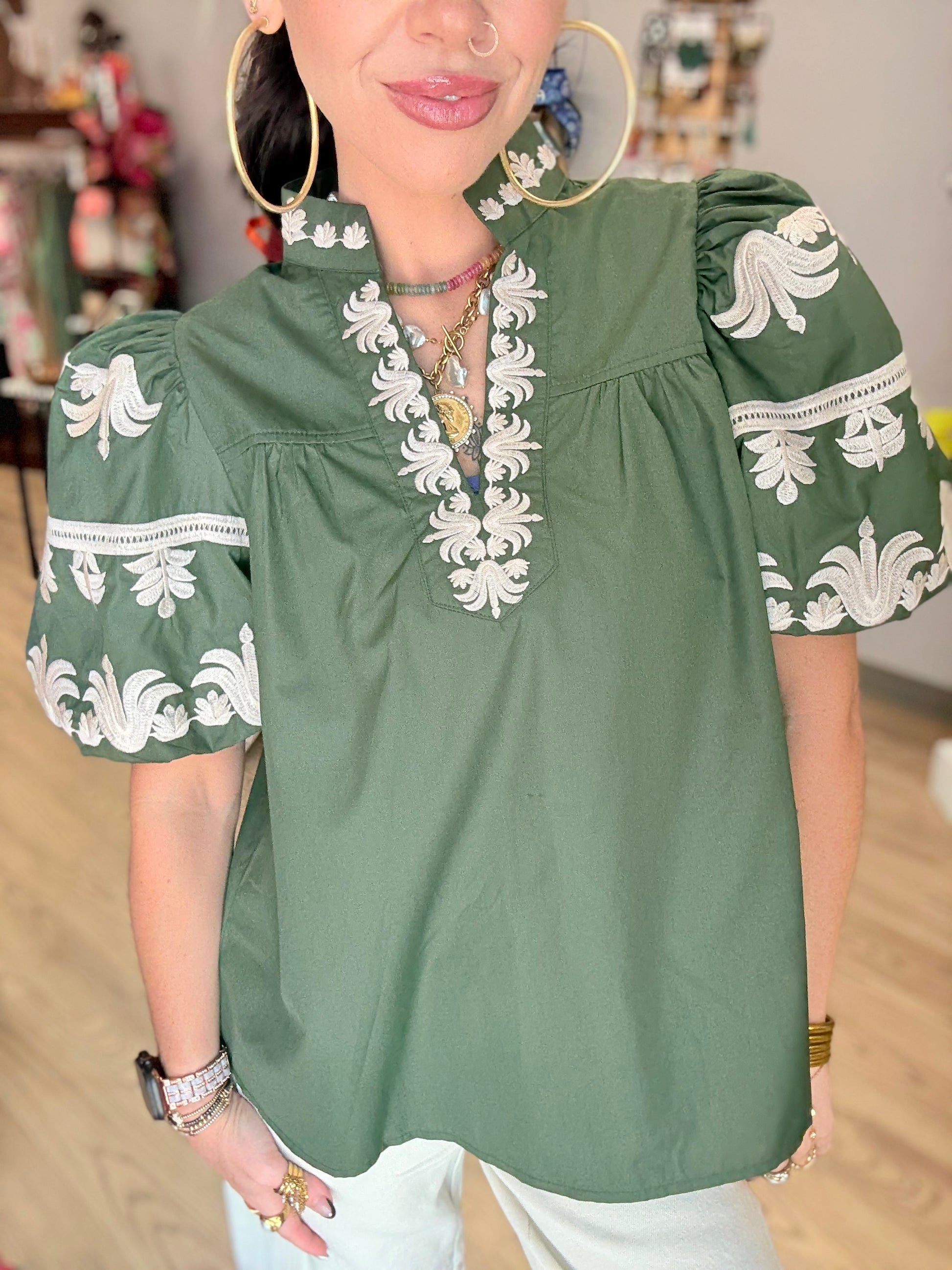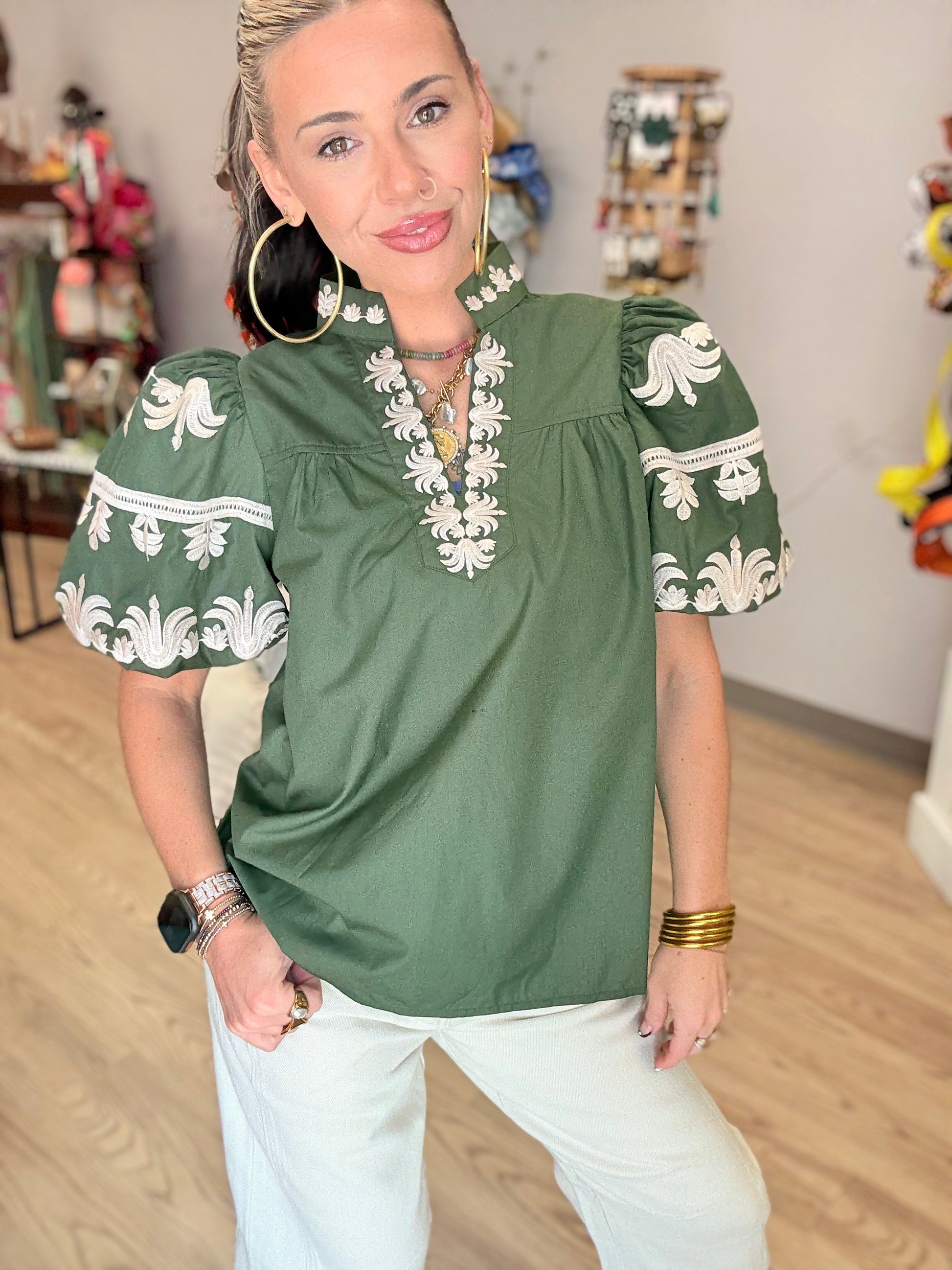 This elegant top boasts intricate cream embroidery detailing and puff sleeves for a touch of sophistication. Made from high-quality 65% polyester and 35% cotton, this top offers a true to size fit for maximum comfort. Perfect for any occasion, this top is a must-have addition to your wardrobe.
