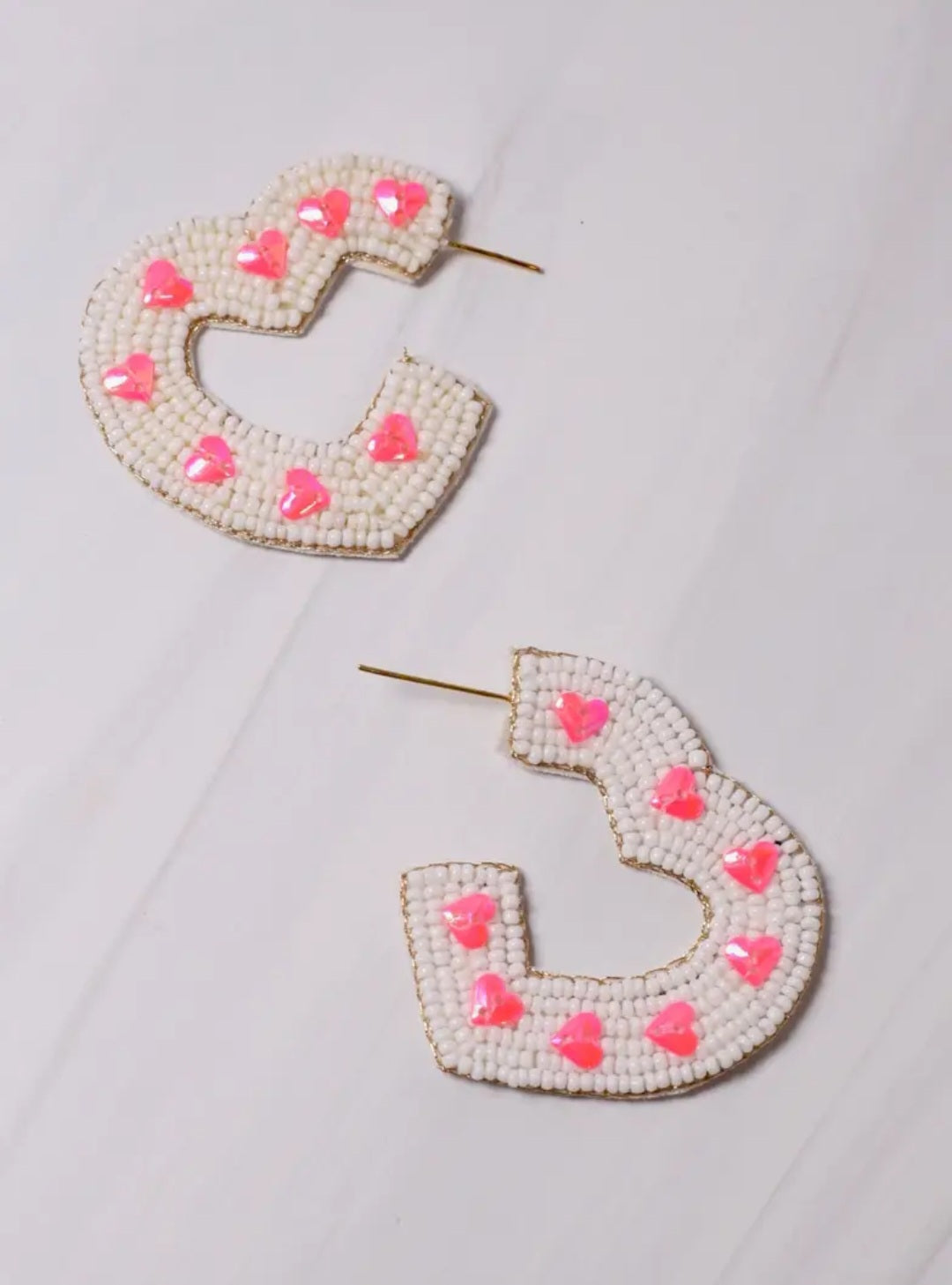 This open heart hoop earring is beaded with sequin heart accents on a post back. Dimensions: 2"