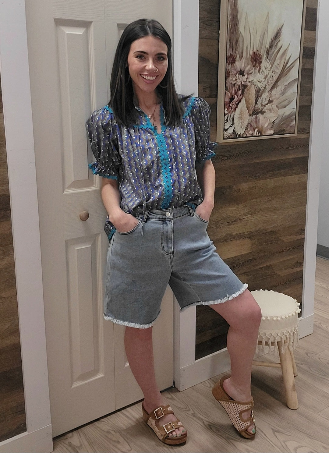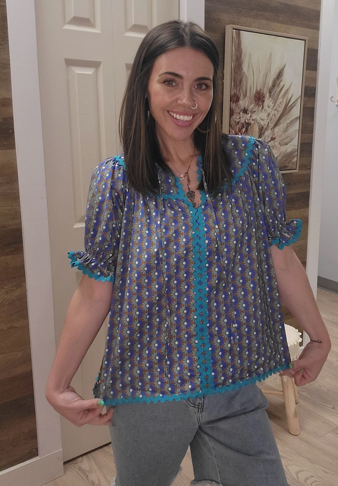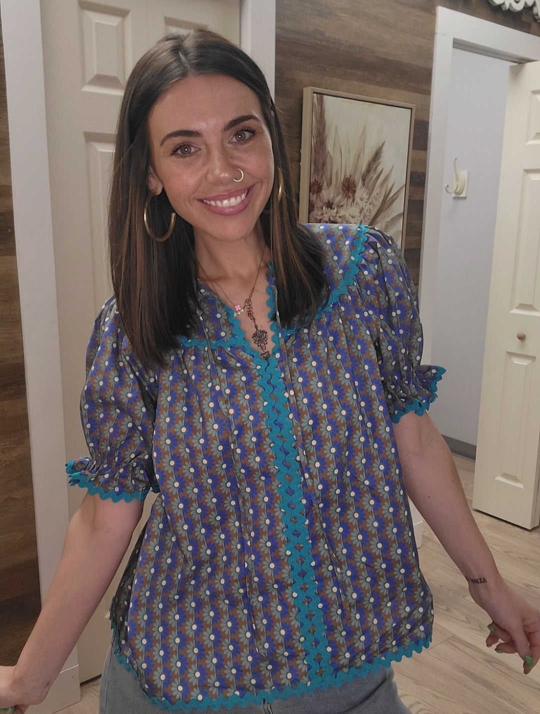 This cotton top features a charming blue and green floral print with elegant ric rac detailing. The tie neck feature adds a touch of sophistication, while maintaining a true to size fit. Made from 100% cotton, this top is perfect for any occasion.