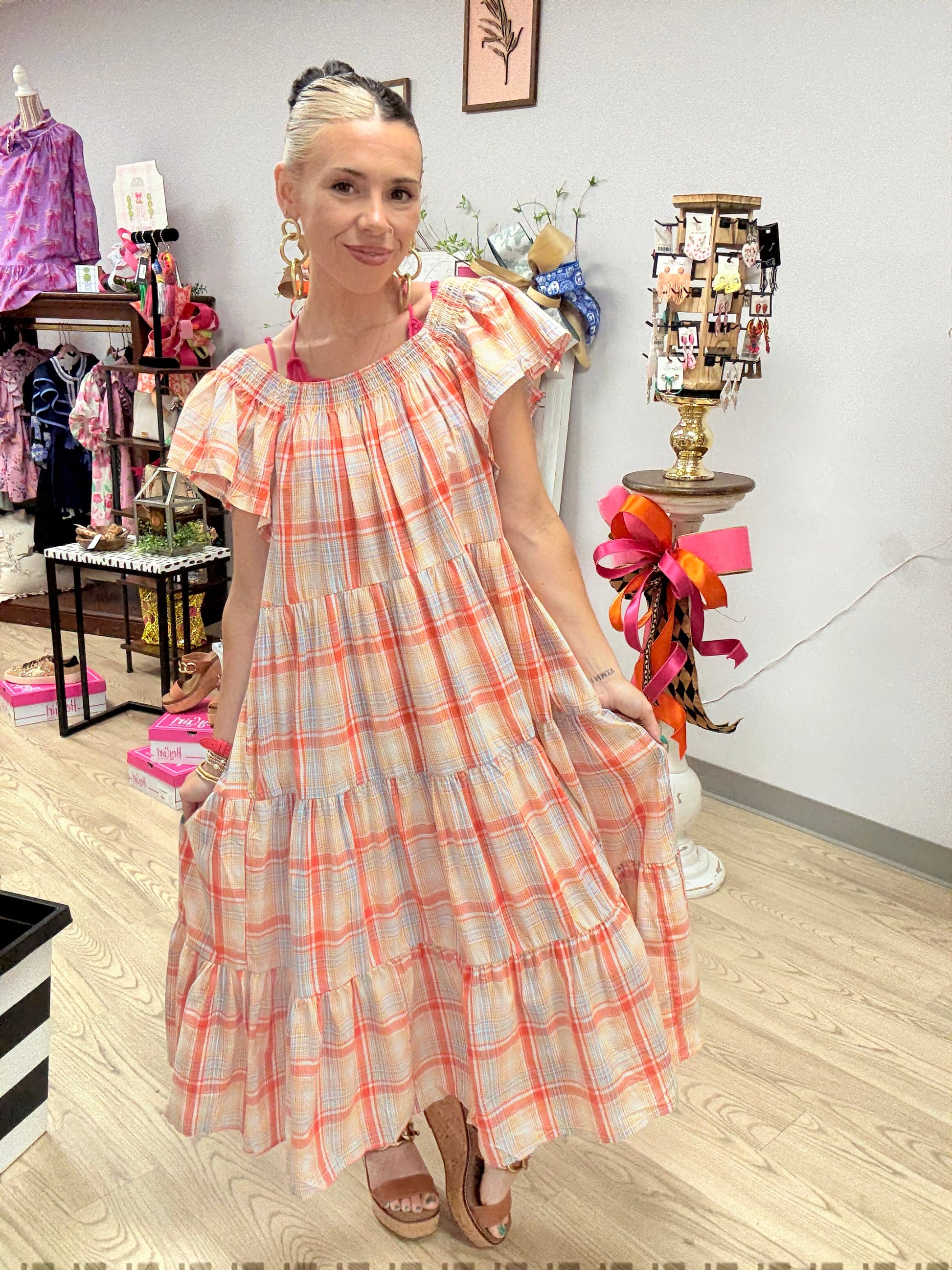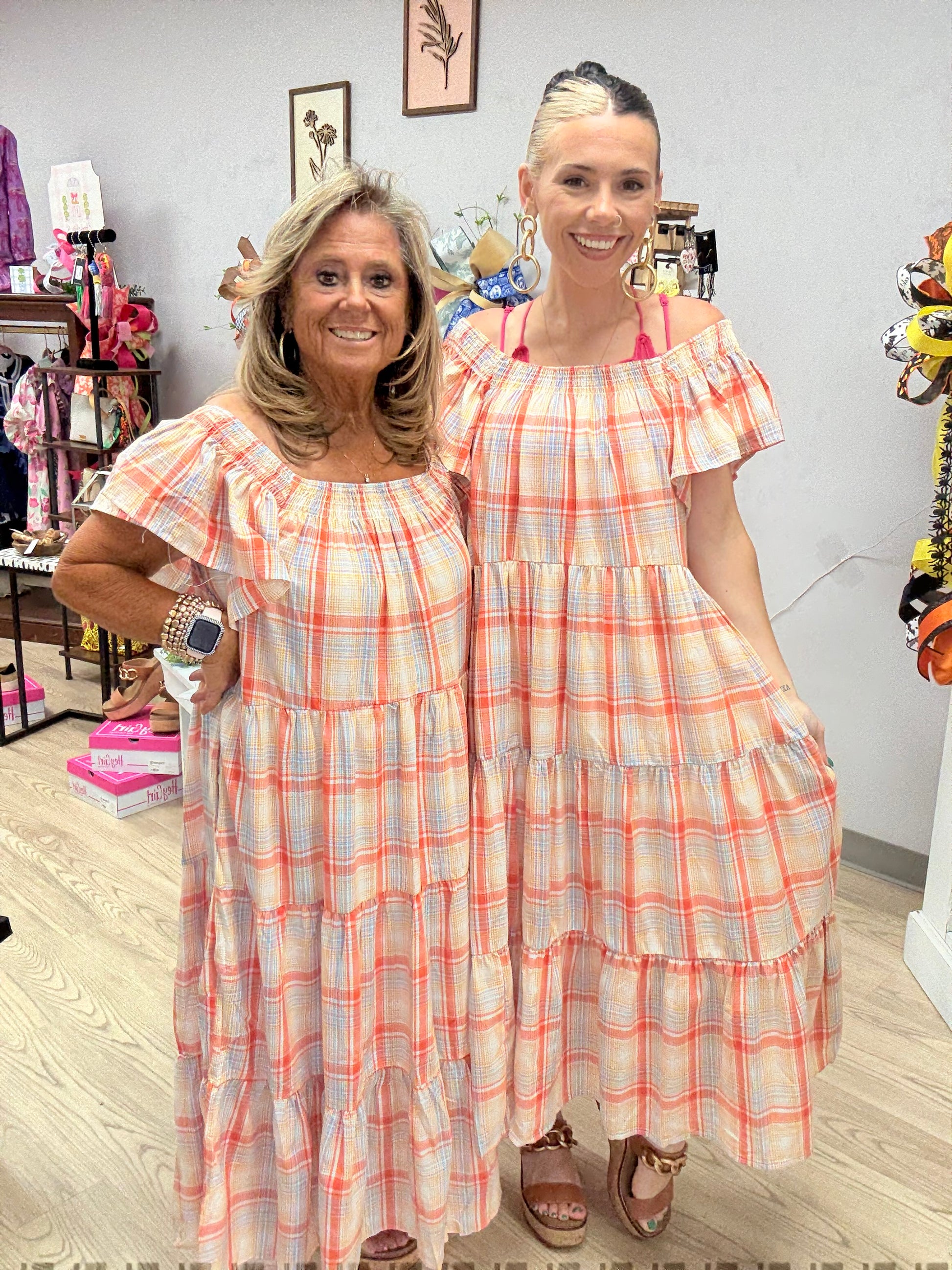 Elevate your fall wardrobe with the Full of Fall Maxi. This versatile dress features a stylish orange plaid print, ruffle sleeves, and functional pockets. Wear it on or off the shoulders for added versatility and enjoy the comfortable, true to size fit. Made with 100% cotton and fully lined for ultimate comfort.