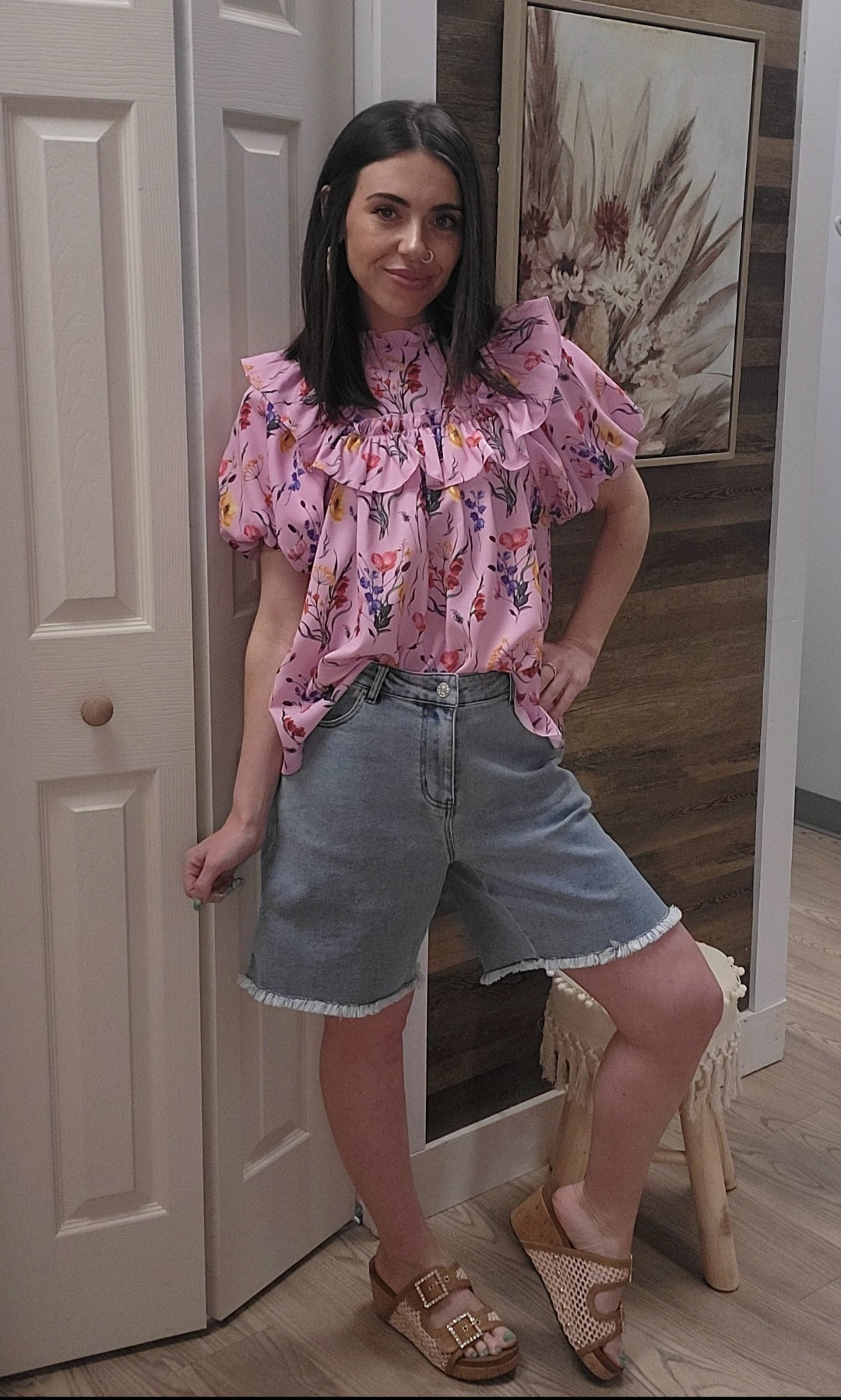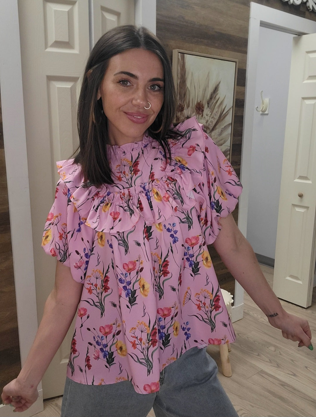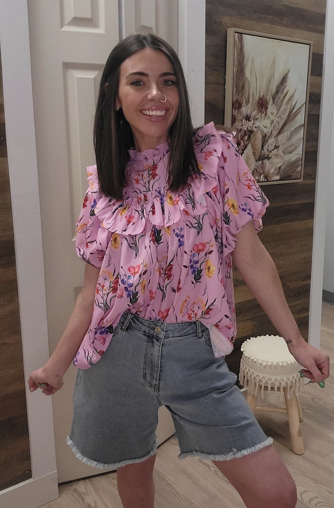 Experience the beauty and charm of the Garden of Love Top. With its delicate pink floral print, ruffle chest area, and puff sleeves, this top exudes femininity. The button closure in the back ensures a secure fit, while the 100% Polyester material adds durability. Stay stylish and comfortable in this true to size fit top.