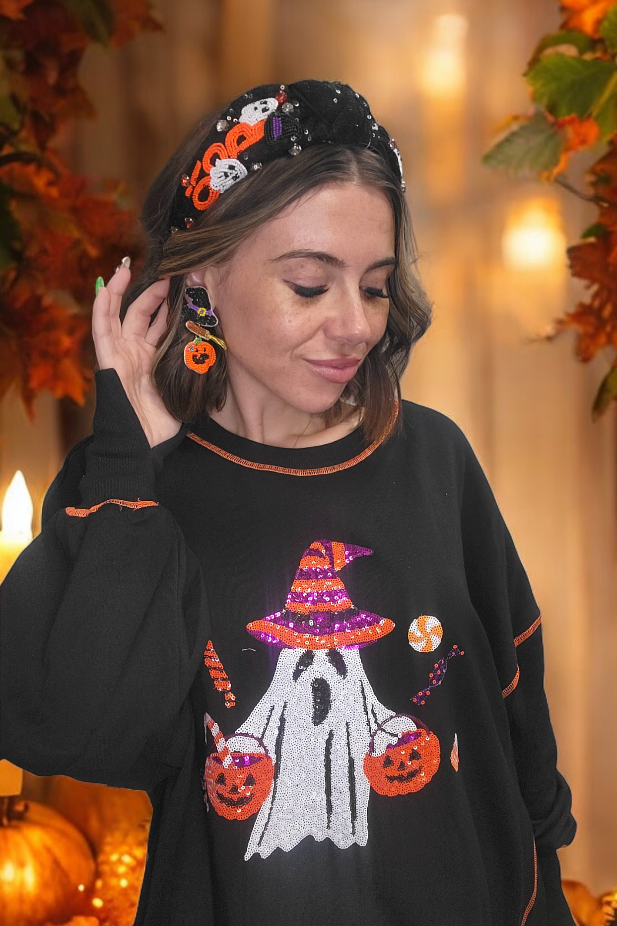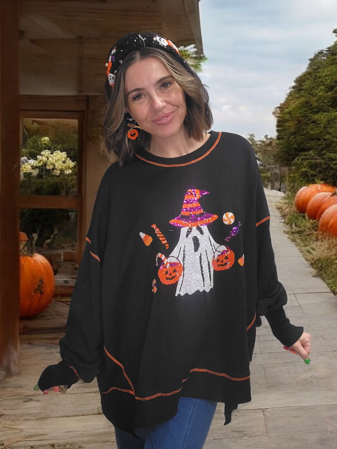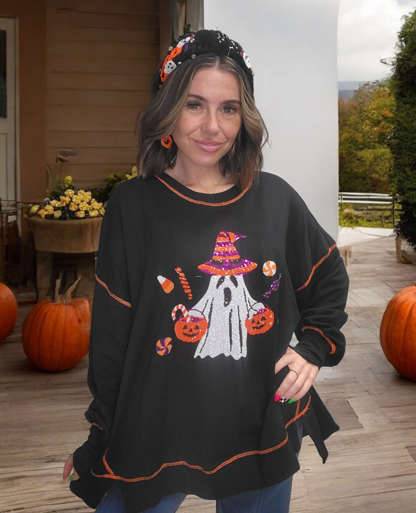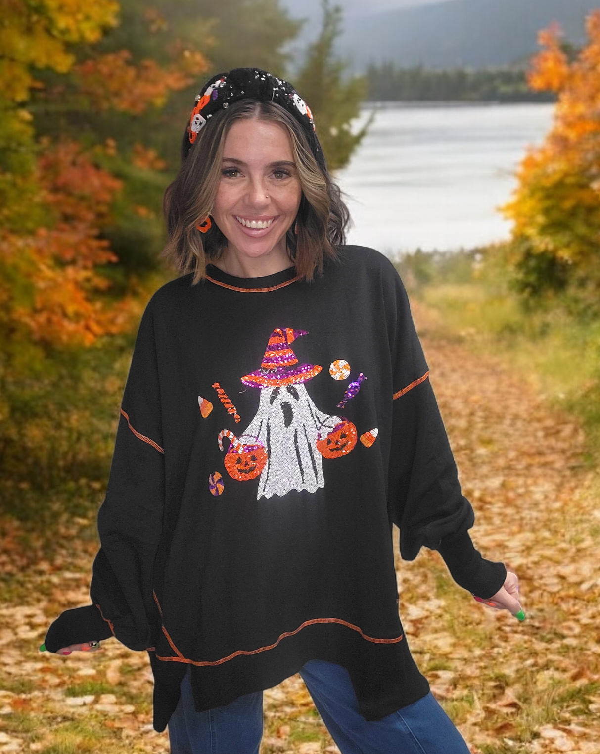 This Ghost-tastic Sequin Pullover features a playful sequin ghost and candy detail, adding a touch of whimsy to your outfit. Made with a blend of 85% cotton and 15% polyester, this hi-low pullover is very oversized and can be sized down by 2 sizes. Perfect for adding some character to your Halloween wardrobe.