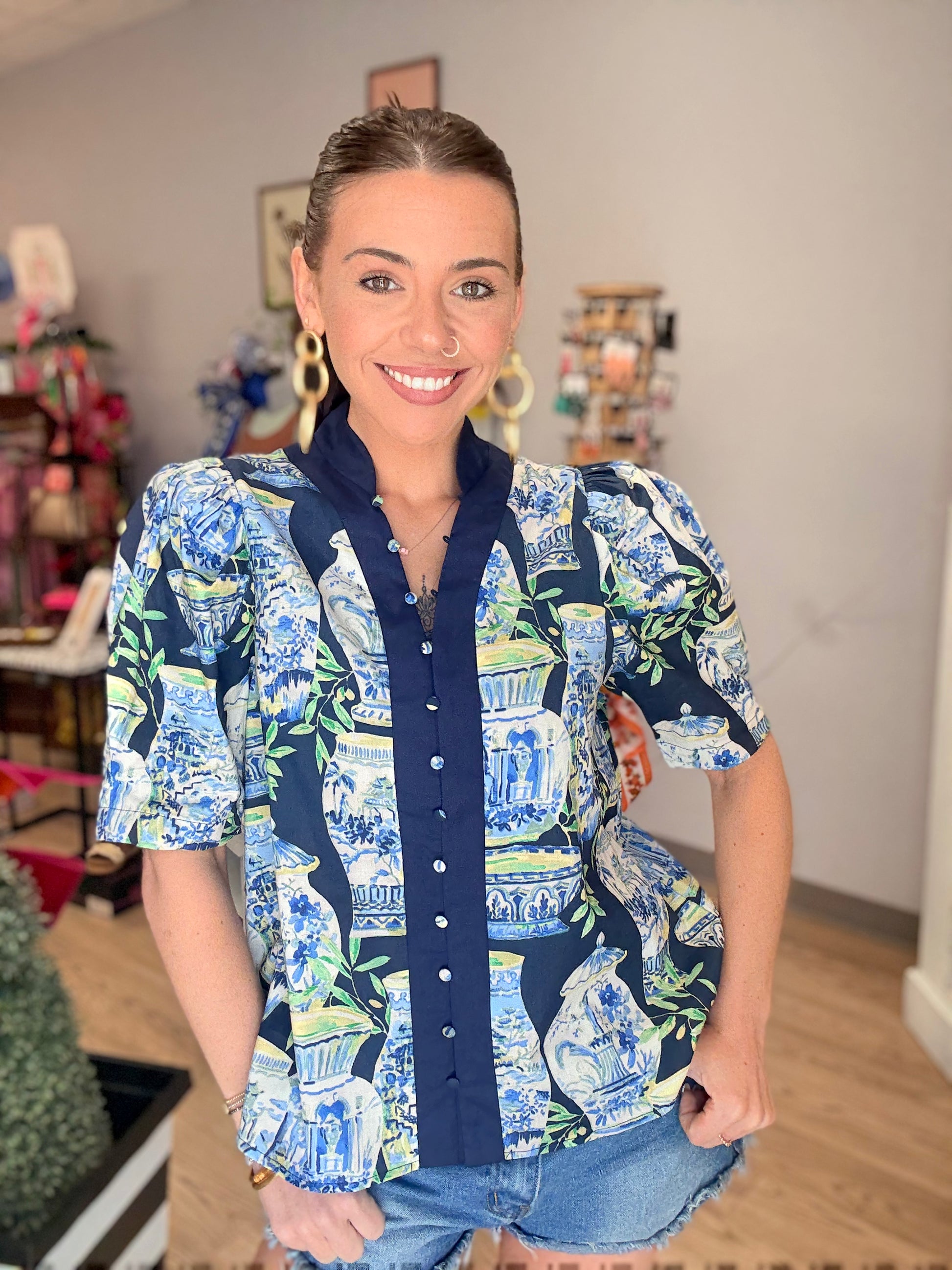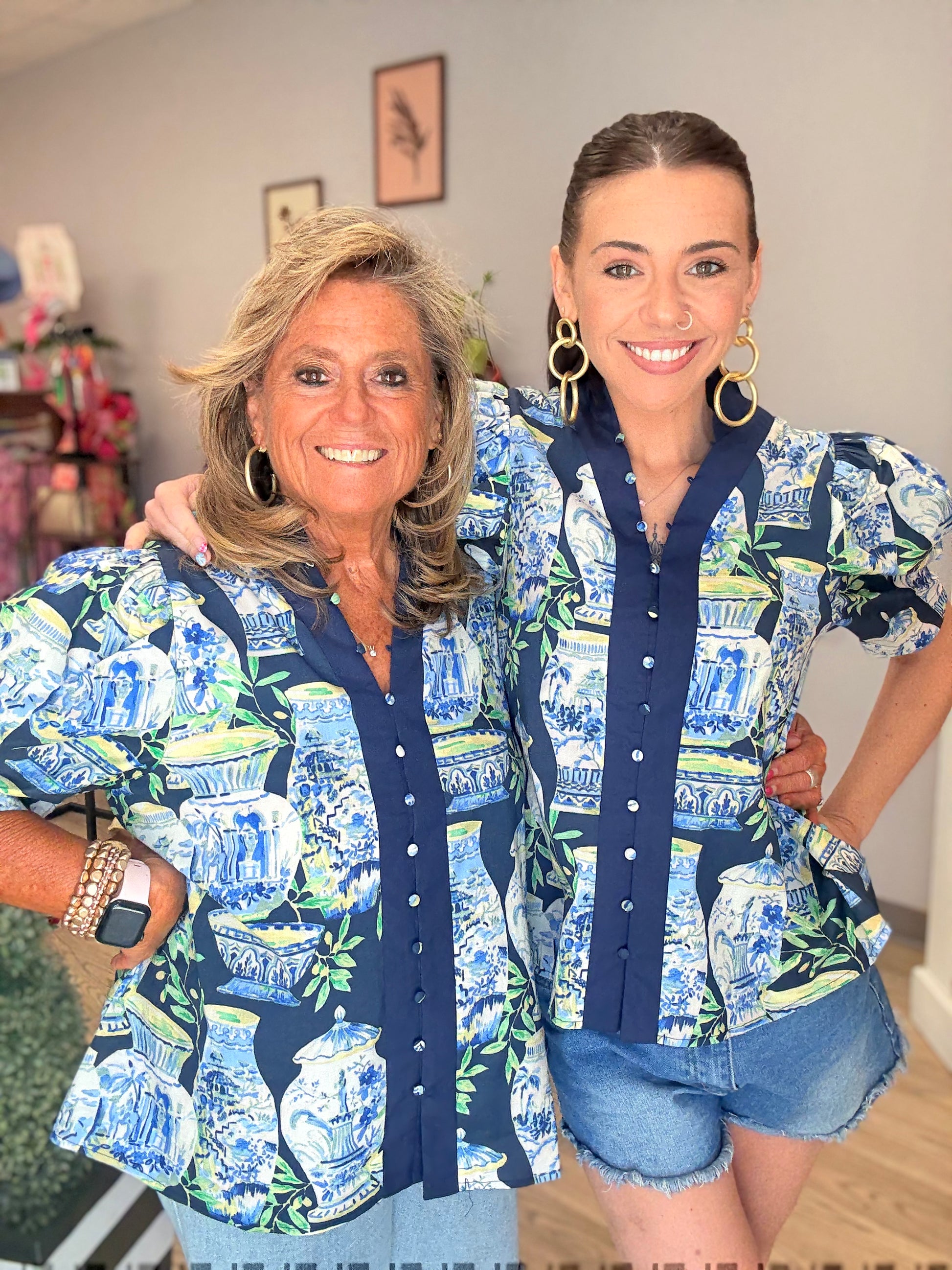 This 100% cotton button up top features a peach color with beautiful blue and white ginger jars. The puff sleeves add a touch of elegance, while the true to size fit ensures a comfortable and flattering wear. Perfect for any occasion, this top offers both style and comfort.