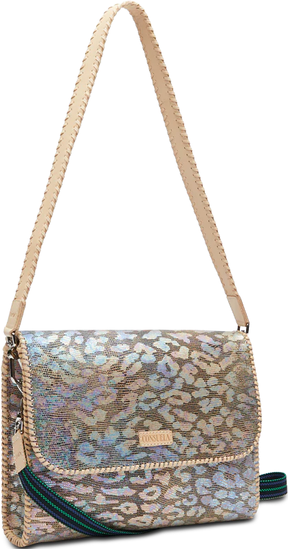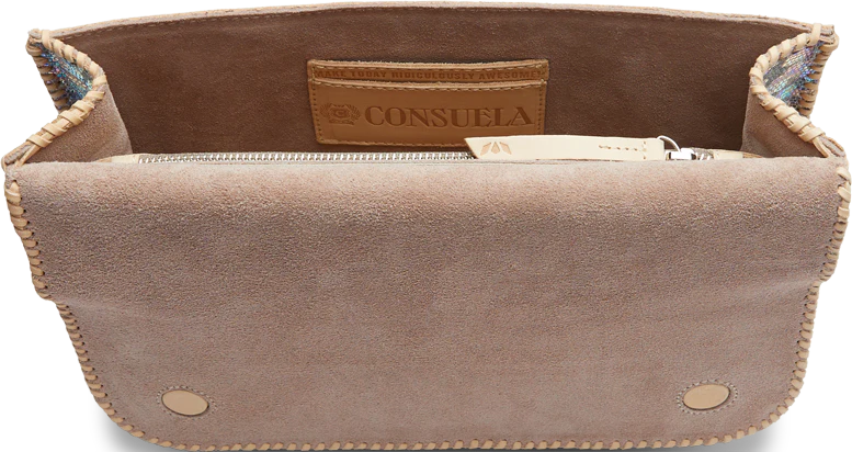 The Around Town features whipstitched leather trim and an open interior. This crossbody comes with a detachable leather strap and adjustable webbing crossbody strap, and can easily be converted into a clutch! Keep things organized with the interior zipper pocket and credit card pocket.