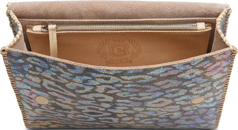 • Textured leather with iridescent jag print exterior
