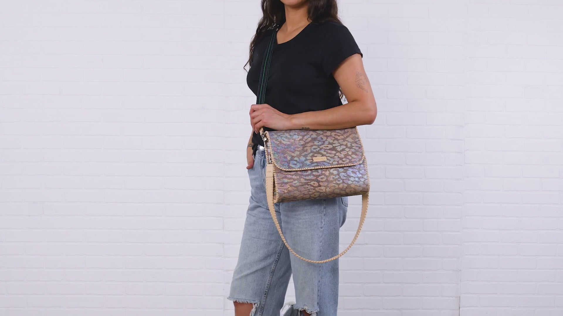 • Natural leather shoulder strap & woven crossbody strap included