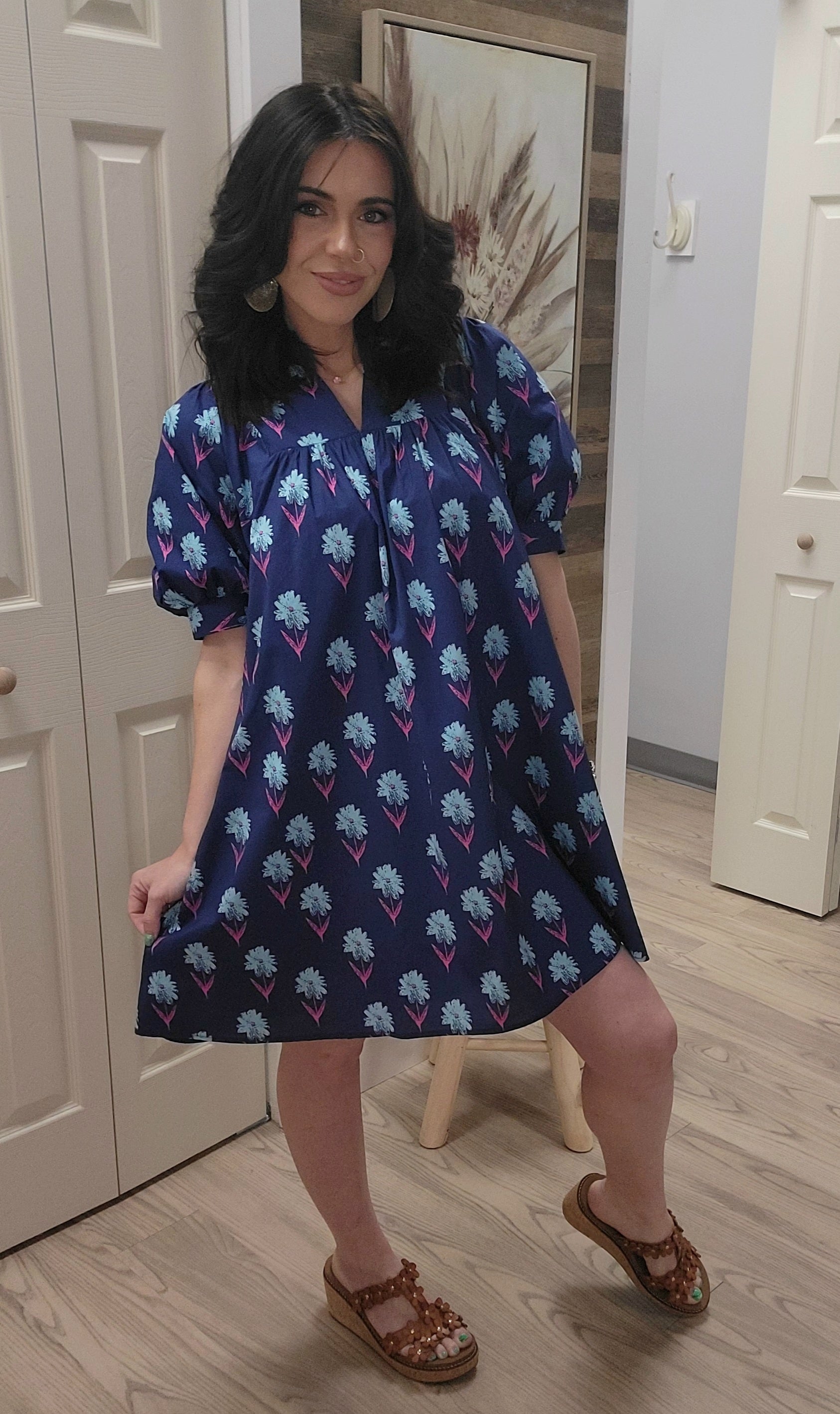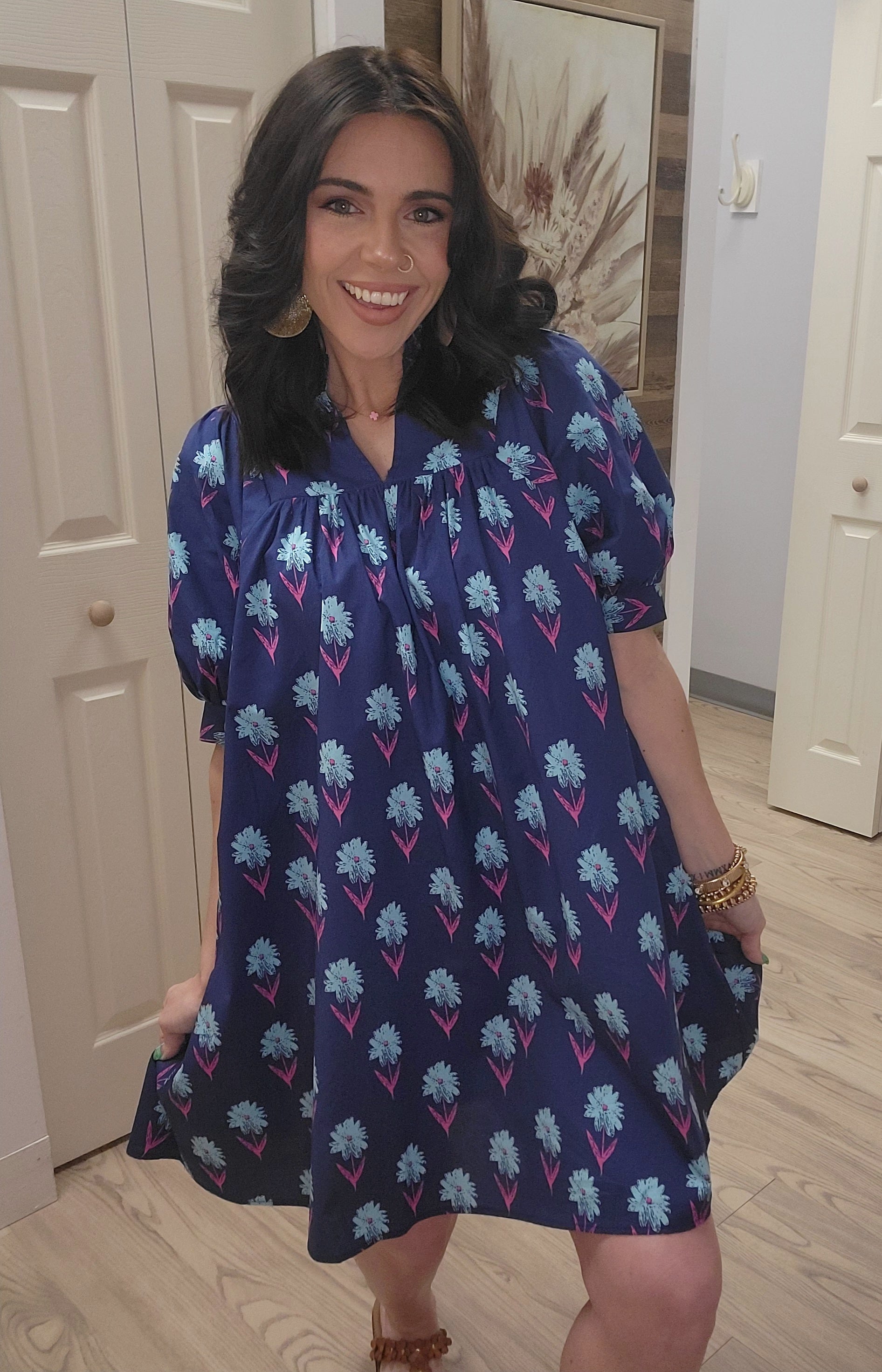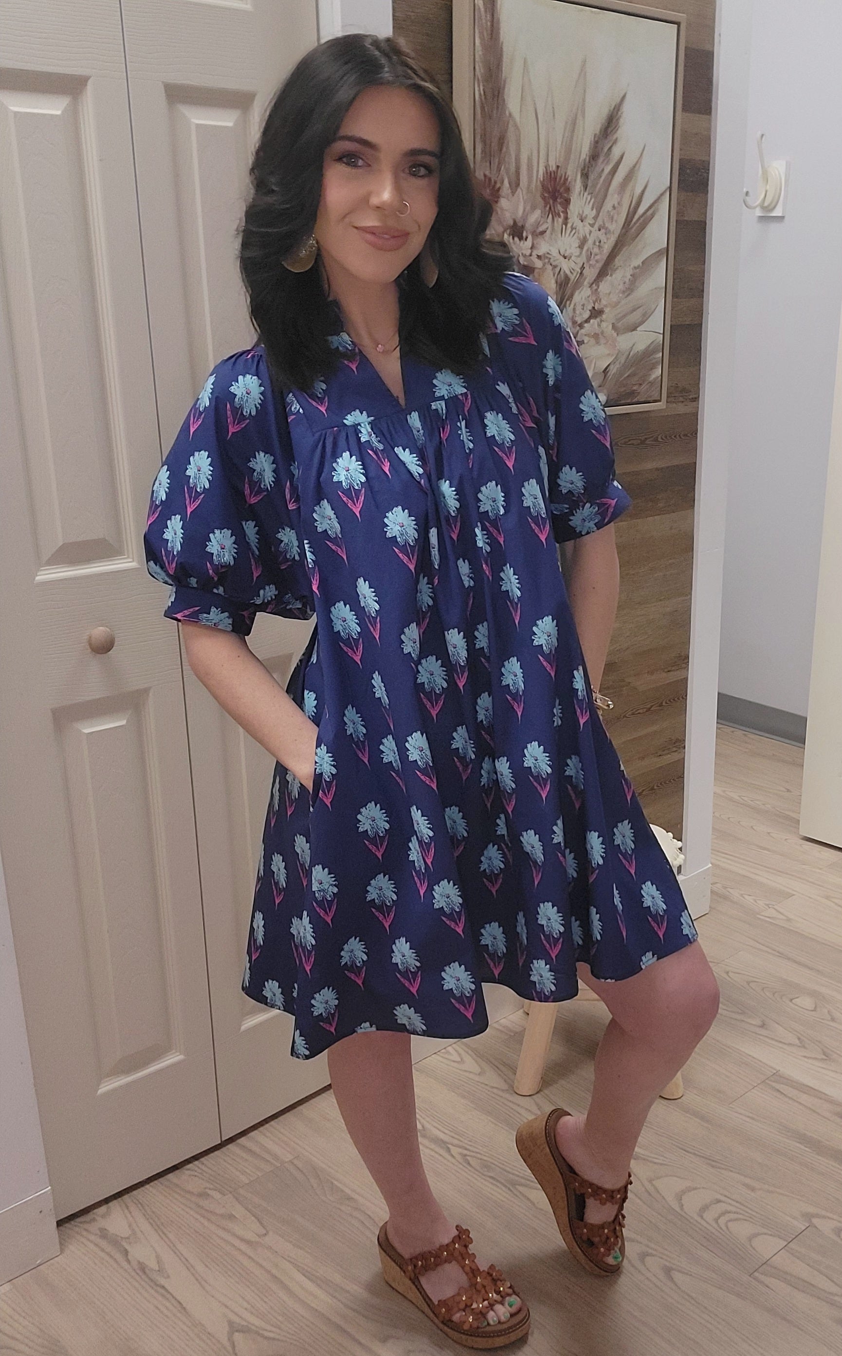 This blue and pink floral dress boasts a beautiful color combination and functional pockets. In a true to size fit, it is the perfect addition to any wardrobe. Expertly crafted with a professional tone, this dress is a must-have for any fashion savvy individual.