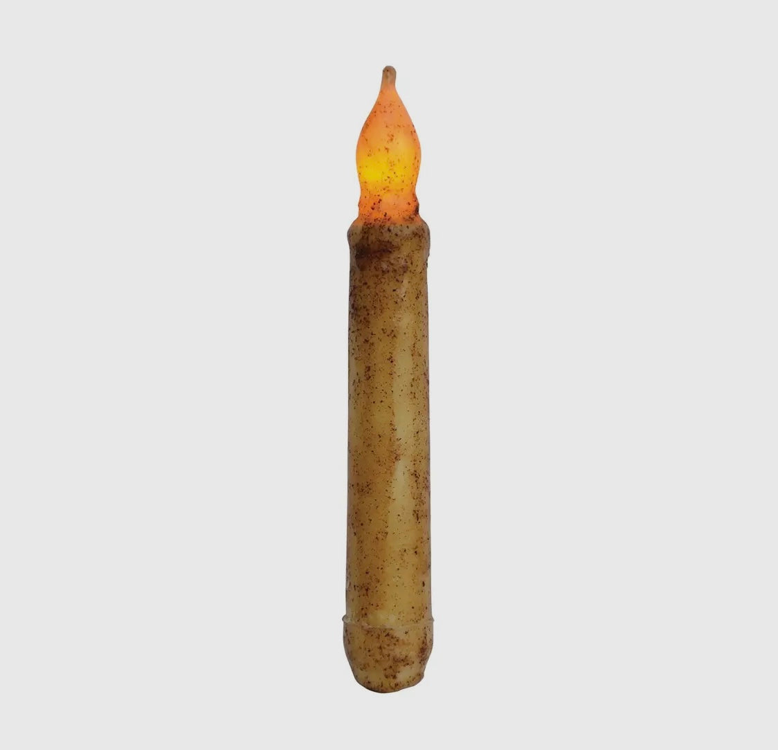 Burnt Ivory Timer Taper is a 6" LED with a golden, antiqued wax coating with a primitive texture, and features a built in timer. The candle stays on for 6 hours and then turns off for 18 hours. Requires two AA batteries (not included).