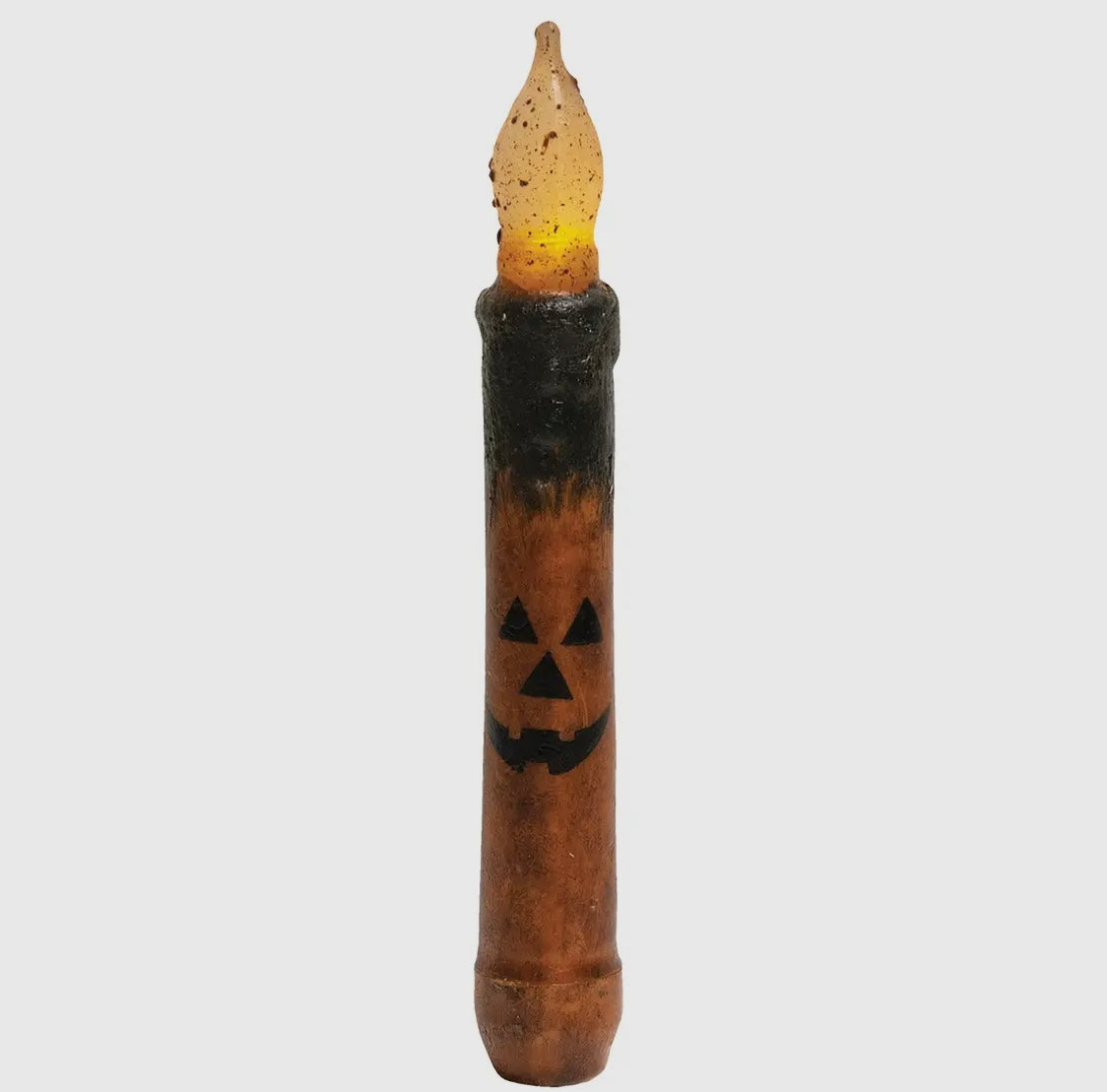Halloween Timer Taper is a battery-operated taper candle with a grungy wax coating that features a Halloween design. Taper is dipped in brown wax with a darker, almost black, drip-like effect just below the warm, flickering taper bulb. Taper includes a built-in timer features that keeps the candle lit for 6 hours, then off for 18 hours, repeating the cycle automatically each day. The cycle begins automatically once 2 AA batteries are inserted into the taper (not included). Measures 6.5" high.