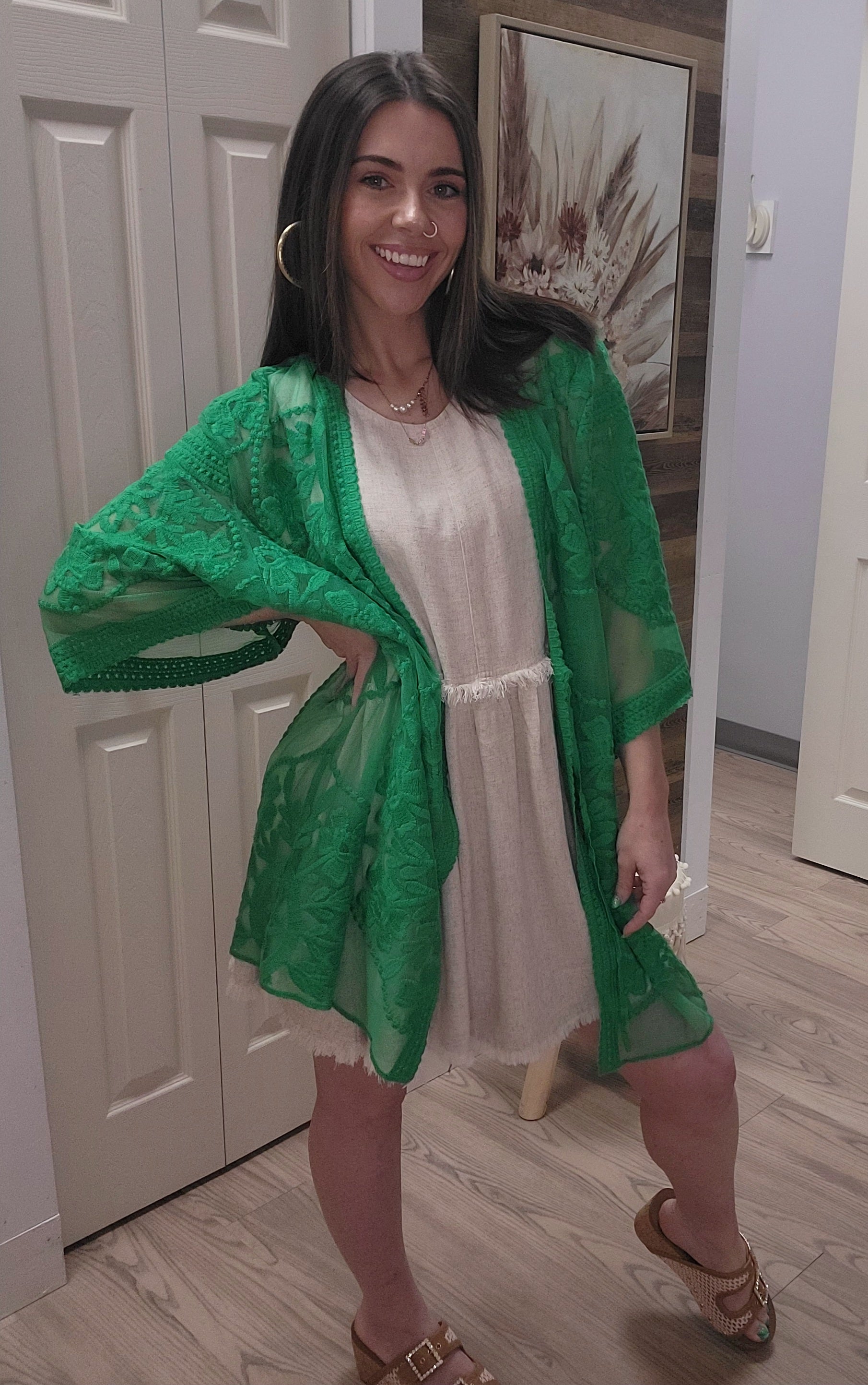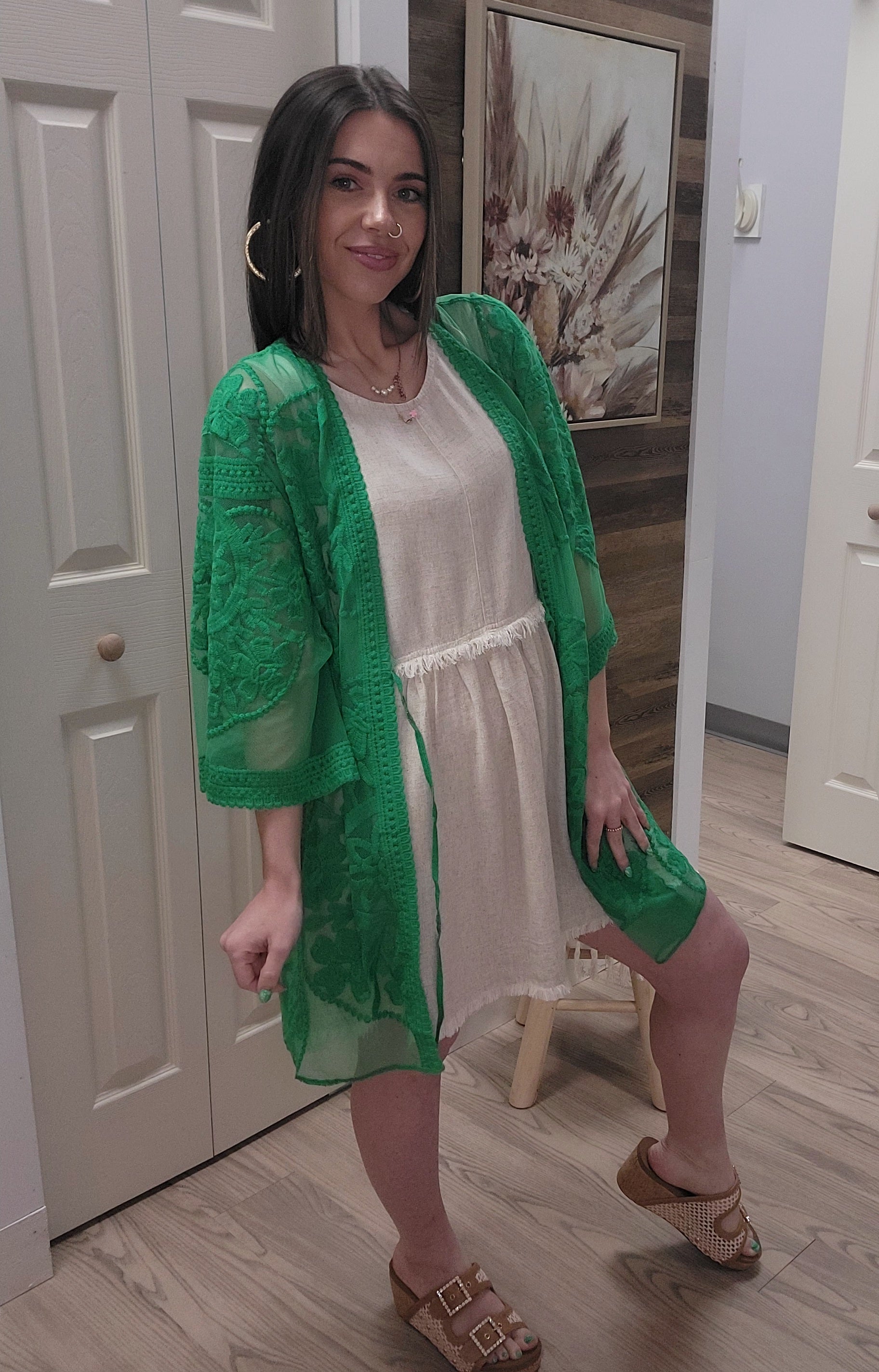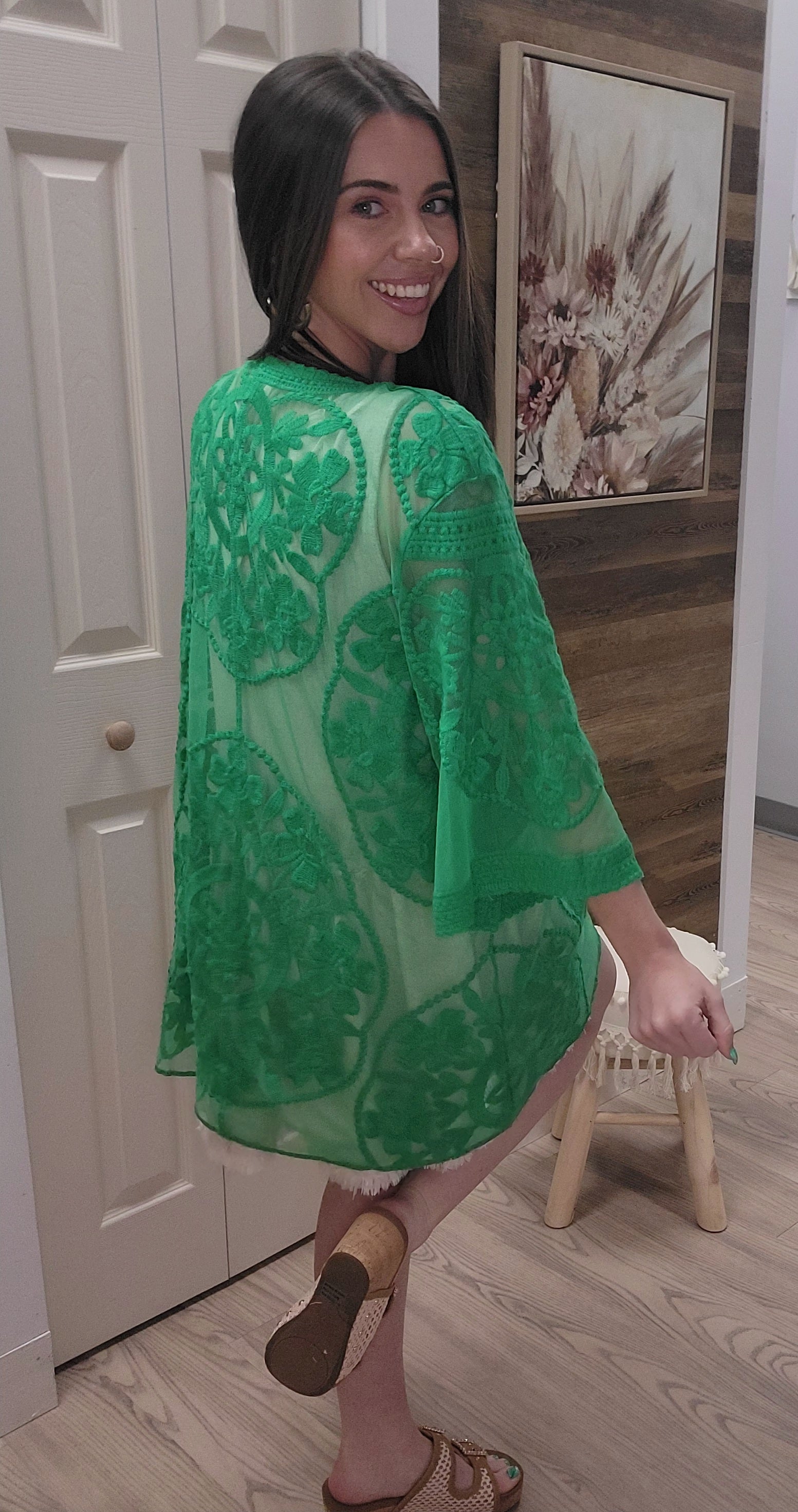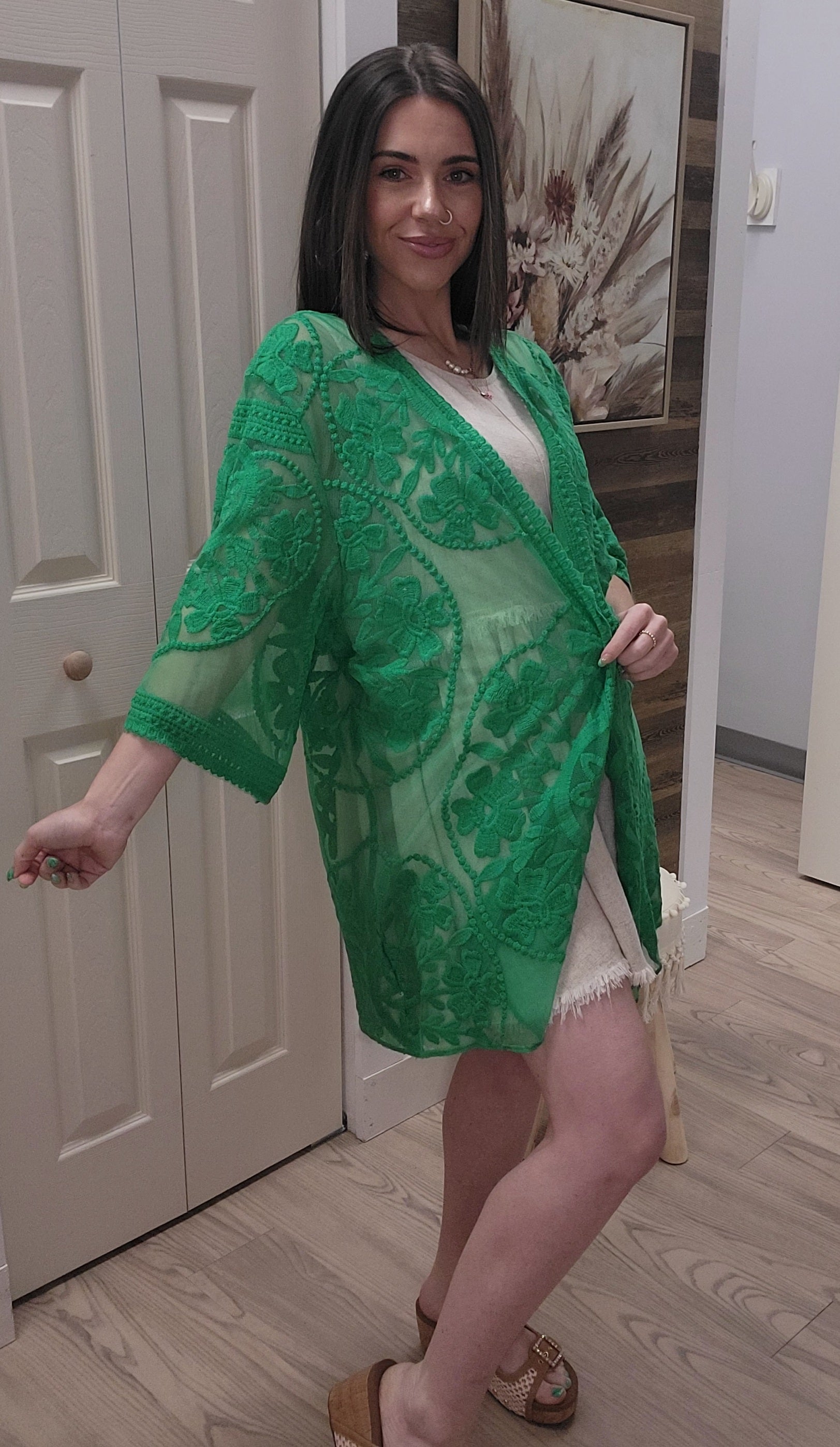Elevate your beach attire with our Kelly Green Kimono. Featuring stunning floral designs, this true to size kimono adds a touch of elegance to your look. Perfect for use as a beach cover up, it's both fashionable and functional. Don't miss out on this beautiful addition to your wardrobe. Made from 60% cotton & 40% Polyester