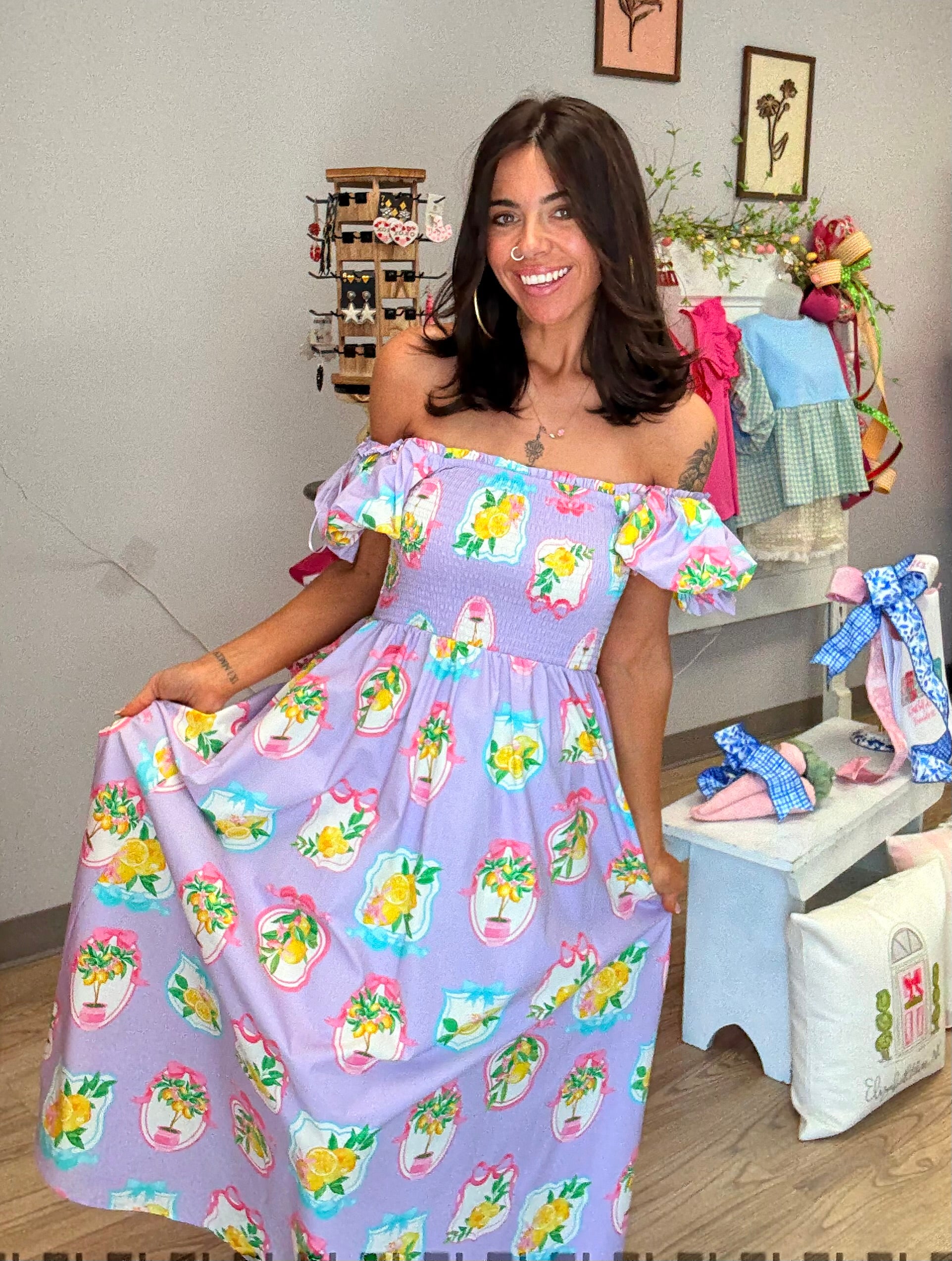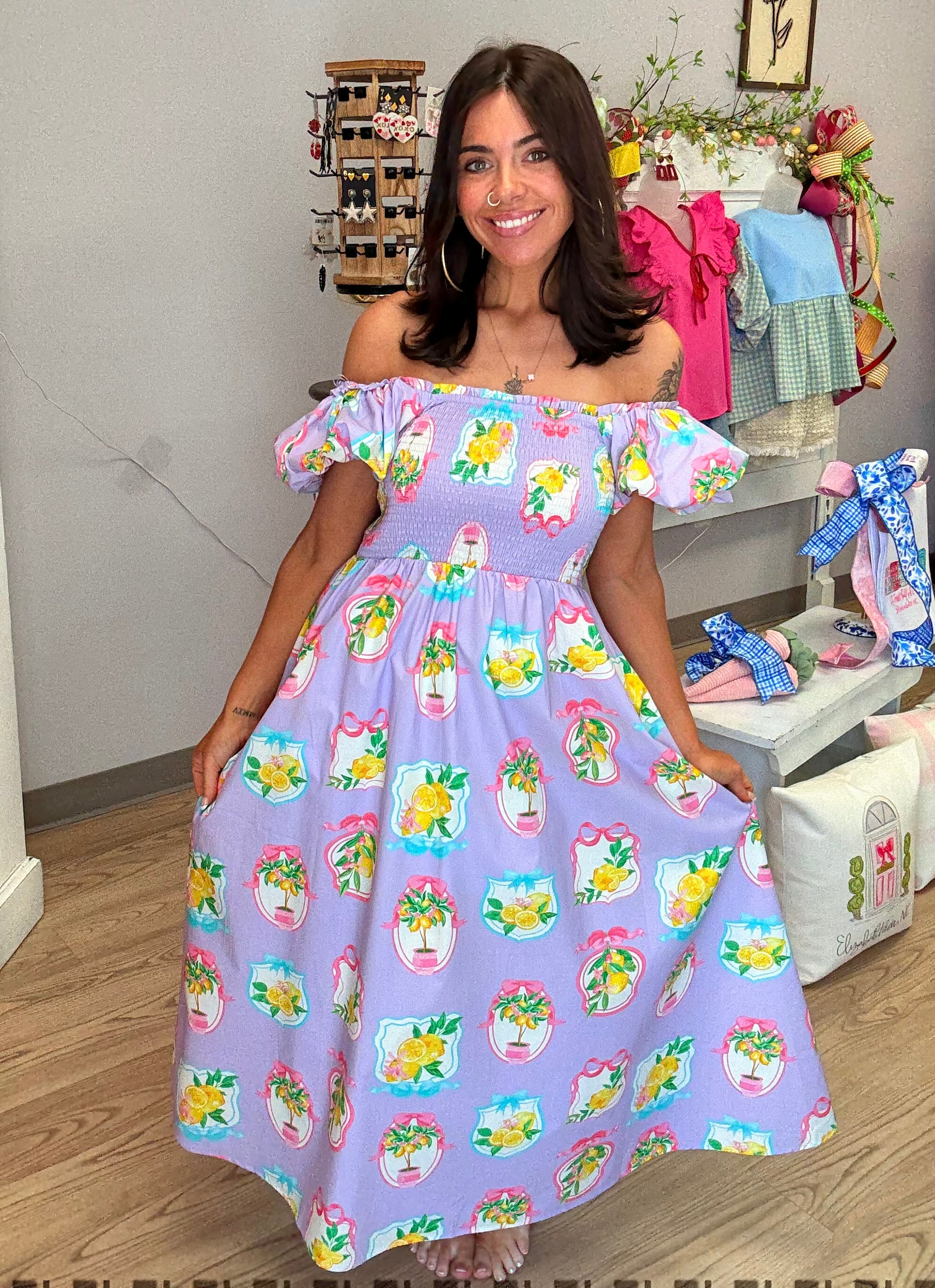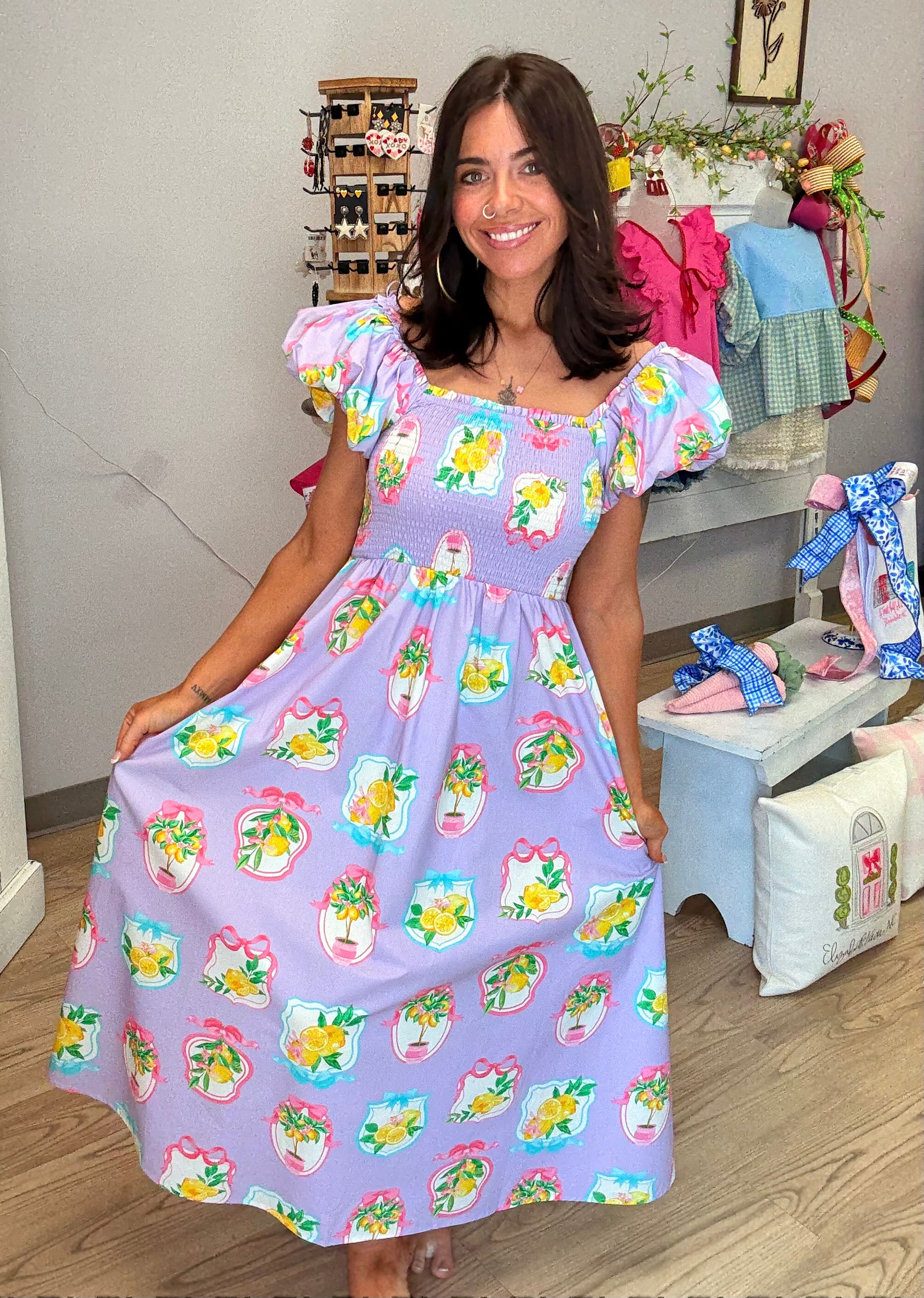 As a product expert, trust the True to Size Life Gives You Lemons Dress with midi length, vibrant purple hue, and detailed lemon tree prints. The smocked elastic chest area guarantees comfort, while the functional pockets add practicality. Plus, the puff sleeves give off a stylish and trendy look. Material is 100% Cotton.