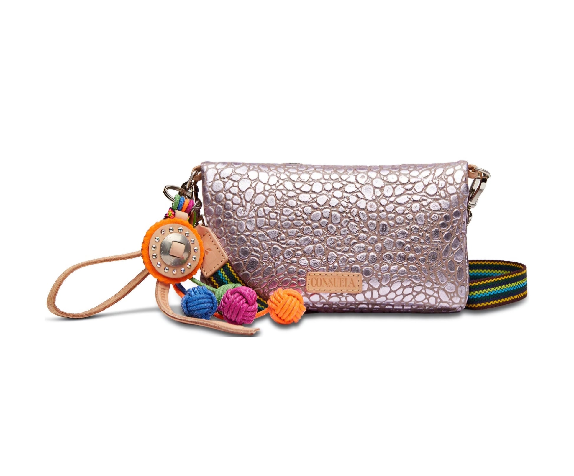 Included detachable wristlet strap and adjustable woven crossbody strap
