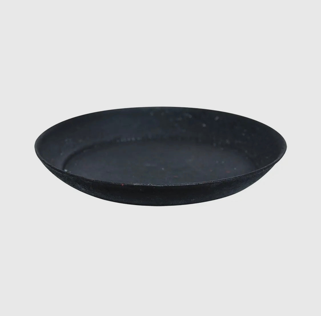 This black matte metal Rustic Pie Pan is a shallow dish perfect for holding pillar candles. It is 4" in diameter.