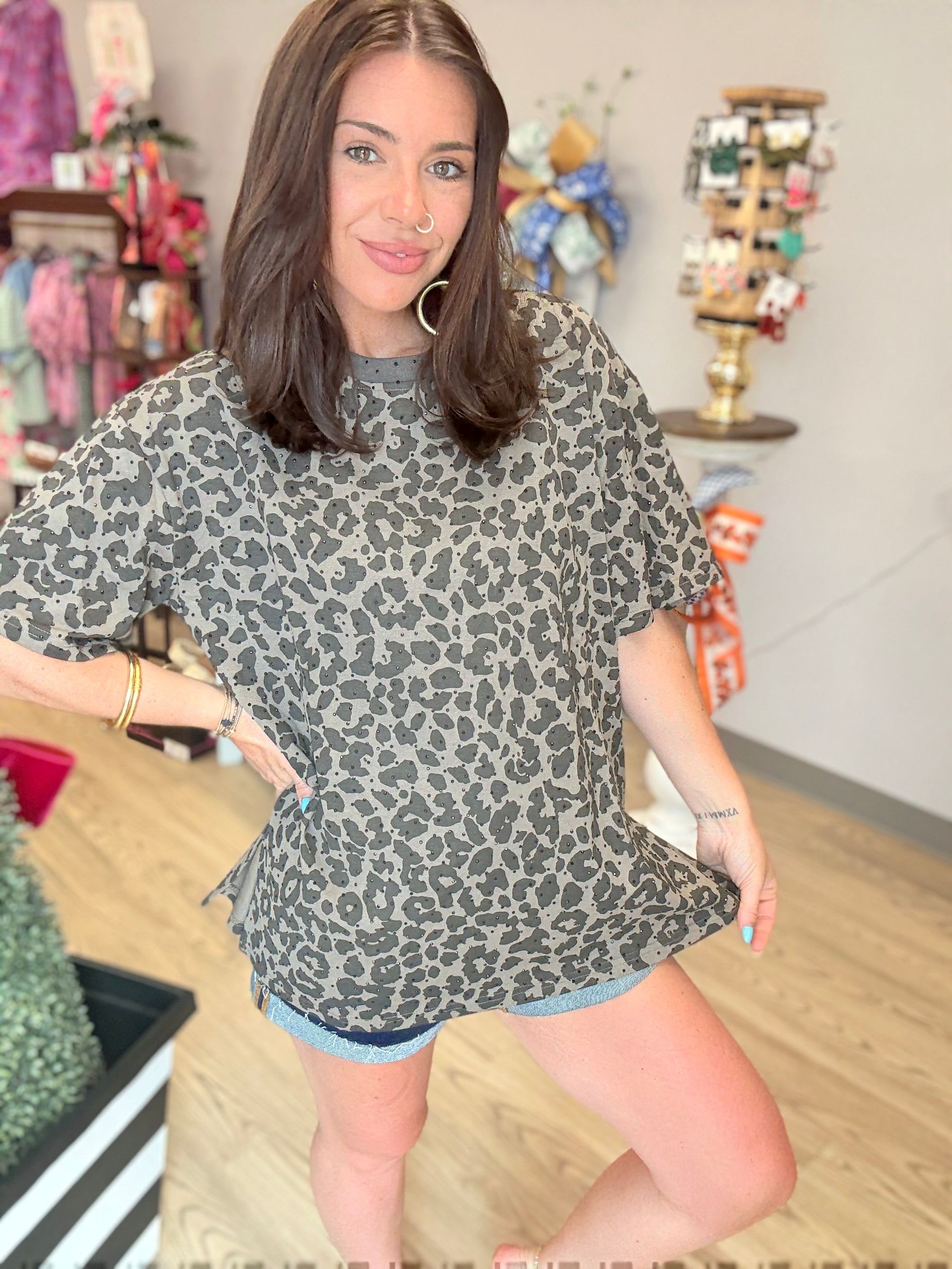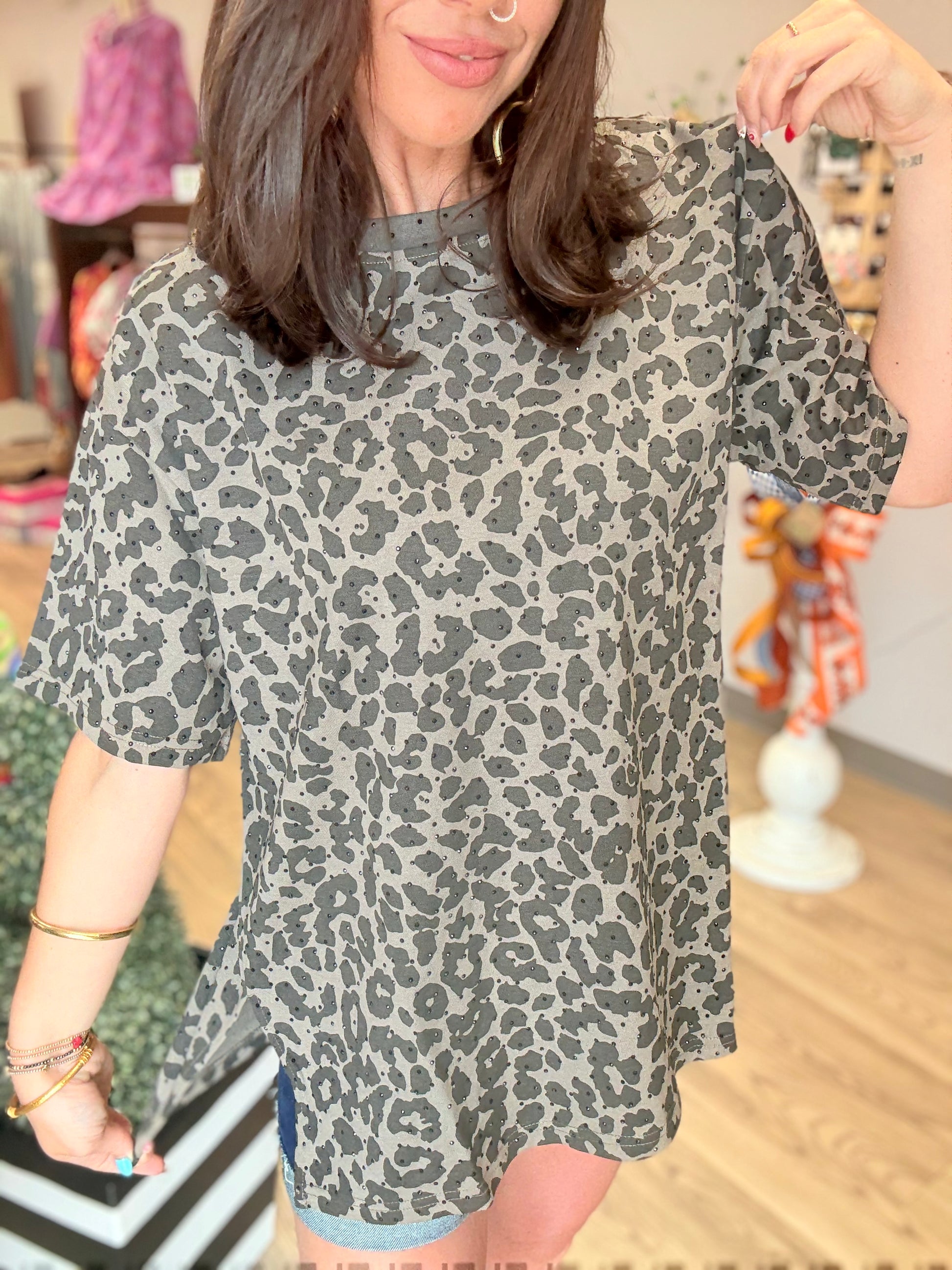 This dark cheetah print oversized tee is the perfect combination of style and comfort. The rhinestone detailing adds a touch of glamour while the 100% cotton material ensures breathability. With an oversized fit and side slits, it's a versatile addition to any wardrobe.