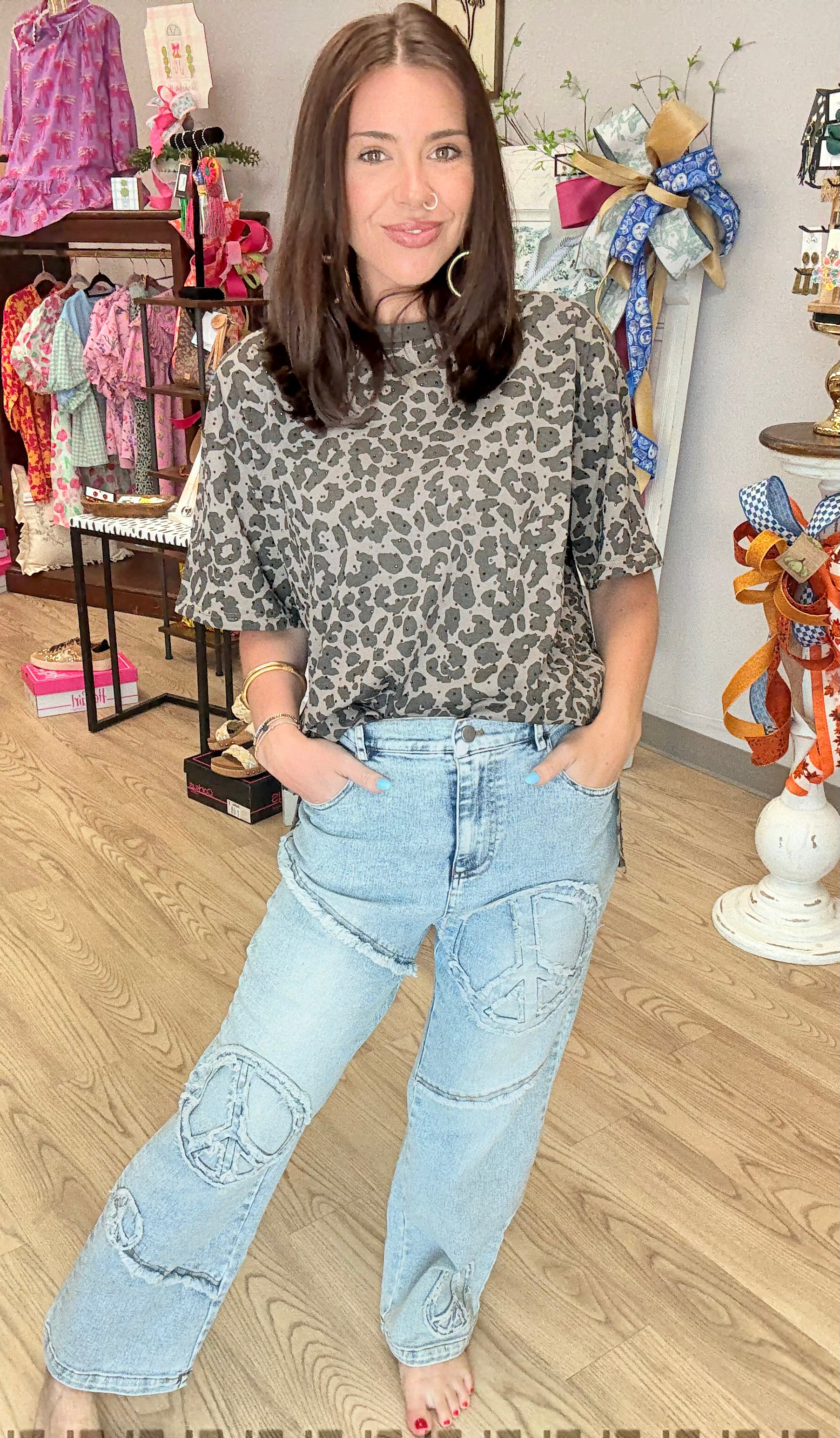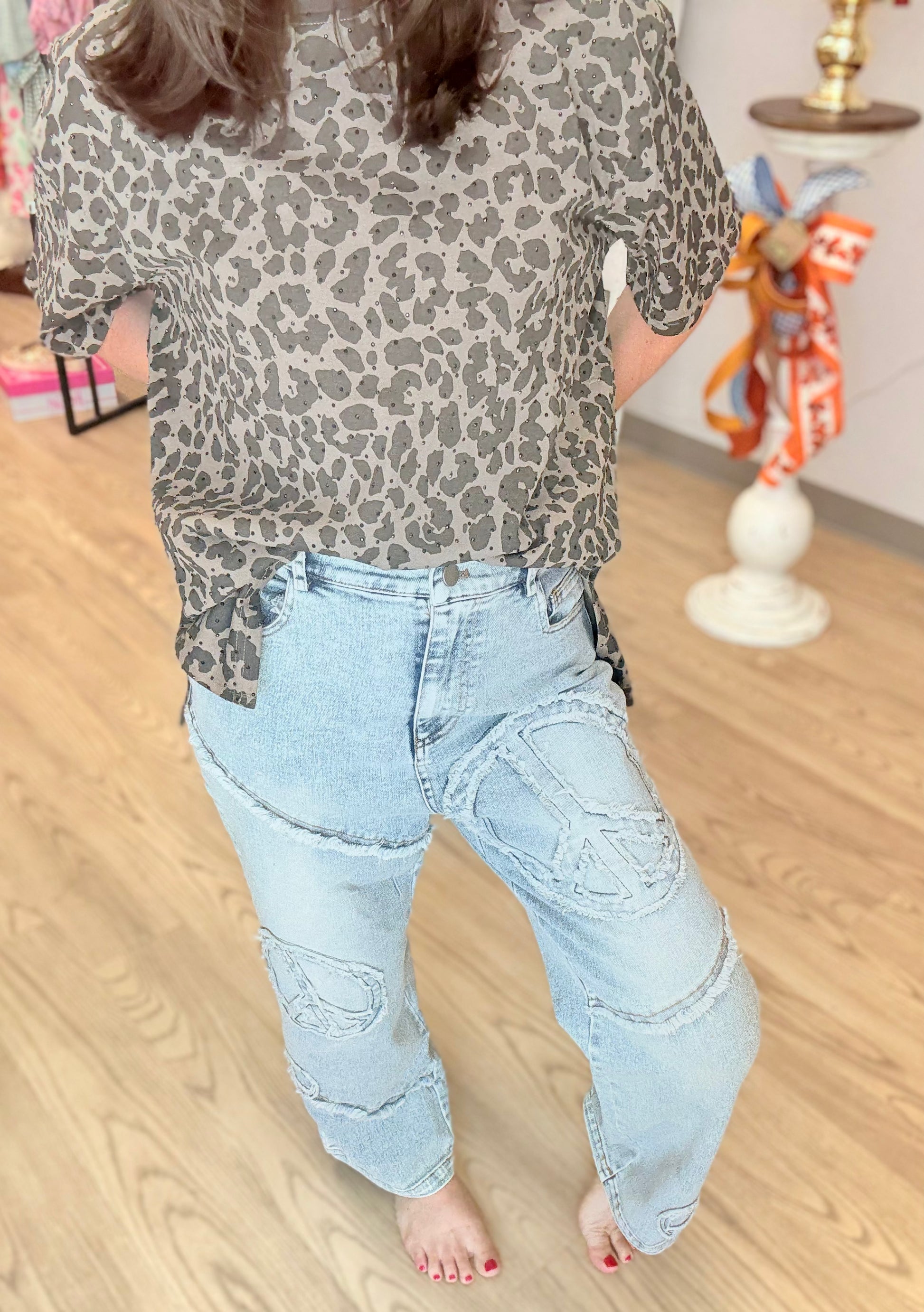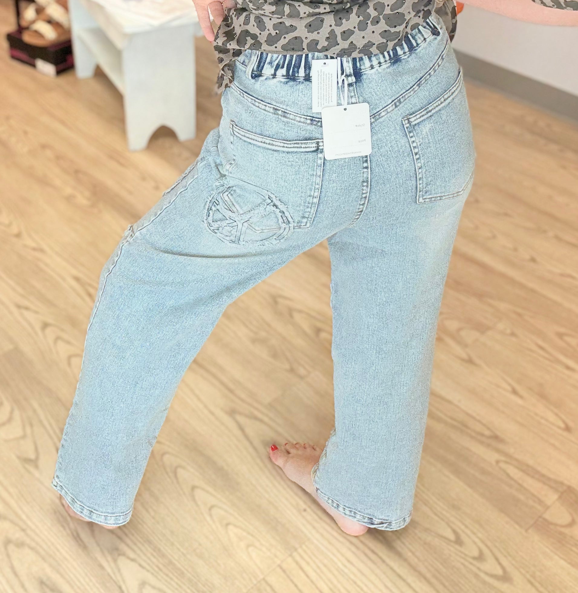 "Expertly made with an elastic waist and a peace sign fringe patch on the front and back, these Peace Sign Denim jeans offer a comfortable and stylish fit. Designed as a straight fit Jean - they also provide flexibility for those in between sizes to size down for a better fit."