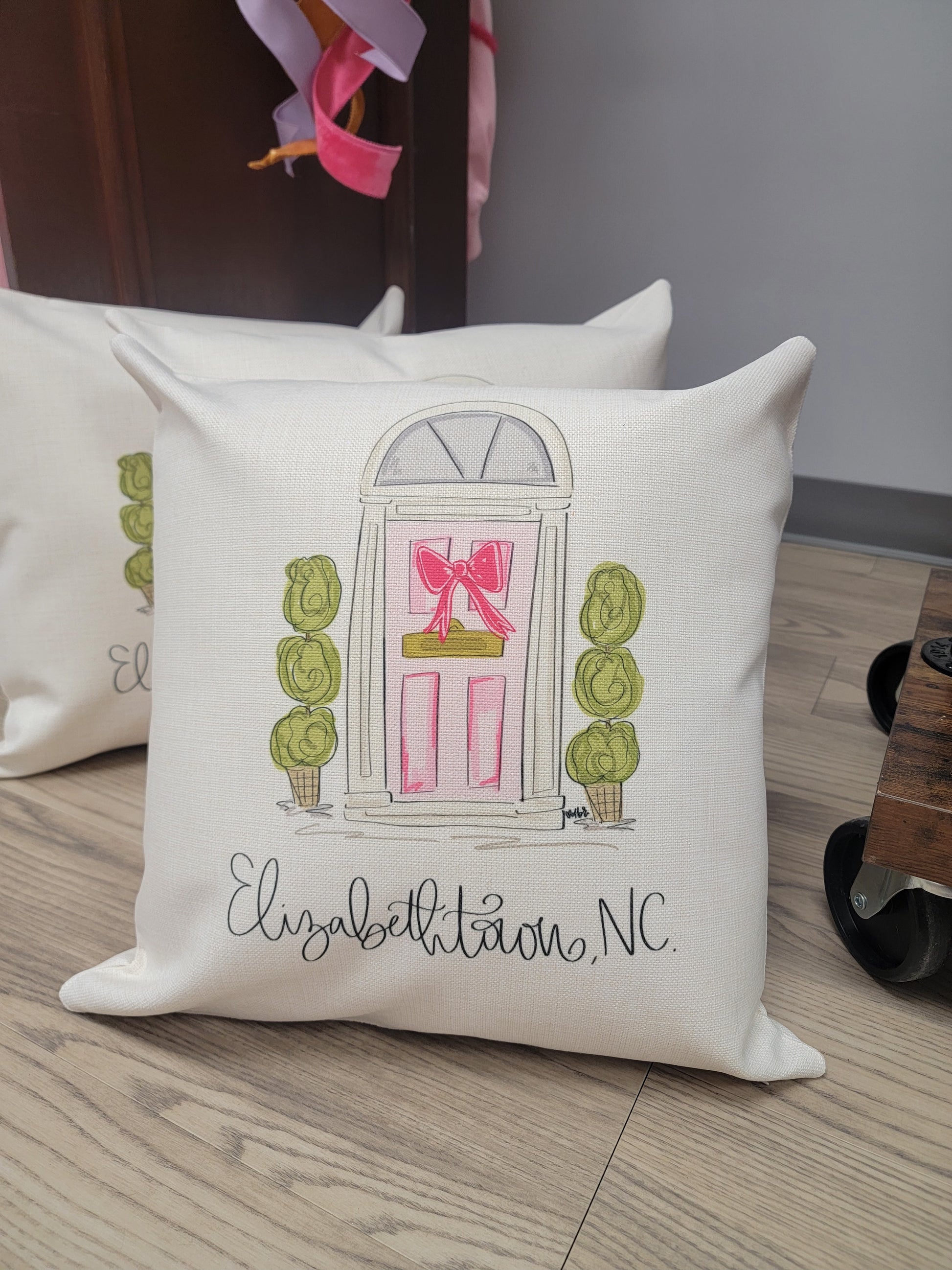 A cute, decorative throw pillow for your home! Measures 18x18 with a 20x20 insert. Canvas fabric. Spot clean only.