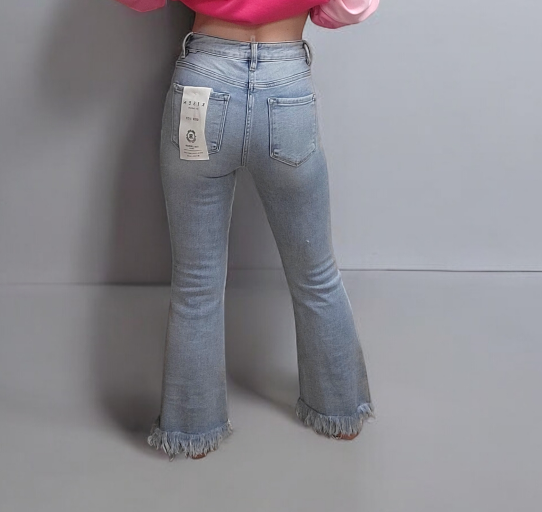 "Risen Tummy Control Jeans are the perfect blend of comfort and style. With their high rise design, these jeans provide tummy control for a flattering silhouette. The light weight material makes them easy to wear all day. Complete your look with the frayed hem for a touch of edginess."