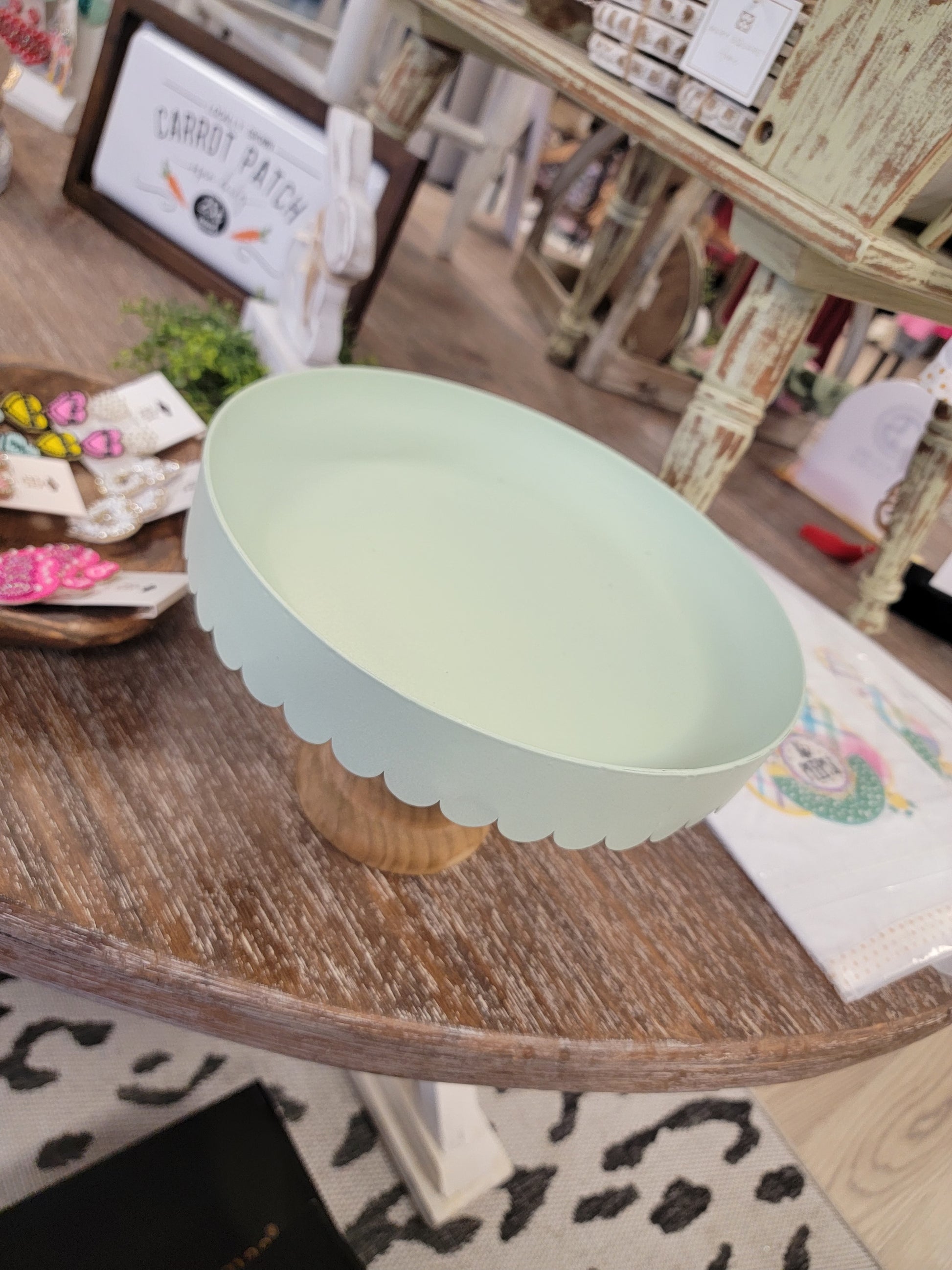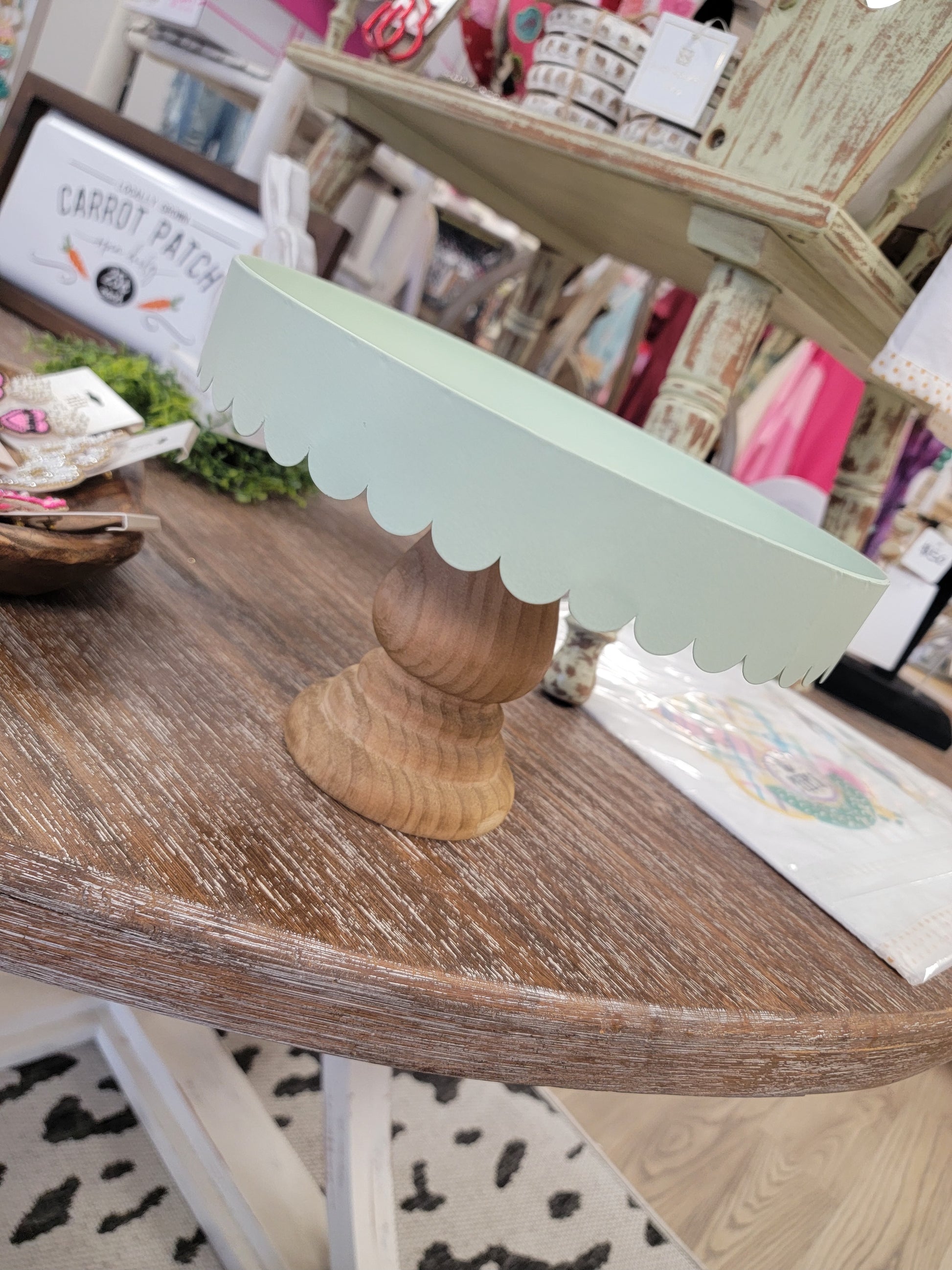 Colors: Sage green, natural wood (Charming Elegance) Transform any setting with these delightful Sage Scallop Decor Stands. Their soft sage green scalloped edges paired with the warm, rustic wood base add a perfect blend of whimsy and elegance to your decor. These stands, available in two sizes, are ideal for showcasing desserts, centerpieces, or cherished items with a charming touch that invites conversation and admiration.