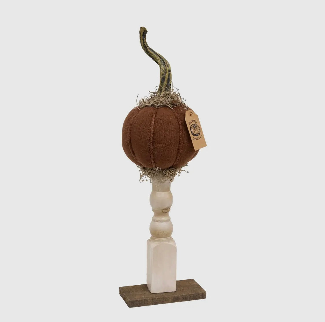 The Primitive Mossy Top Pumpkin on Pedestal makes a unique rustic addition to decorative Autumnal displays. The wooden pedestal features a white-painted pillar and a natural rustic base. A plush pumpkin with a dark orange fabric finish tops the pedestal. The pumpkin is accented by dark orange yarn, dried moss, and a rustic twisted stem. A brown paper tag is pinned to the pumpkin and reads, “harvest greetings.” Measures 16” high. The pedestal base measures 4.5” wide by 2.5” deep, and the pumpkin measures 7.5” high by 4.5” in diameter.