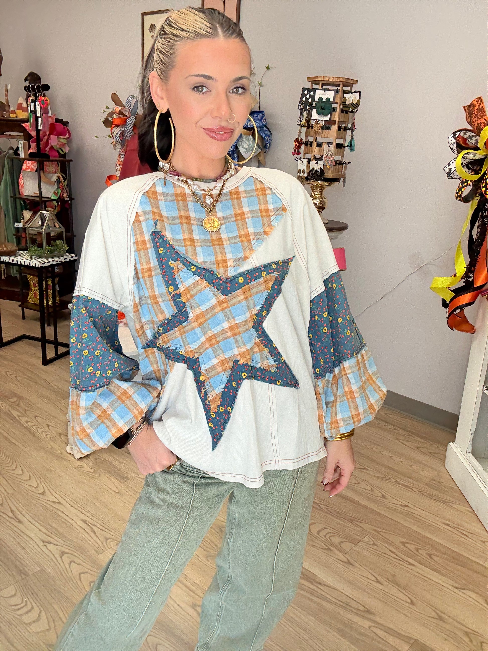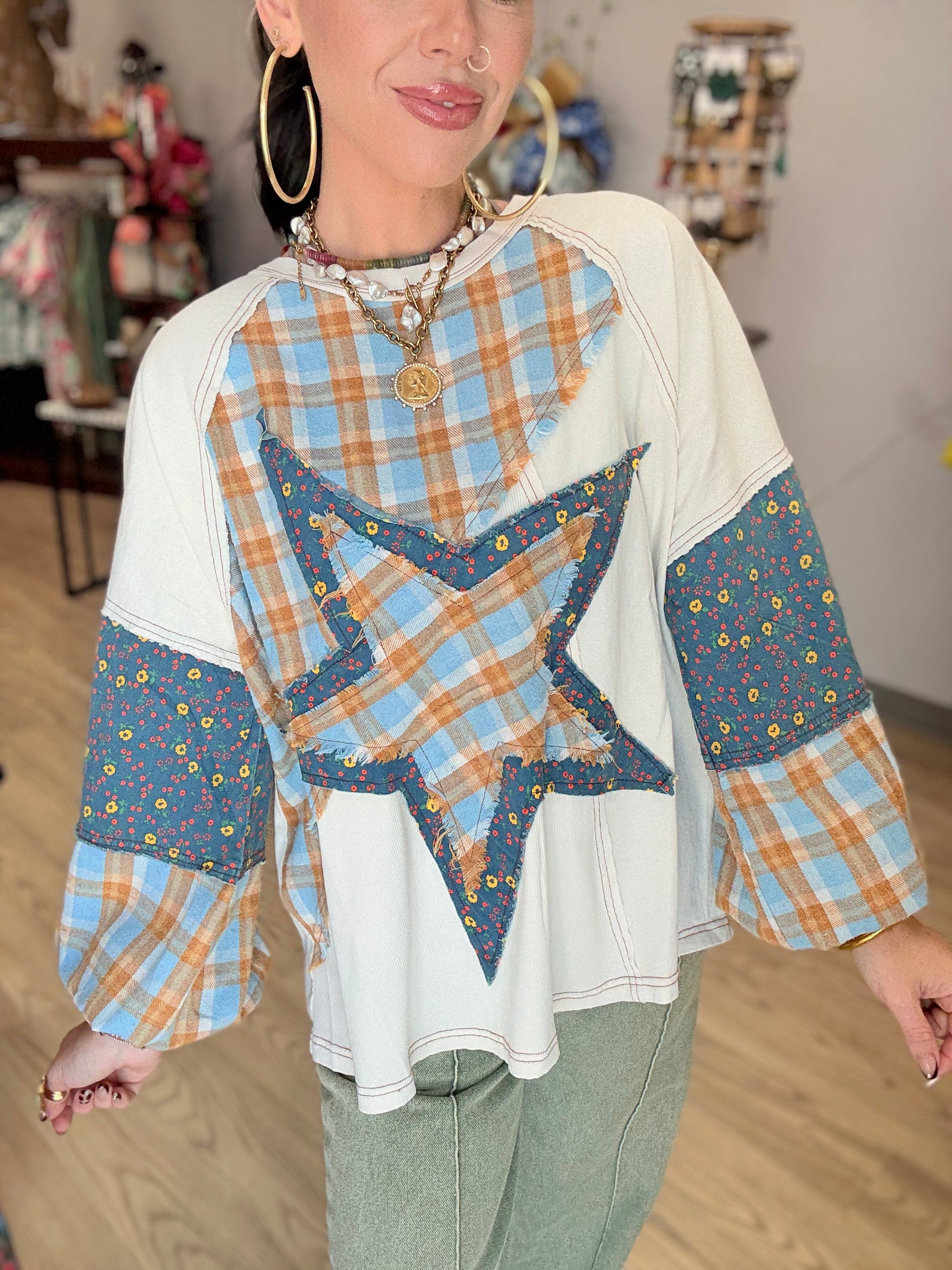 This Star of the Show Top boasts a unique star patchwork detail and a charming floral and plaid print. With its oversized fit and 100% cotton material, you'll feel comfortable and stylish all day long. Perfect for adding a touch of playfulness to any outfit.