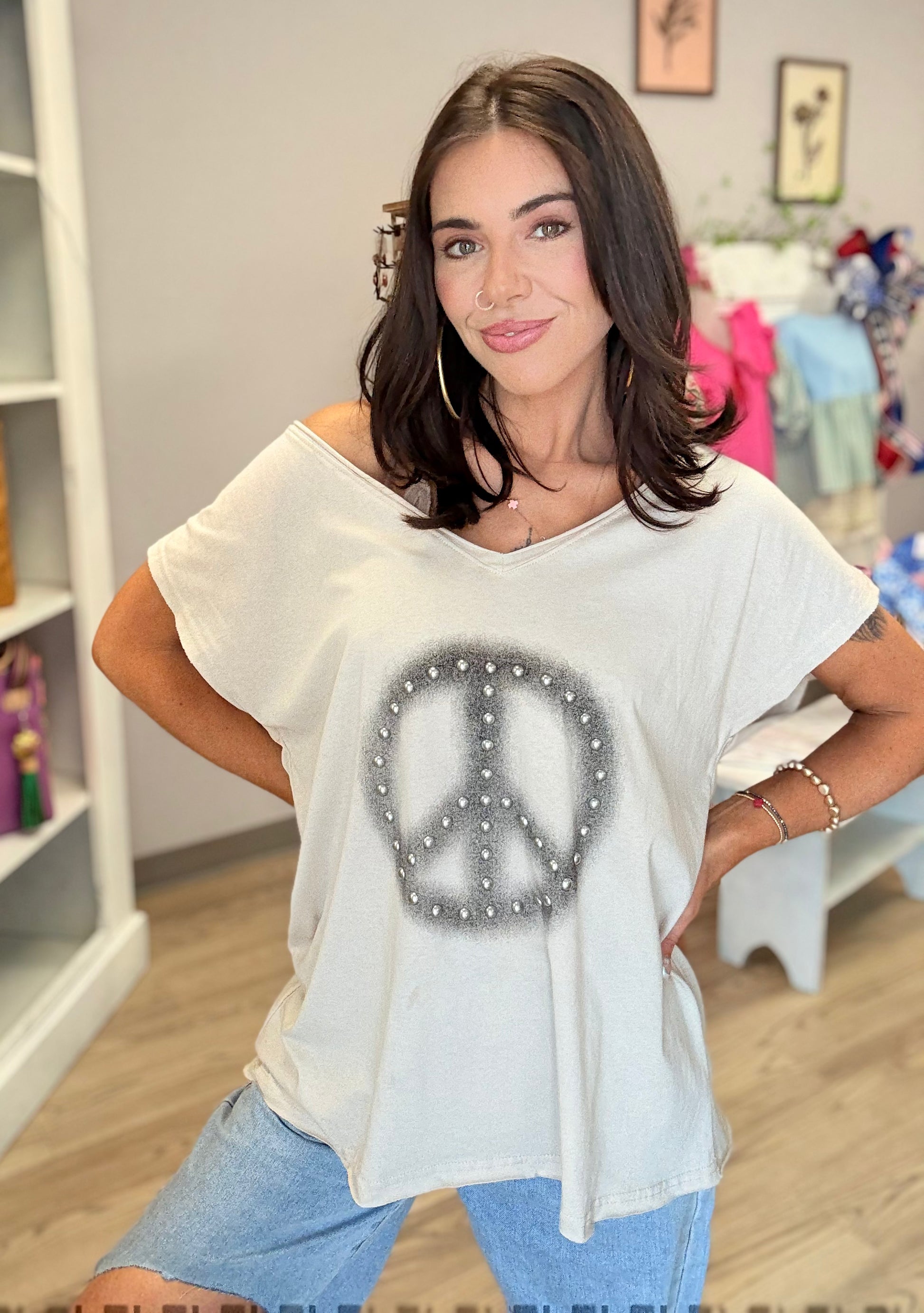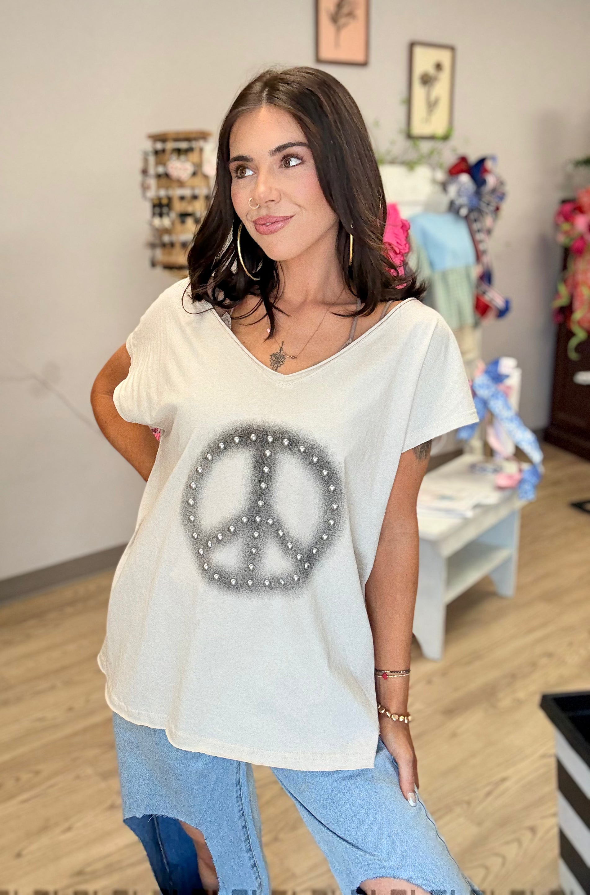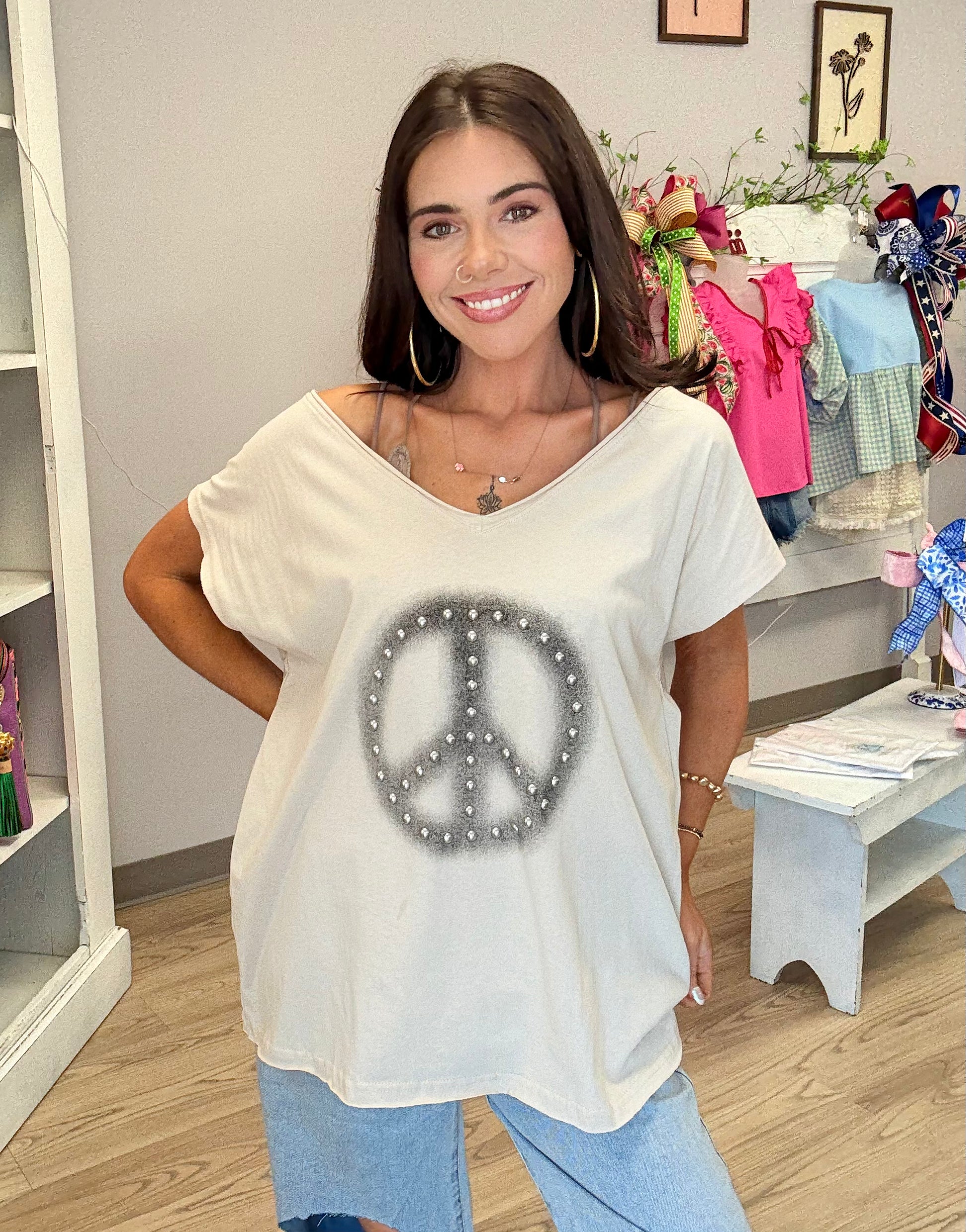 This oversized top features a studded peace sign and is made from 100% cotton. Can be sized down for a better fit. Perfect for making a statement while staying comfortable.
