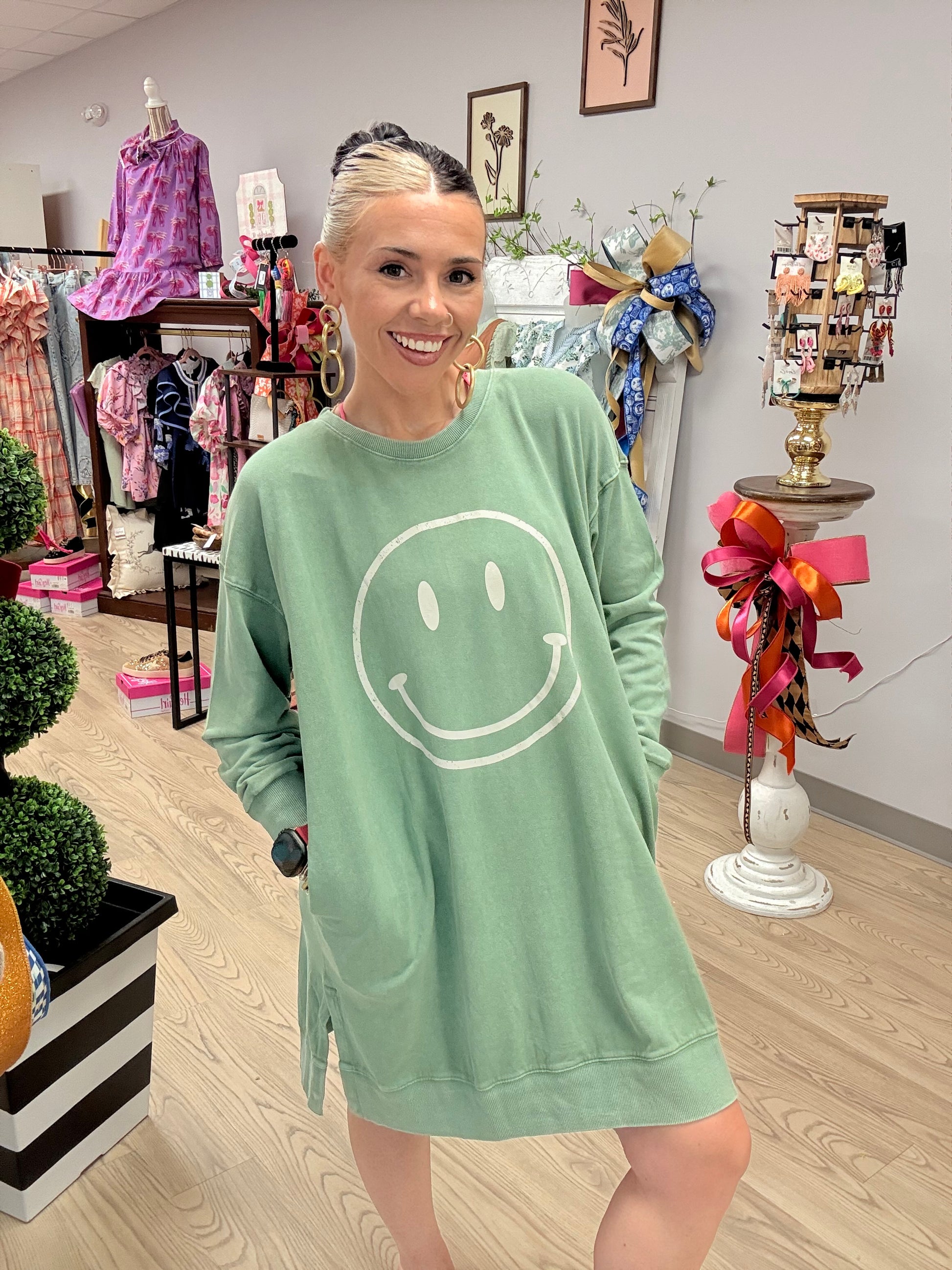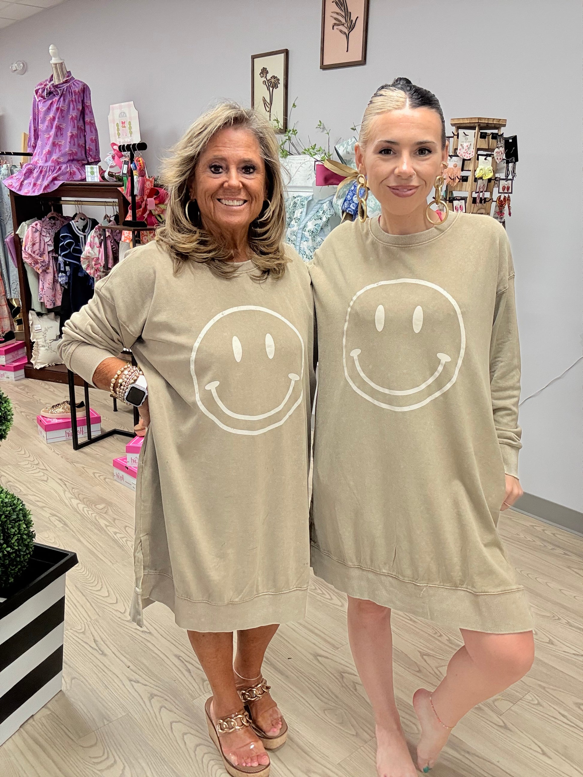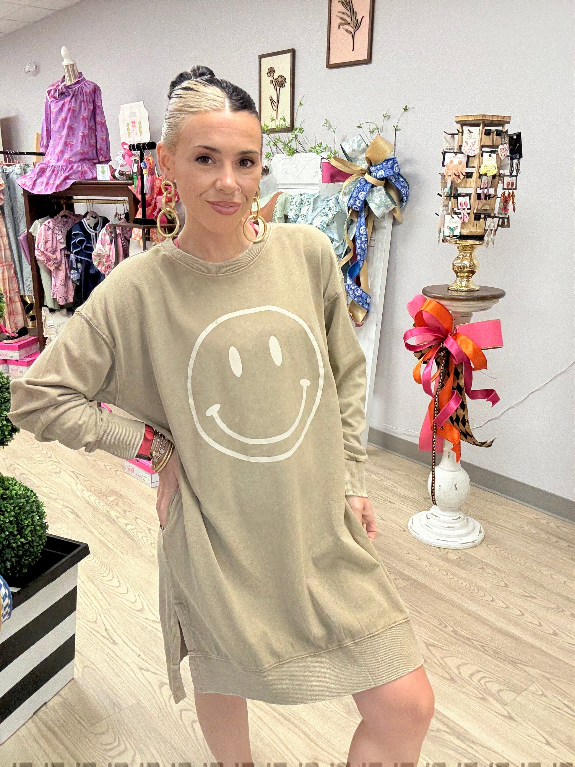 Crafted from 100% cotton, the Stylin' & Smilin' Tee Dress comes in both camel and green and features functional pockets, side slits, and a smiley face detail on the front. Stay comfortable and stylish in this oversized long sleeve dress.