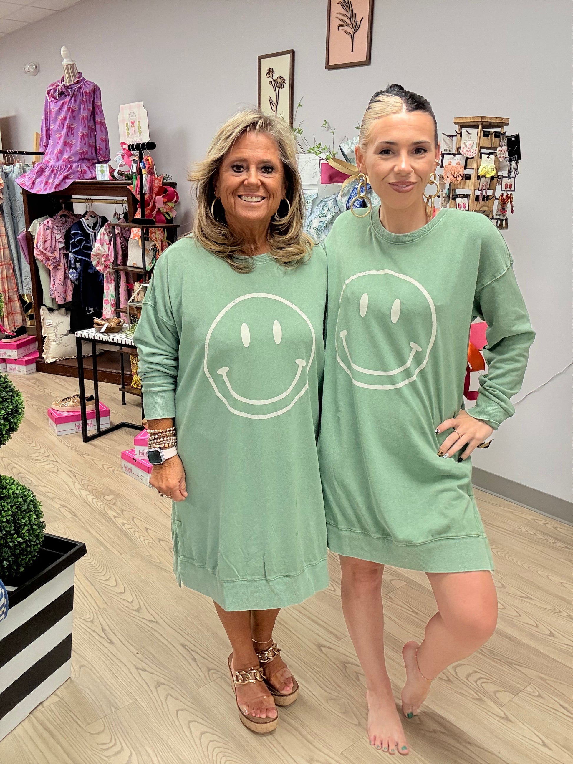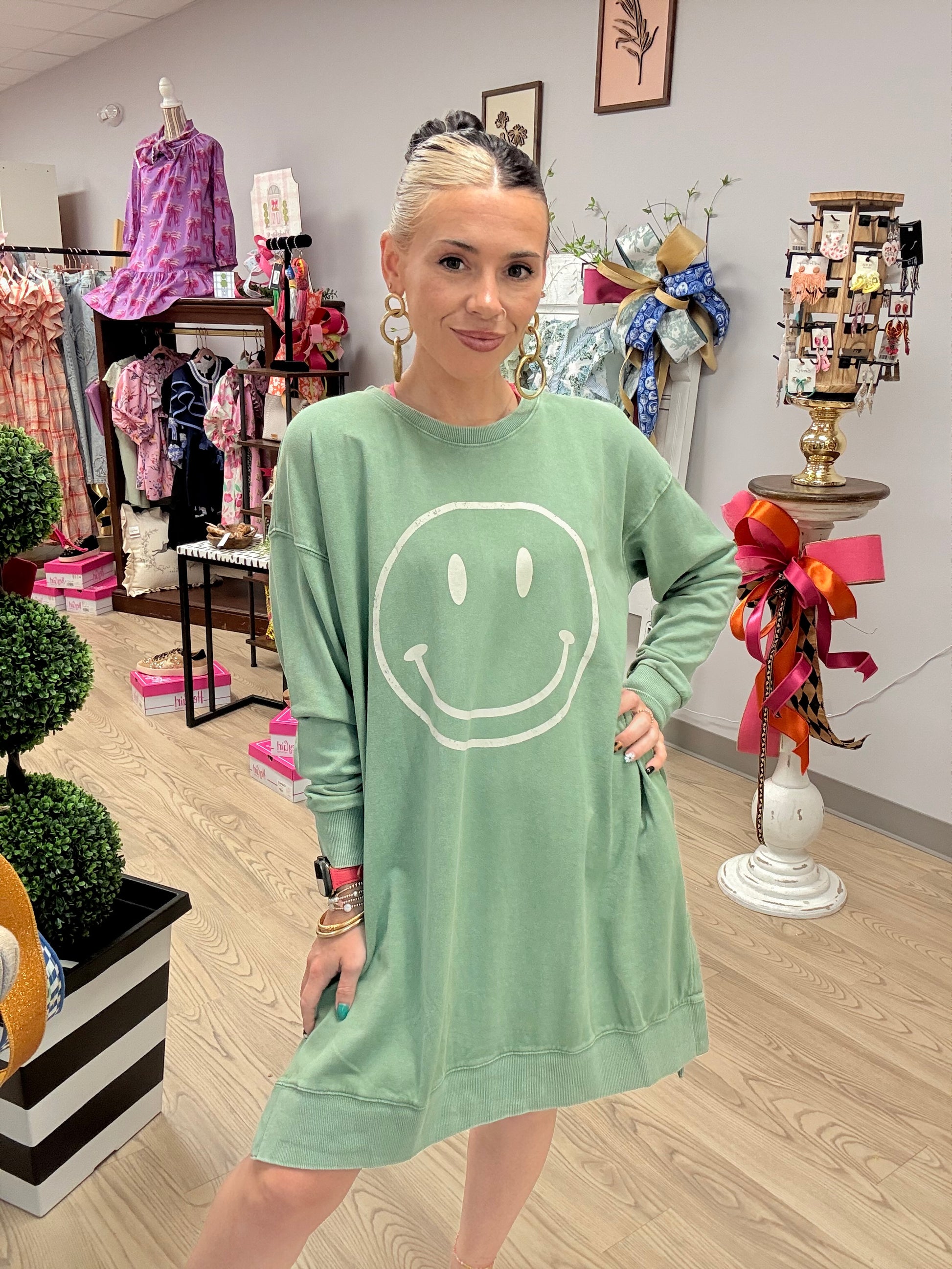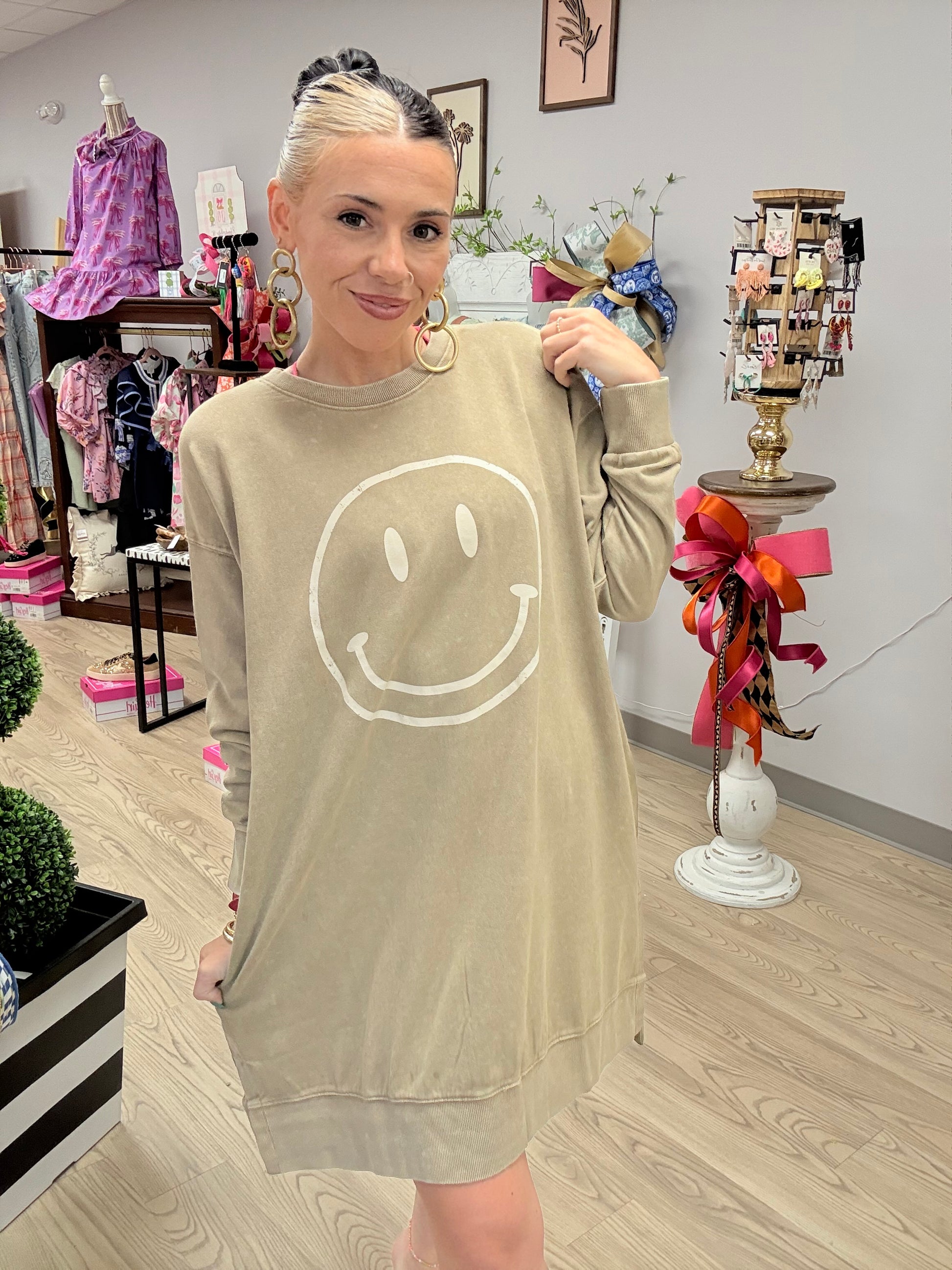 Crafted from 100% cotton, the Stylin' & Smilin' Tee Dress comes in both camel and green and features functional pockets, side slits, and a smiley face detail on the front. Stay comfortable and stylish in this oversized long sleeve dress.