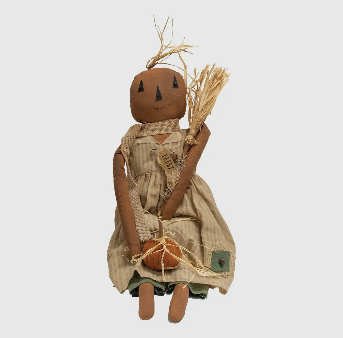 Tabby Pumpkin Doll is a stuffed doll with a weighted bottom and dark orange canvas fabric. Doll has a primitive tan cotton dress with green pants underneath and she has a burlap tie around her neck. Doll has black facial features with straw hair and she is carrying a straw broom and a stuffed orange pumpkin accented by a wooden stem and straw. Measures 29"high by9"wide by3" deep.