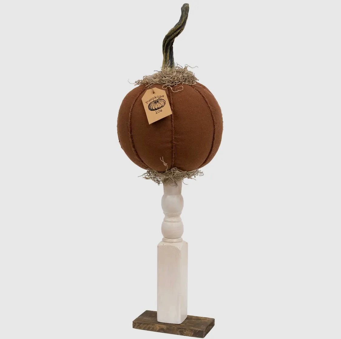 The Primitive Mossy Top Pumpkin on Pedestal makes a unique rustic addition to decorative Autumnal displays. The wooden pedestal features a white-painted pillar and a natural rustic base. A plush pumpkin with a dark orange fabric finish tops the pedestal. The pumpkin is accented by dark orange yarn, dried moss, and a rustic twisted stem. A brown paper tag is pinned to the pumpkin and reads, “pumpkins 10¢.” Measures 19.5” high. The pedestal base measures 4.5” wide by 2.5” deep, and the pumpkin measures 10” high by 5.5” in diameter.
