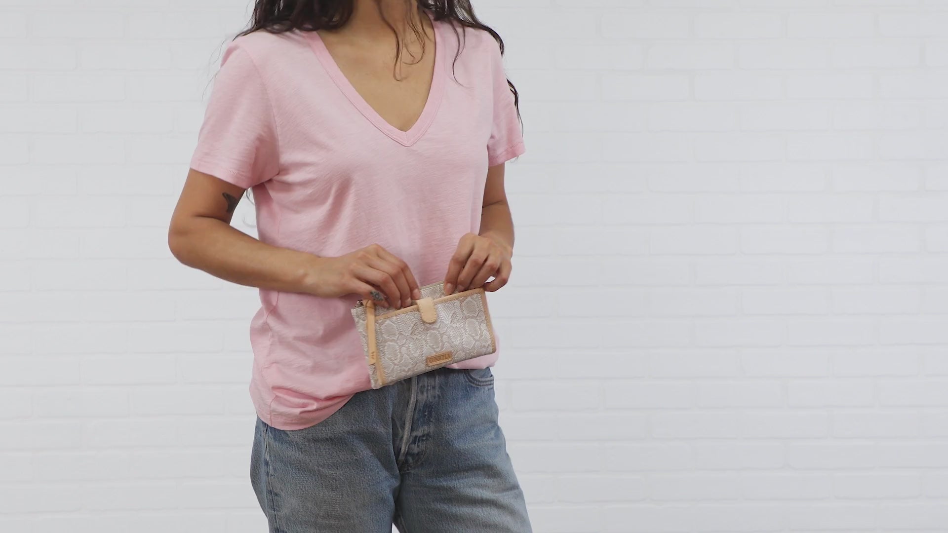 Features our Clay embossed snake print exterior with zip side pocket