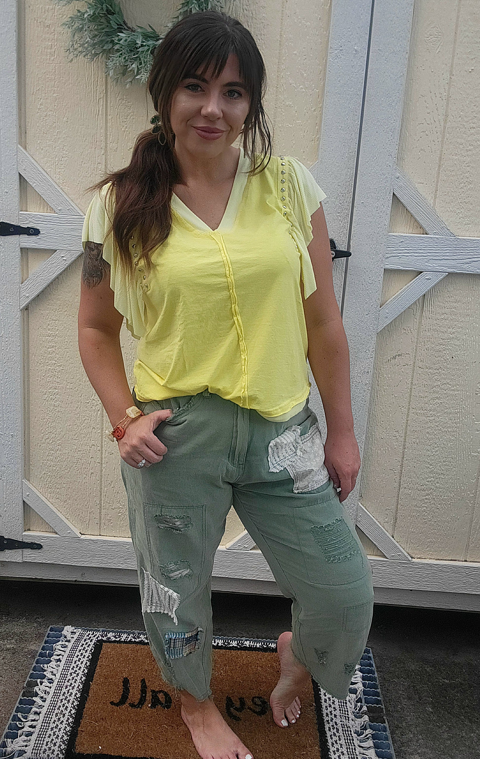 Patchwork Denim is the perfect choice for a fashionable, comfortable look. The sage green high waist jeans feature unique distressed details and a patchwork fabric, making them stand out from other jeans. With true-to-size fit, you can have the perfect denim look.