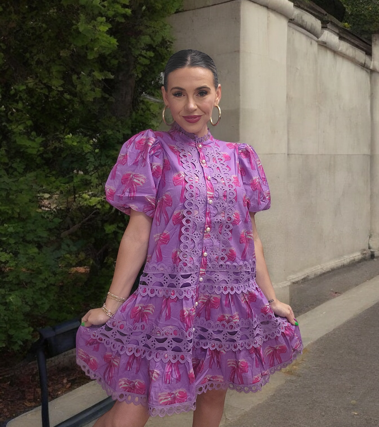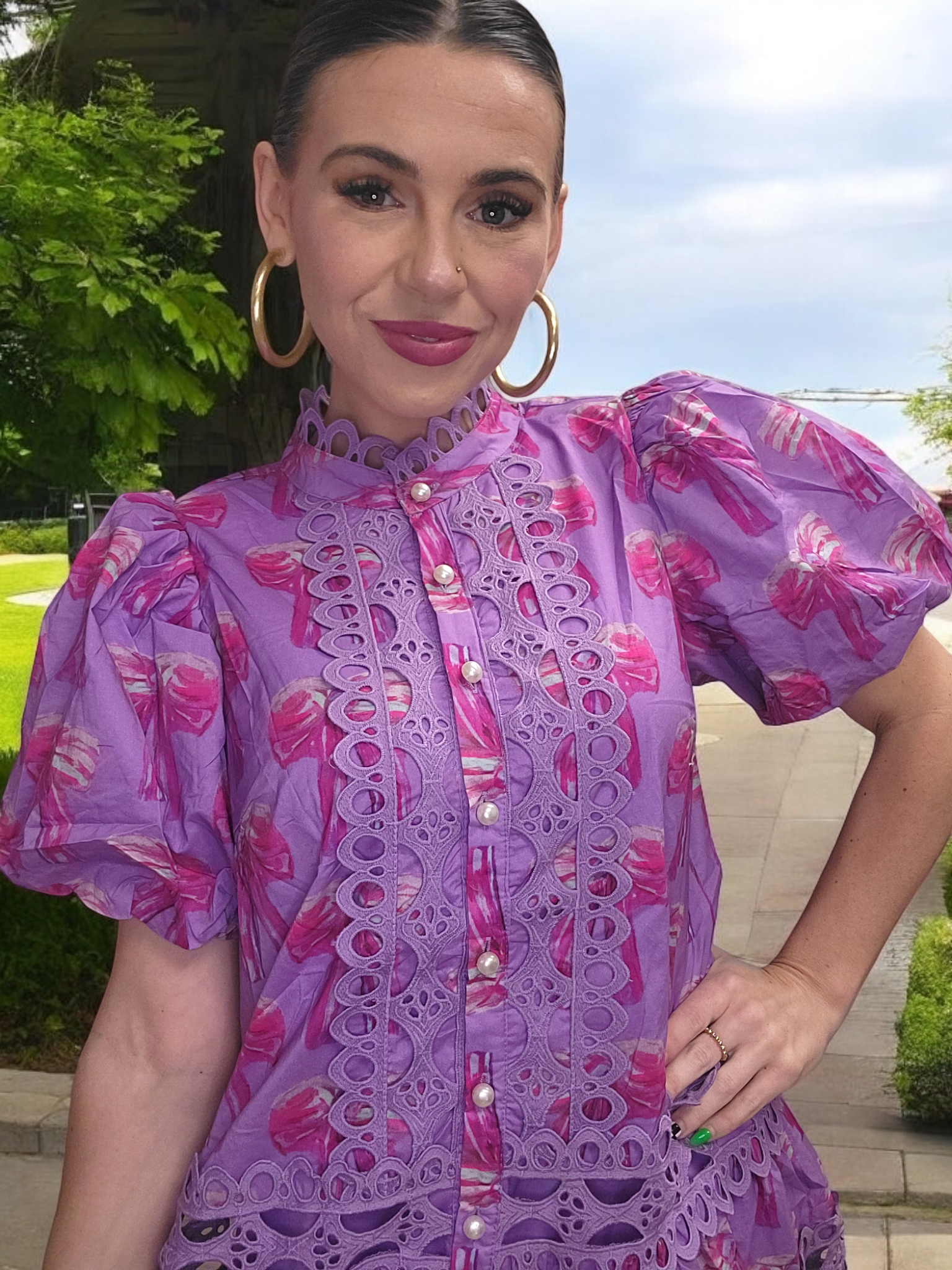 The Beyond Beautiful Bow Dress exudes femininity and elegance with its delicate pink bows and soft lavender color. The pearl button down front and lace neckline add a touch of sophistication, while the tiered design and puff sleeves create a playful silhouette. Crafted with 100% cotton, this dress is not only stylish but also comfortable. True to size fit ensures a flattering look!